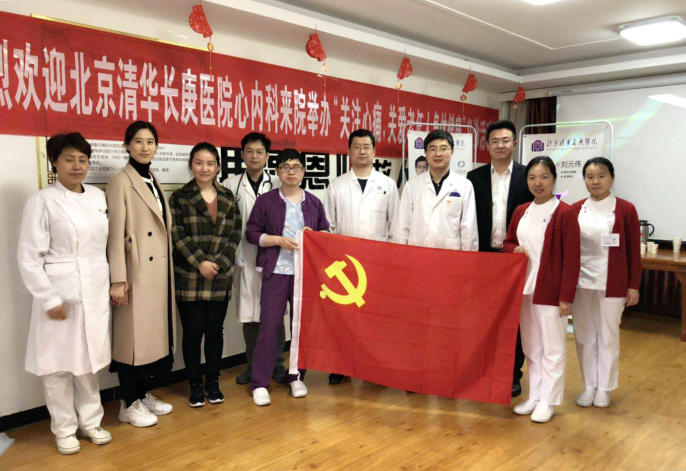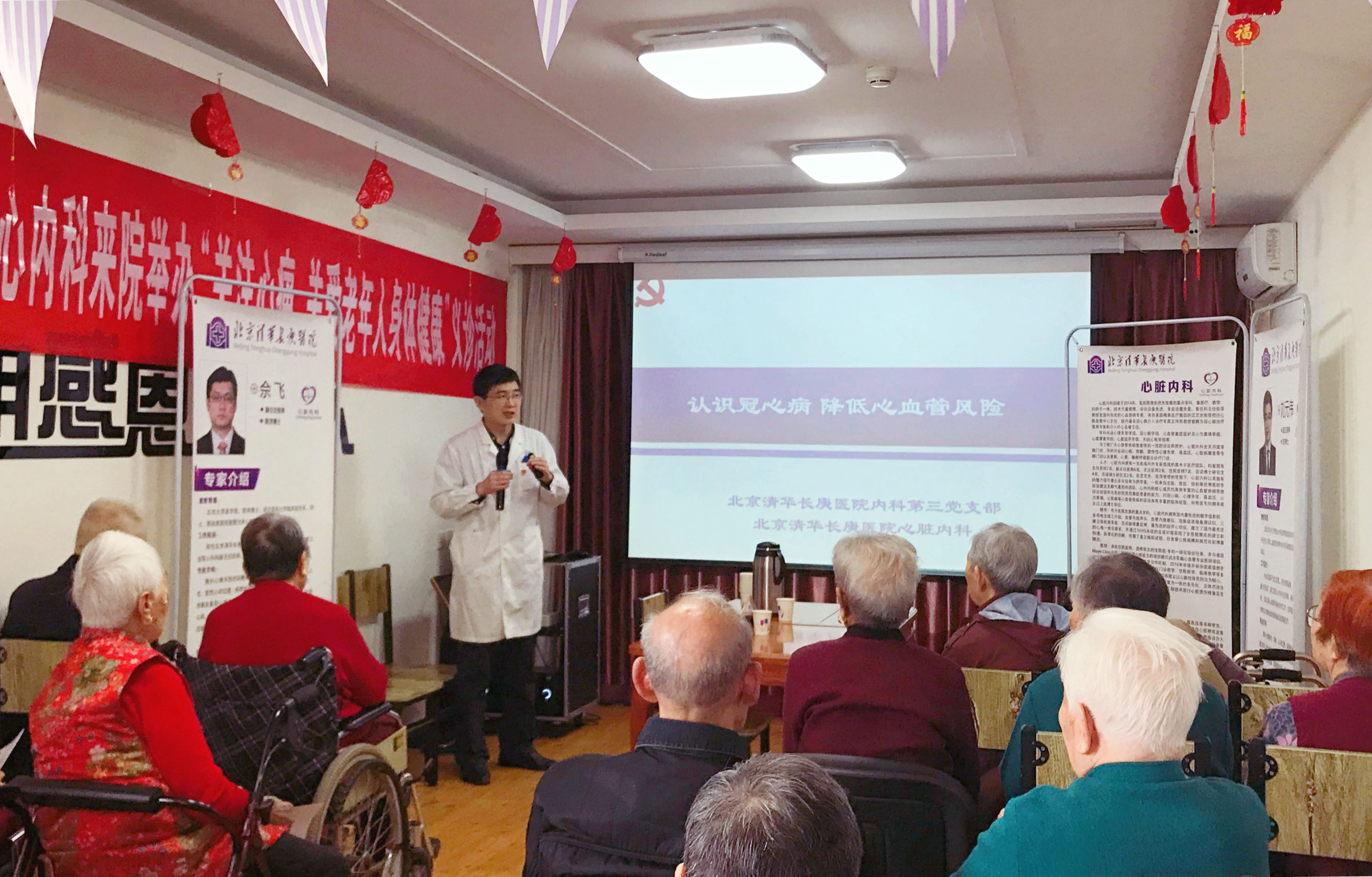 此前3月,刘元伟同志在天通苑养老院作了“认识冠心病 降低心血管风险”的科普讲座。他全面介绍和分享了心血管疾病的科普知识、日常预防贴士、突发情况的急救处理等。讲座结束后,刘元伟副主任医师与佘飞副主任医师、张鸥主治医师为养老院的老人们解答了疾病相关知识,王文、石晨燕护士长及支部宣传委员刘娅积极为大家测血糖、测血压,并发放了心脏内科制作的疾病健康手册。