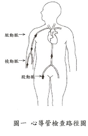 心导管检查是将一条长约100-150公分之不透光导管以打针的方式,从病人大腿鼠蹊部的股动脉或手臂的桡动脉血管插入,沿着血管到达心脏各腔室及大血管进行摄影检查,过程中需注射显影药物,且透过X光照相取得清晰之影像,可观察及确定是否有心脏或冠状动脉疾病,整个检查时间约40分钟至2小时(图一)。