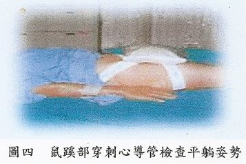 (1)检查后返回病房,再拔除伤口处的塑料导管鞘后,需平躺4小时及卧床休息2小时,且于腹股沟穿刺部位需使用2公斤砂袋在伤口加压,以避免流血或血肿。穿刺部位的肢体要伸直,勿随意弯曲,以免砂袋未完全压住穿刺伤口,而引起流血、血肿块等合并症(图四)。