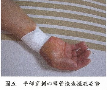 (1)检查后穿刺部位会以纱卷及无切胶带直接加压止血2小时,此时勿过度屈曲或伸展手腕,以避免出血及血肿发生(图五);若病人手部出现麻刺感、冰冷、颜色发绀或肿胀时,请立即告知医护人员。
