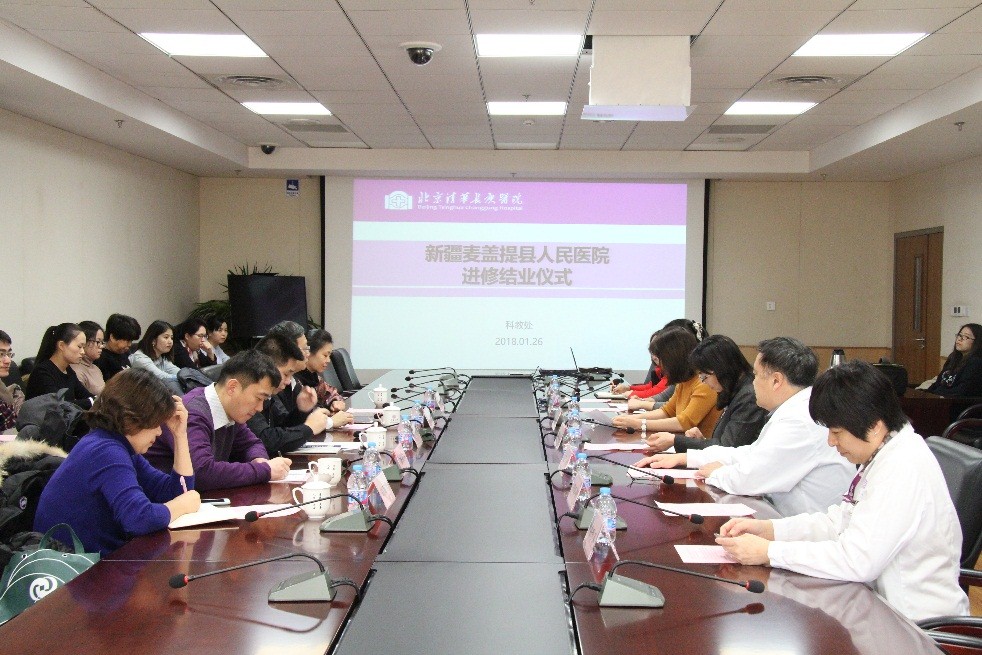 北京清华长庚医院1月26日电(通讯员 李牧)2018年1月26日上午,新疆麦盖提县人民医院在北京清华长庚医院进修学习的第三期学员圆满结业。中国证监会办公厅副主任曾彤,同方股份有限公司党委副书记张永路,清华长庚医院党委书记周月红、副院长王劲等出席了在清华长庚医院举办的进修结业仪式。仪式由清华长庚医院总执行长助理、科教处处长王克霞主持。