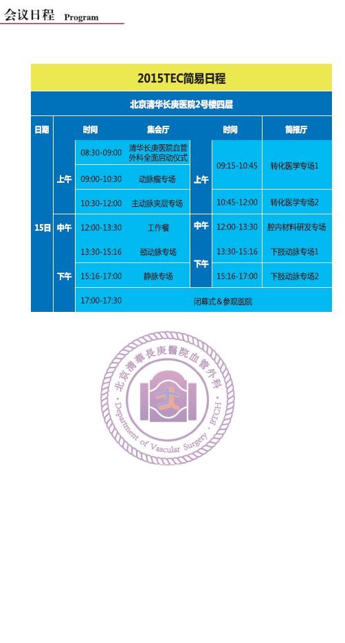 TEC寓意Technology,既体现血管疾病诊治过程中的微妙技巧,也体现依托清华大学雄厚理工科基础发展血管转化医学的理念。本次会议将立题于血管外科临床治疗及基础研究中的热点问题,重点突出精准医疗,多学科联合及转化医学等目前医疗事业发展的前沿方向。届时将会有国内血管外科界顶尖专家就主动脉、颈动脉、下肢动脉及静脉疾病等大家关注的问题进行深入的探讨,同时还会有其它学科及清华大学相关专业专家做精彩演讲,参会代表将获得国家级继续医学教育I类学分。
