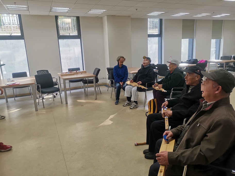 伴随着《欢迎曲》的响起,大家拨动着手里的琴弦,在社工的带领下有节奏的开始音乐演奏。《军港之夜》、《社会主义好》、《中国人民志愿军战歌》……叔叔阿姨年轻时唱过的老歌唤醒沉睡的记忆,他们高声的唱歌、开心的弹奏,共同分享着时代的回忆。