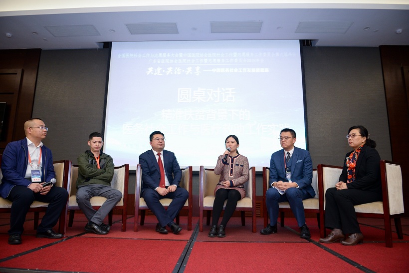 在随后的进行的圆桌对话环节,我院社会服务专人受邀,与山东省立医院、中山大学附属第六医院、中山大学社会学与人类学学院、北京微爱公益基金会四家同侪单位的代表,共同探讨“精准扶贫背景下的医院医疗救助工作实践”,现场提问积极、反响热烈。