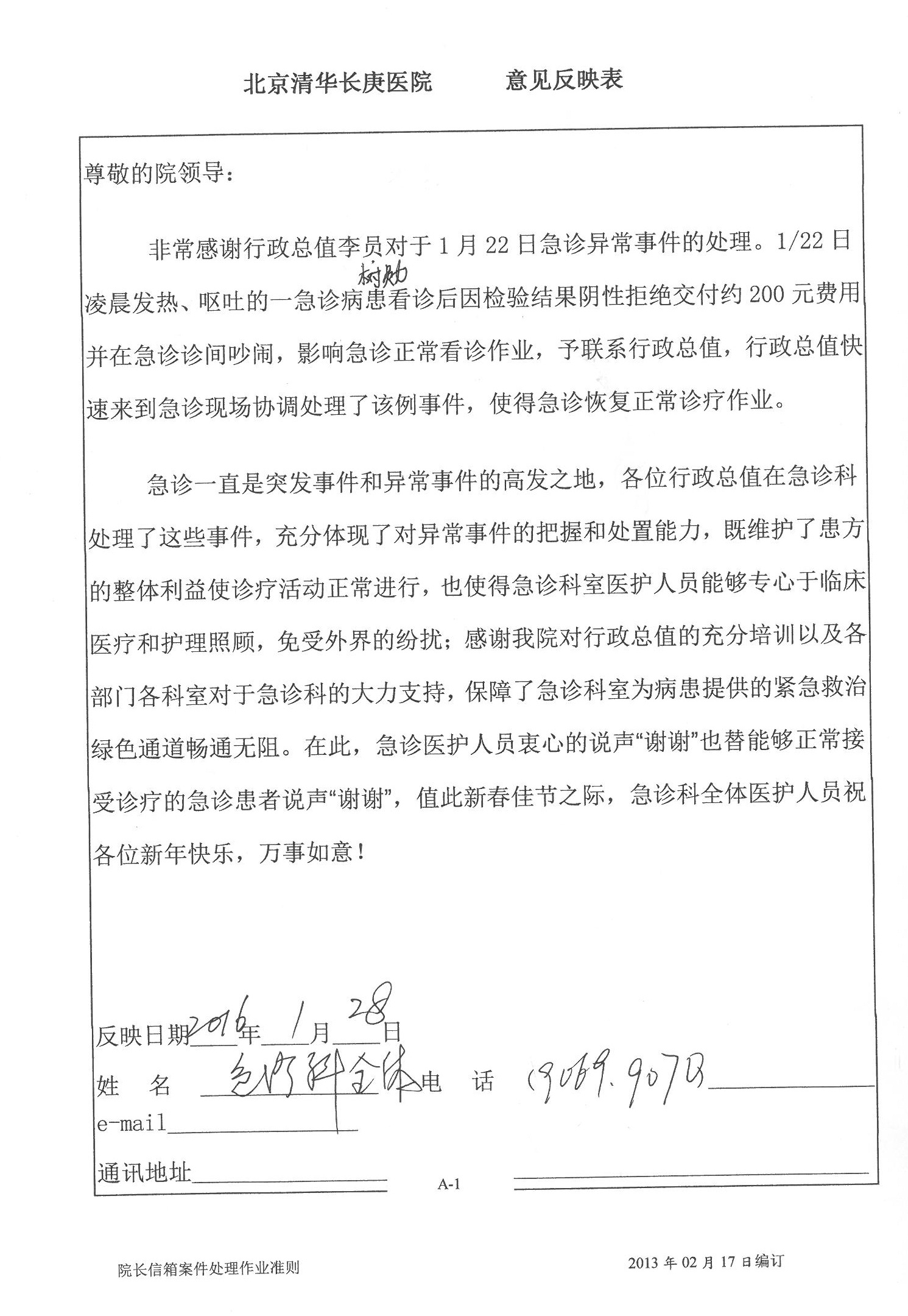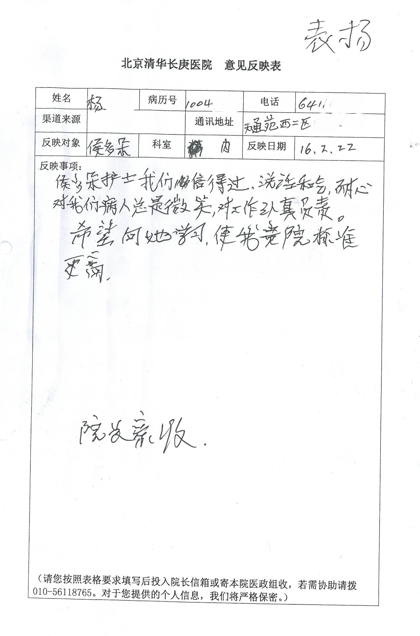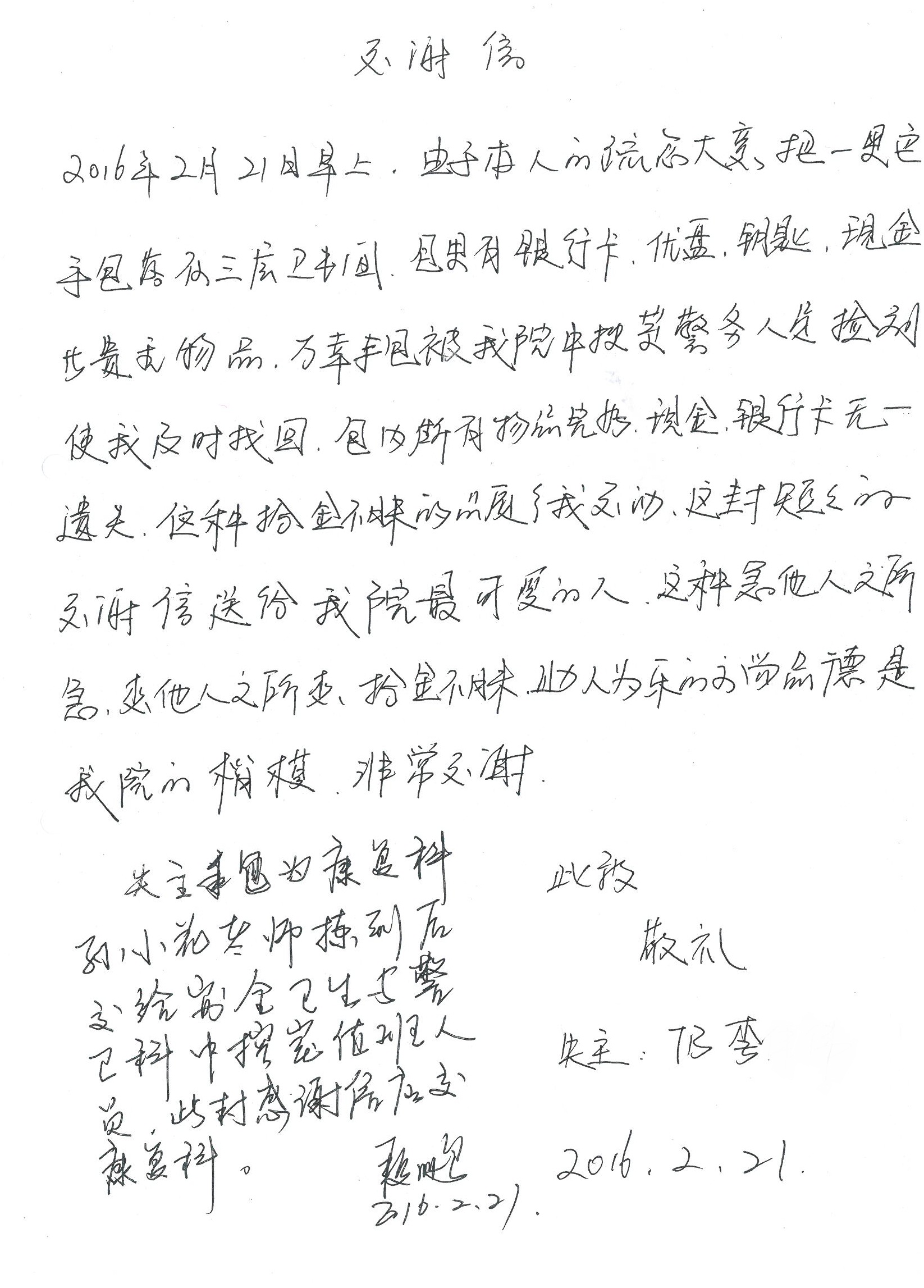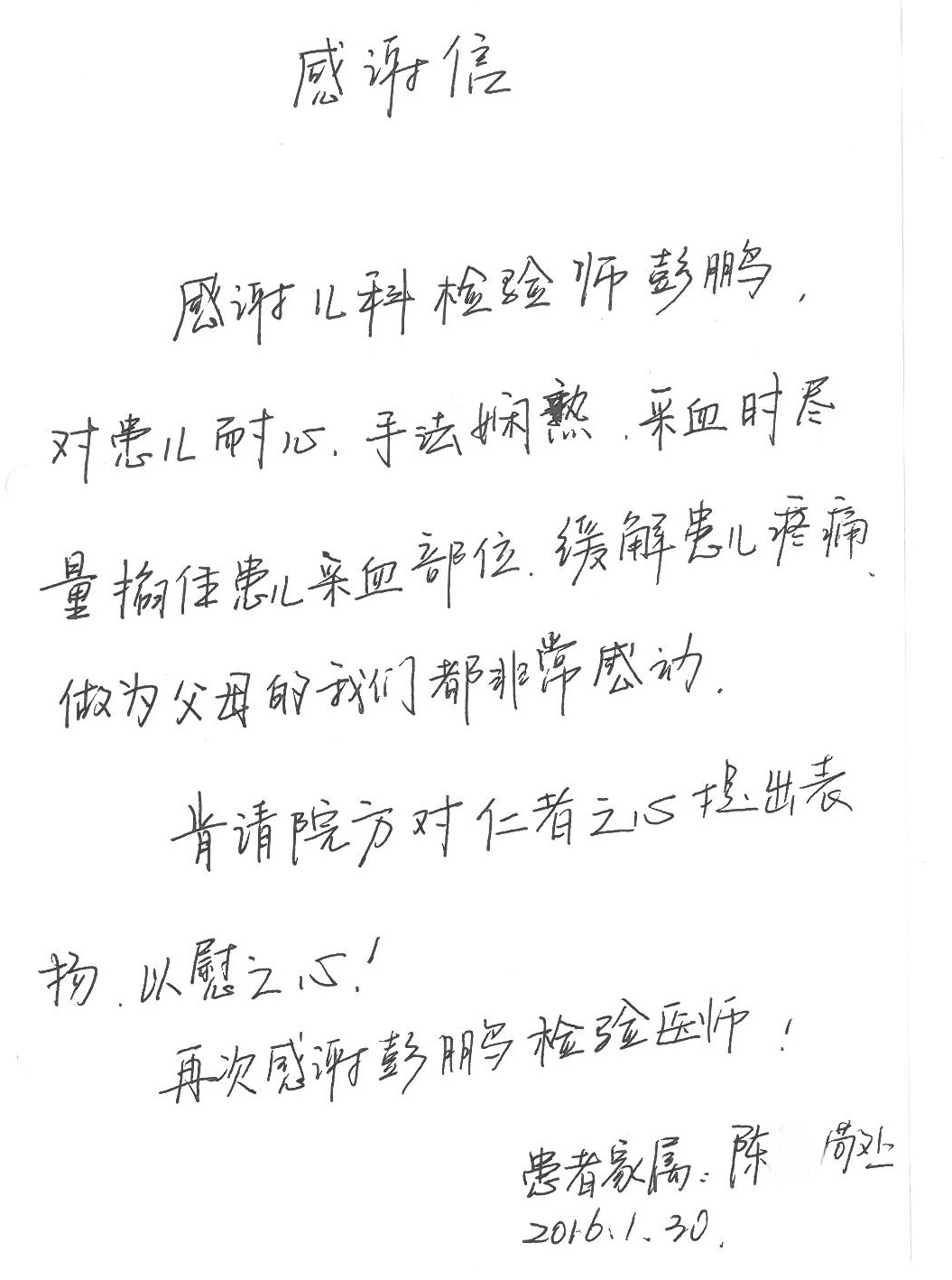 2016年2月,我院共接到患者及家属感谢信29封,其中骨科陈连旭副主任医师、宋飞主治医师、付立功医师、容威医师、孙长鲛医师、赵传多医师,神经外科王贵怀主任、郭毅副主任医师,整形外科张家宁部长,内脏内科张萍部长、缪国斌副主任医师、佘飞副主任医师、薛亚军主治医师、王昊天医师、湛琦医师、郭晓媚医师,肾脏内科李月红主任、庄震主治医师、王炜主治医师、吕佳璇医师、李锟医师,呼吸内科王立万主任、蔡存良主治医师、张晋则医师,消化内科任渝棠医师,妇产科黄振宇副主任医师、张蕾副主任医师、吕涛主治医师、王奔医师、尚梦远医师、文佳医师、陈锐医师,儿科晁爽主任、季丽娜副主任医师、李然主治医师,眼科胡运韬主任、耳鼻咽喉头颈外科叶京英主任,麻醉科俞晨副主任医师、刘芳主治医师,康复科孙小花技师,检验科彭鹏技士,工务仪器处李树勋,护理部肖江彬、李亚灵、郭莹莹、李维维、李骏、杨静、樊景春、黄帅、侯多朵、崇薇,天晟昱公司董师傅、王师傅及心脏内科、骨科、急诊科、耳鼻喉科、血管外科、呼吸科、CCU全体人员收到具名表扬。特此公告,以资鼓励!