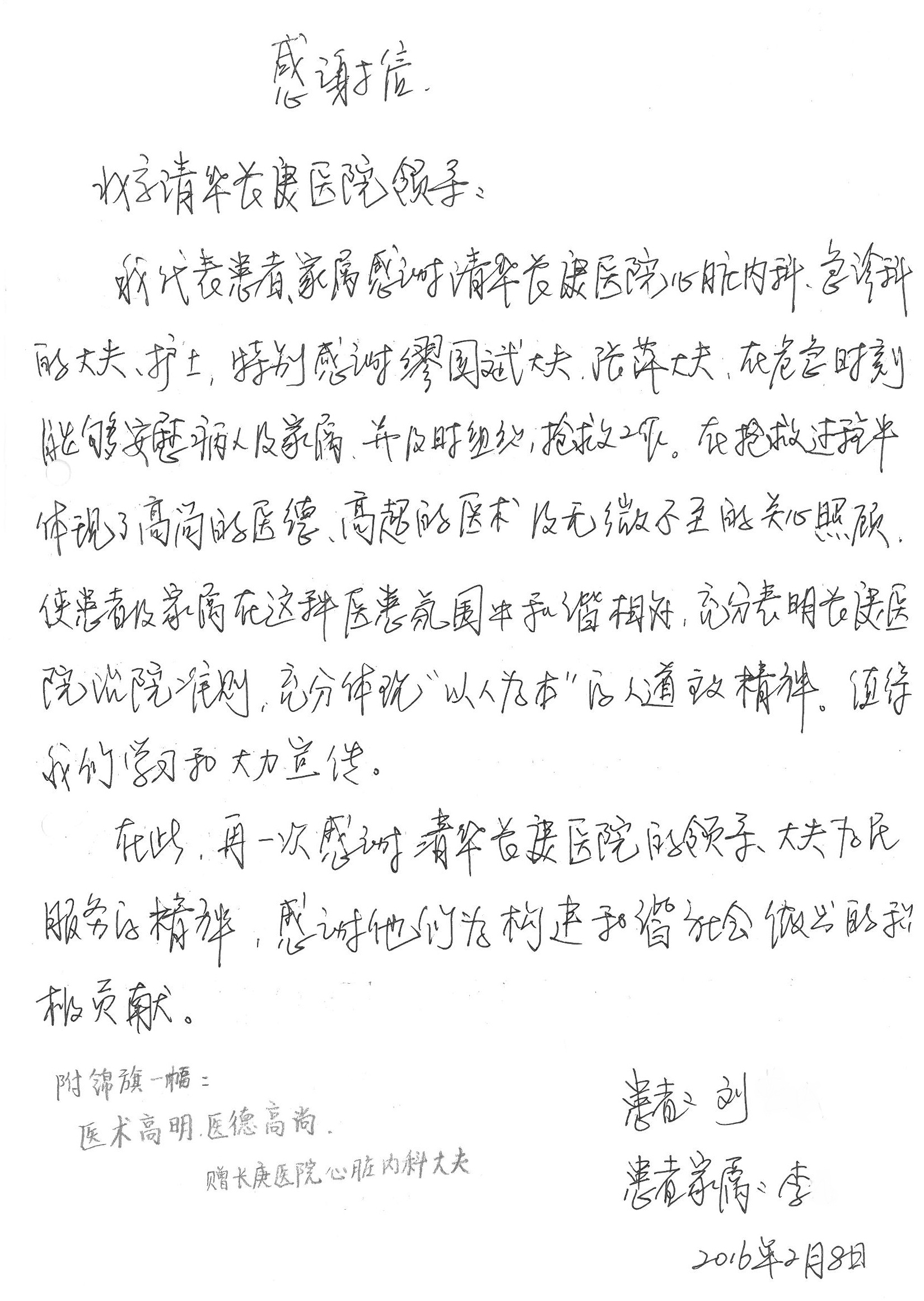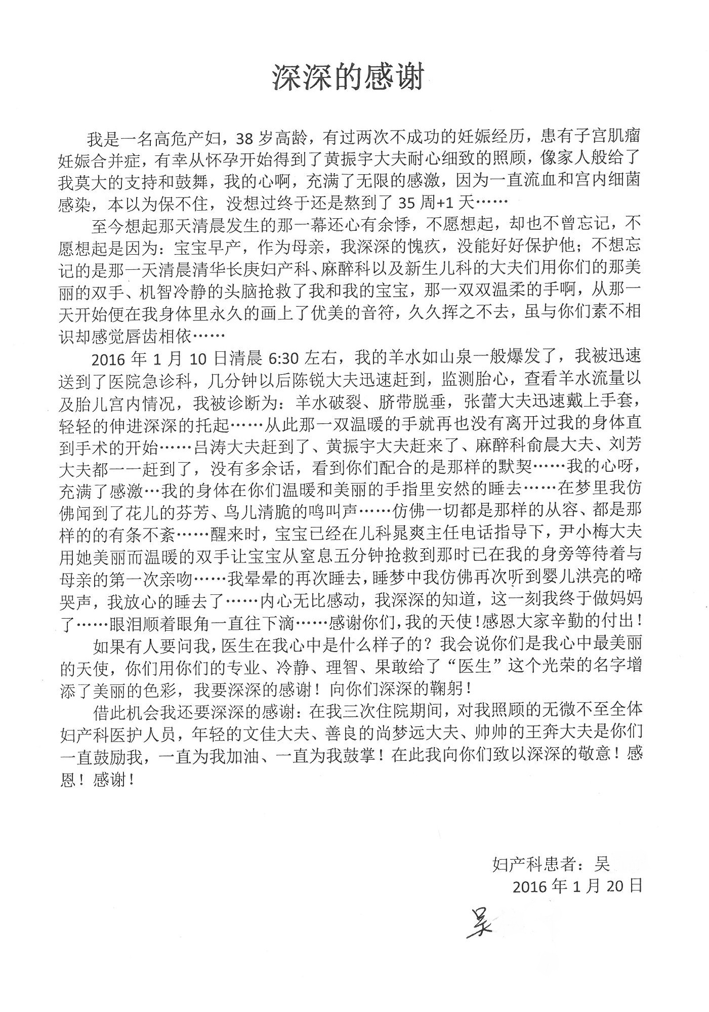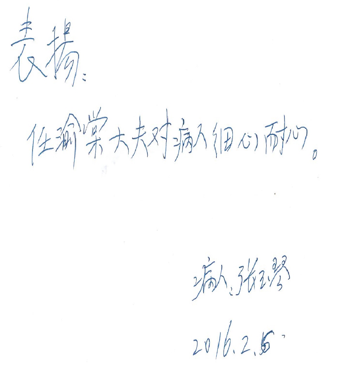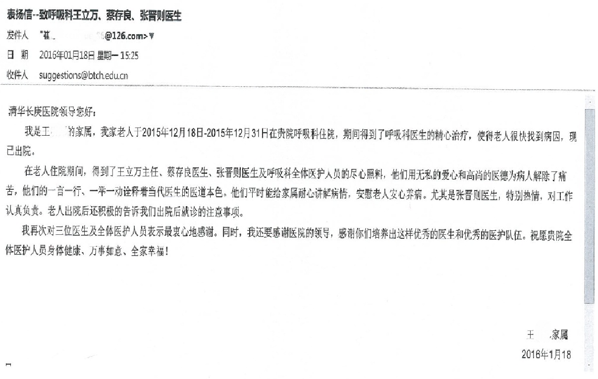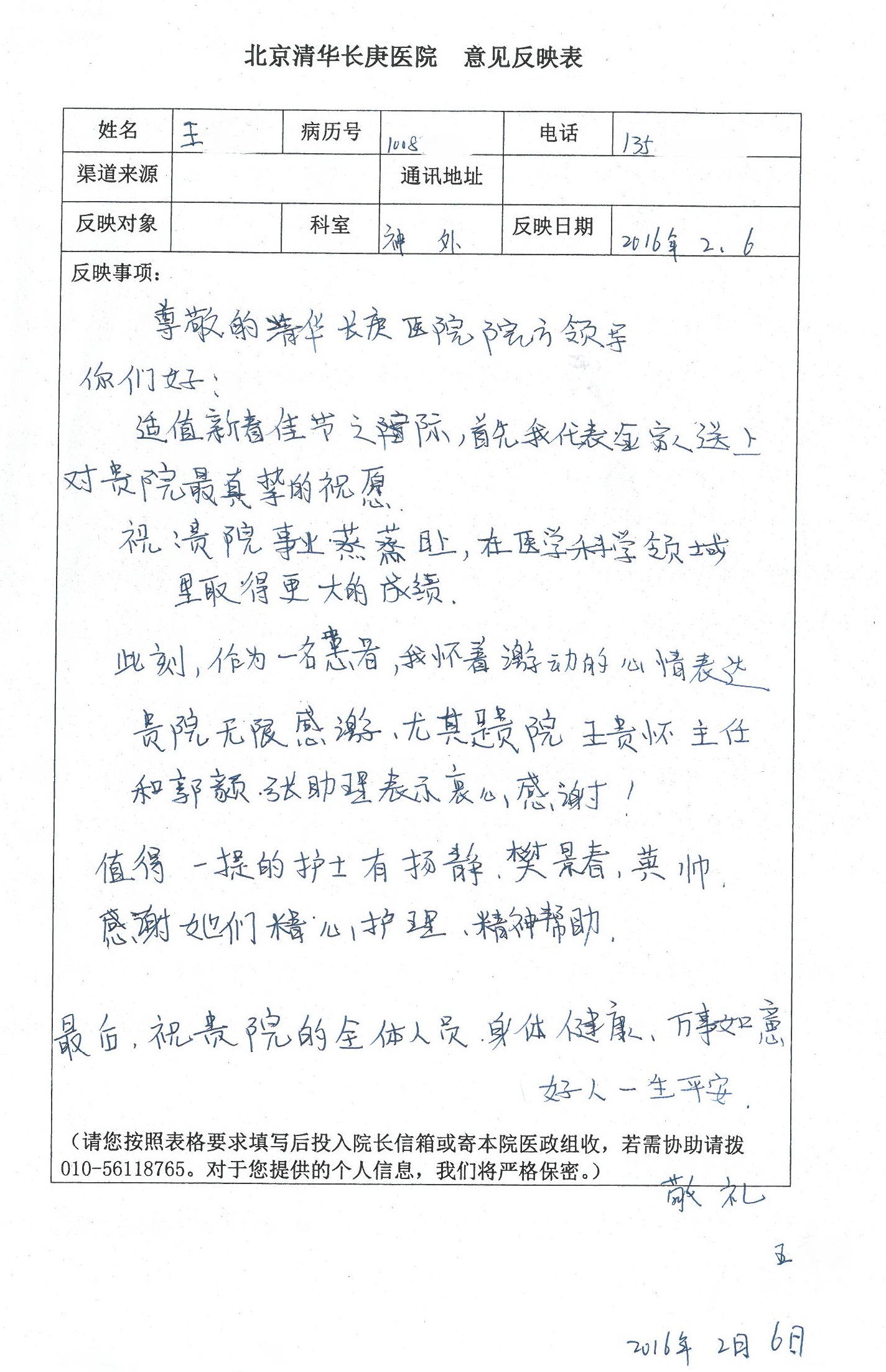 2016年2月,我院共接到患者及家属感谢信29封,其中骨科陈连旭副主任医师、宋飞主治医师、付立功医师、容威医师、孙长鲛医师、赵传多医师,神经外科王贵怀主任、郭毅副主任医师,整形外科张家宁部长,内脏内科张萍部长、缪国斌副主任医师、佘飞副主任医师、薛亚军主治医师、王昊天医师、湛琦医师、郭晓媚医师,肾脏内科李月红主任、庄震主治医师、王炜主治医师、吕佳璇医师、李锟医师,呼吸内科王立万主任、蔡存良主治医师、张晋则医师,消化内科任渝棠医师,妇产科黄振宇副主任医师、张蕾副主任医师、吕涛主治医师、王奔医师、尚梦远医师、文佳医师、陈锐医师,儿科晁爽主任、季丽娜副主任医师、李然主治医师,眼科胡运韬主任、耳鼻咽喉头颈外科叶京英主任,麻醉科俞晨副主任医师、刘芳主治医师,康复科孙小花技师,检验科彭鹏技士,工务仪器处李树勋,护理部肖江彬、李亚灵、郭莹莹、李维维、李骏、杨静、樊景春、黄帅、侯多朵、崇薇,天晟昱公司董师傅、王师傅及心脏内科、骨科、急诊科、耳鼻喉科、血管外科、呼吸科、CCU全体人员收到具名表扬。特此公告,以资鼓励!
