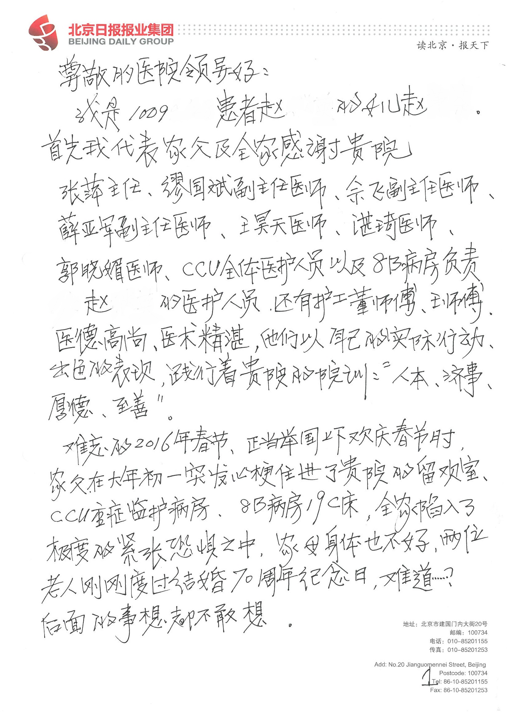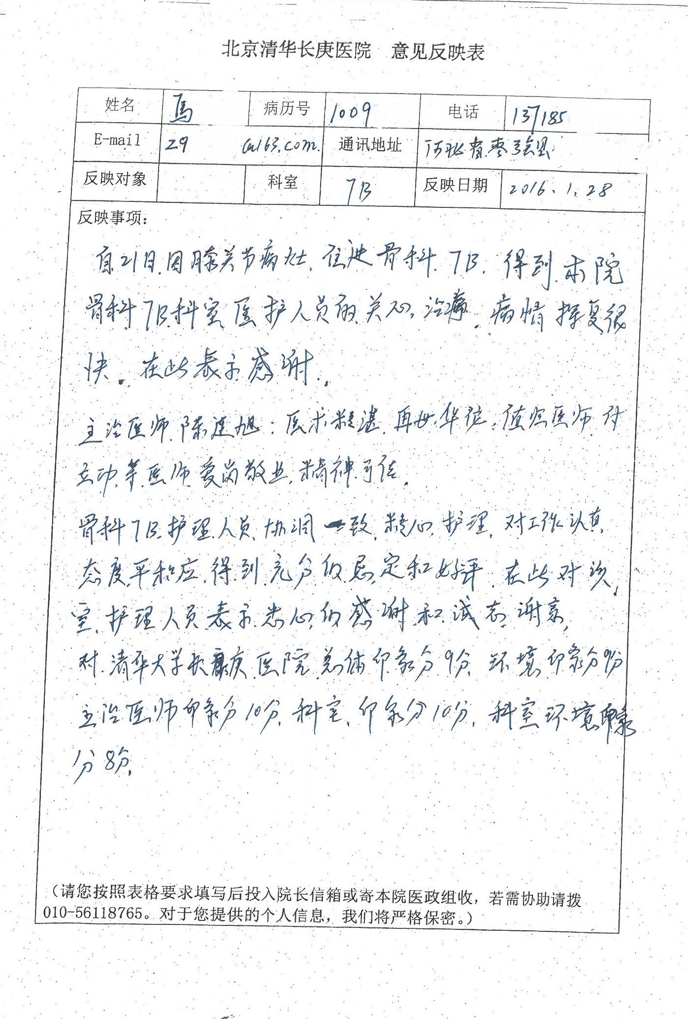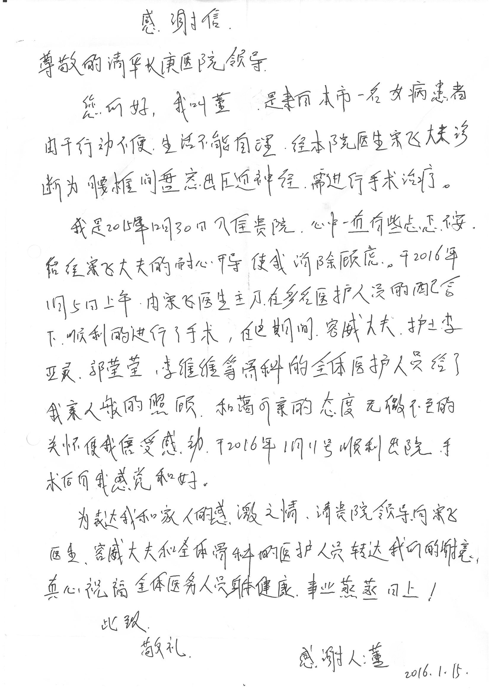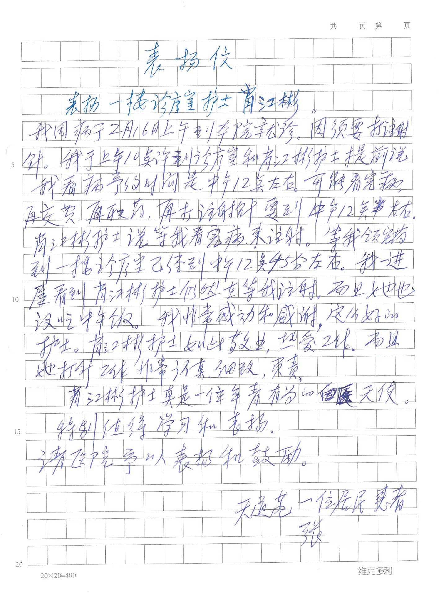 2016年2月,我院共接到患者及家属感谢信29封,其中骨科陈连旭副主任医师、宋飞主治医师、付立功医师、容威医师、孙长鲛医师、赵传多医师,神经外科王贵怀主任、郭毅副主任医师,整形外科张家宁部长,内脏内科张萍部长、缪国斌副主任医师、佘飞副主任医师、薛亚军主治医师、王昊天医师、湛琦医师、郭晓媚医师,肾脏内科李月红主任、庄震主治医师、王炜主治医师、吕佳璇医师、李锟医师,呼吸内科王立万主任、蔡存良主治医师、张晋则医师,消化内科任渝棠医师,妇产科黄振宇副主任医师、张蕾副主任医师、吕涛主治医师、王奔医师、尚梦远医师、文佳医师、陈锐医师,儿科晁爽主任、季丽娜副主任医师、李然主治医师,眼科胡运韬主任、耳鼻咽喉头颈外科叶京英主任,麻醉科俞晨副主任医师、刘芳主治医师,康复科孙小花技师,检验科彭鹏技士,工务仪器处李树勋,护理部肖江彬、李亚灵、郭莹莹、李维维、李骏、杨静、樊景春、黄帅、侯多朵、崇薇,天晟昱公司董师傅、王师傅及心脏内科、骨科、急诊科、耳鼻喉科、血管外科、呼吸科、CCU全体人员收到具名表扬。特此公告,以资鼓励!