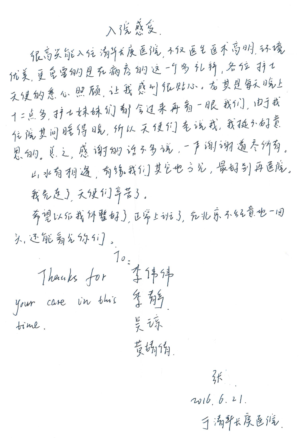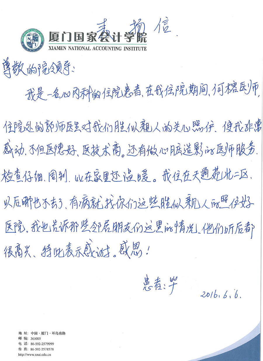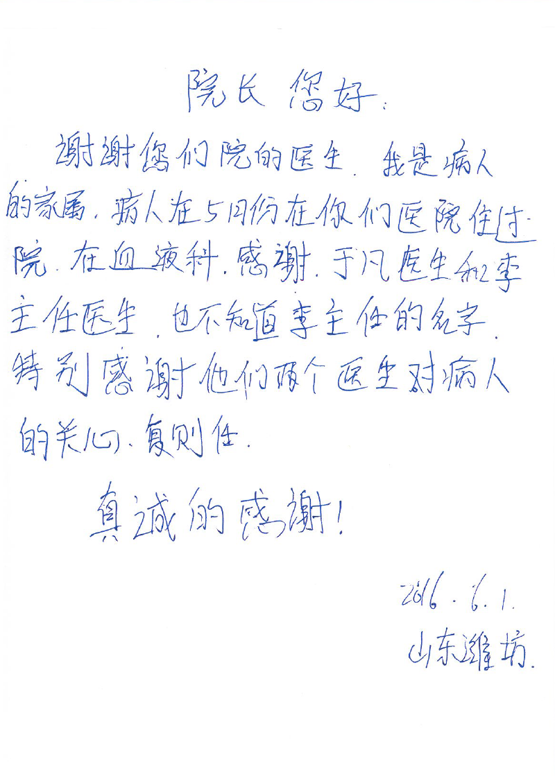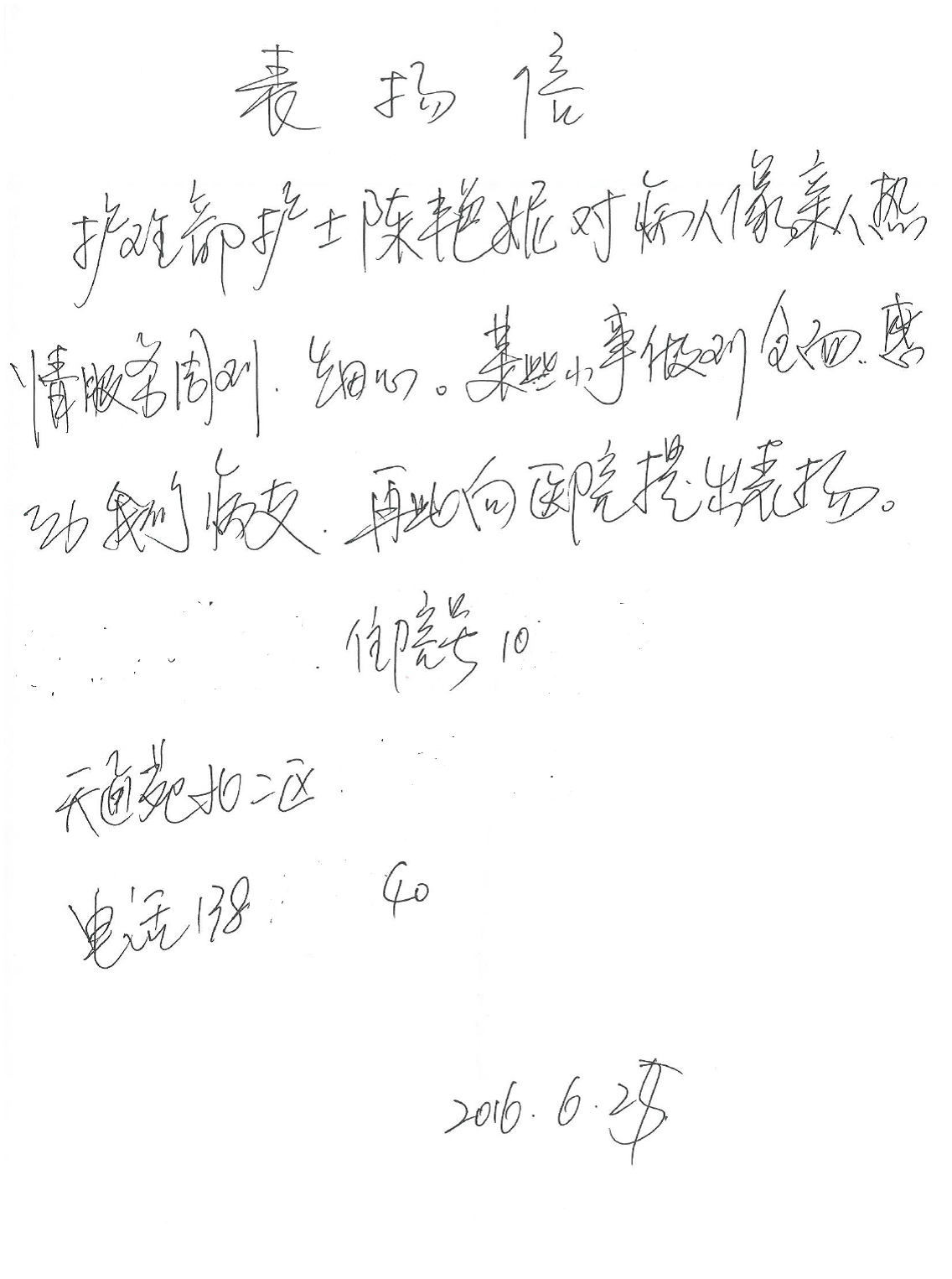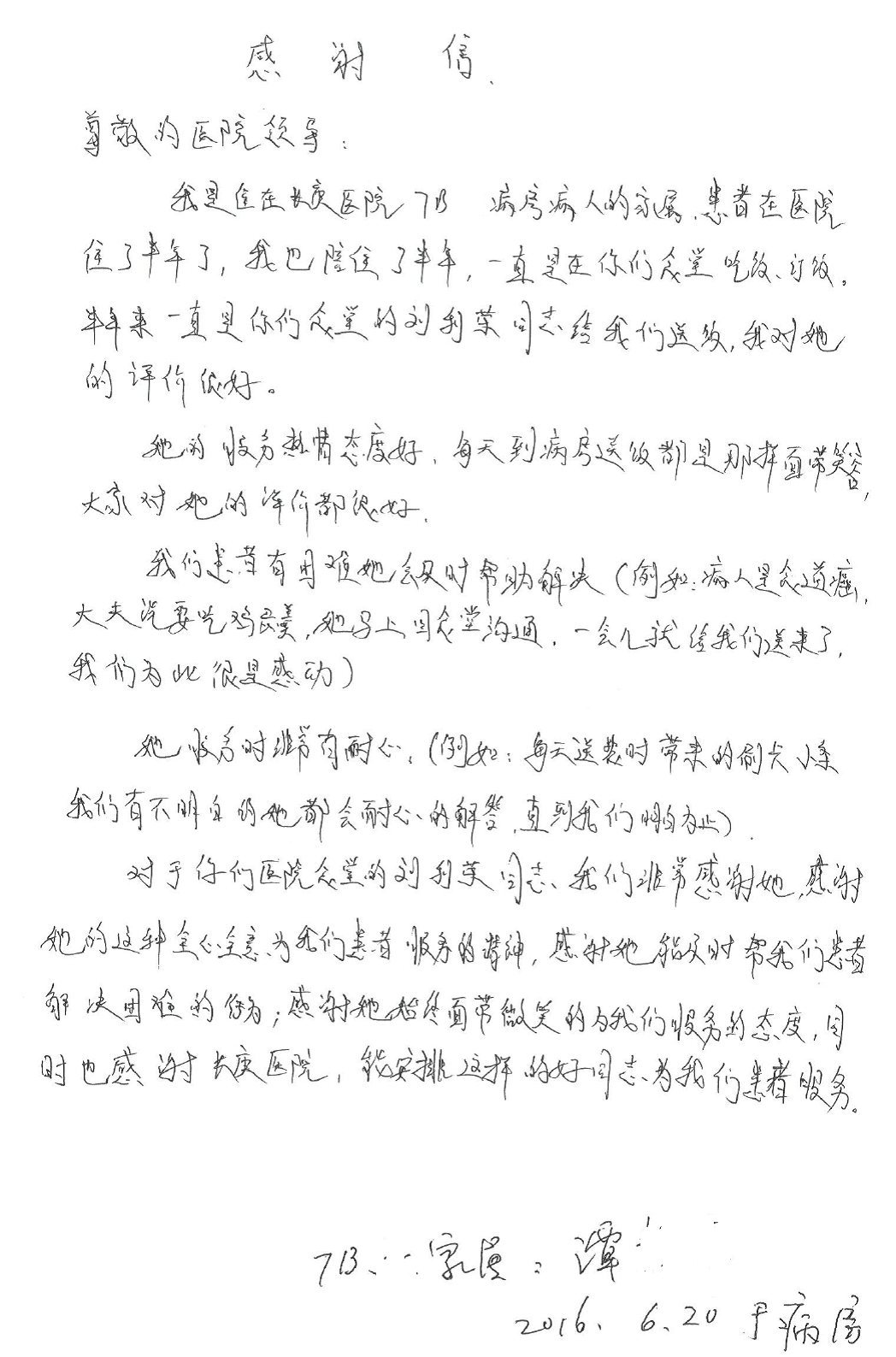 2016年6月,我院共接到患者及家属感谢信32封,其中肝胆胰外科董家鸿主任医师、韩东冬副主任医师、汤睿医师,神经外科张培海医师、刘东康医师,骨科潘勇卫主任医师、蔡谞主任医师、陈连旭副主任医师、邓玖征医师、容威医师、孙长鲛医师,血管外科吴巍巍副主任医师、曹战江医师,泌尿外科李建兴主任医师、张鑫副主任医师、黄鑫医师,心脏内科张萍主任医师、缪国斌副主任医师、佘飞副主任医师、何榕副主任医师、薛亚军主治医师、郭文佳医师,呼吸内科周杰医师,神经内科张菁副主任医师、杨亭亭医师、王也医师、李秀丽医师,血液及肿瘤内科李昕权主任医师、于凡主治医师,妇产科张蕾副主任医师、黄振宇副主任医师、吕涛主治医师、王奔医师、陈华云医师、刘俊医师、文佳医师,康复医学科潘钰主任医师、萧演清医师、徐泉医师、邹丽丽、陈固稳,口腔科聂小汉医师,眼科胡运韬主任医师,超声科张华斌主任医师,药剂科凌桂红、吴尚,护理部侯多朵、张丽娜、刘帅、徐宁、张萍、崔润喆、陈艳妮、张晓雨、张丽娜、李伟伟、季静、吴琼、黄婧倩、于小梅、宋辉辉、曹奇菲、郑爽、许平平、孙蕾蕾以及心内科、妇产科、泌尿外科全体医护人员,6B病区、7B病区全体护理人员,门诊药房全体工作人员,护工主管苏秀珍,食堂刘利荣收到具名表扬。特此公告,以资鼓励!