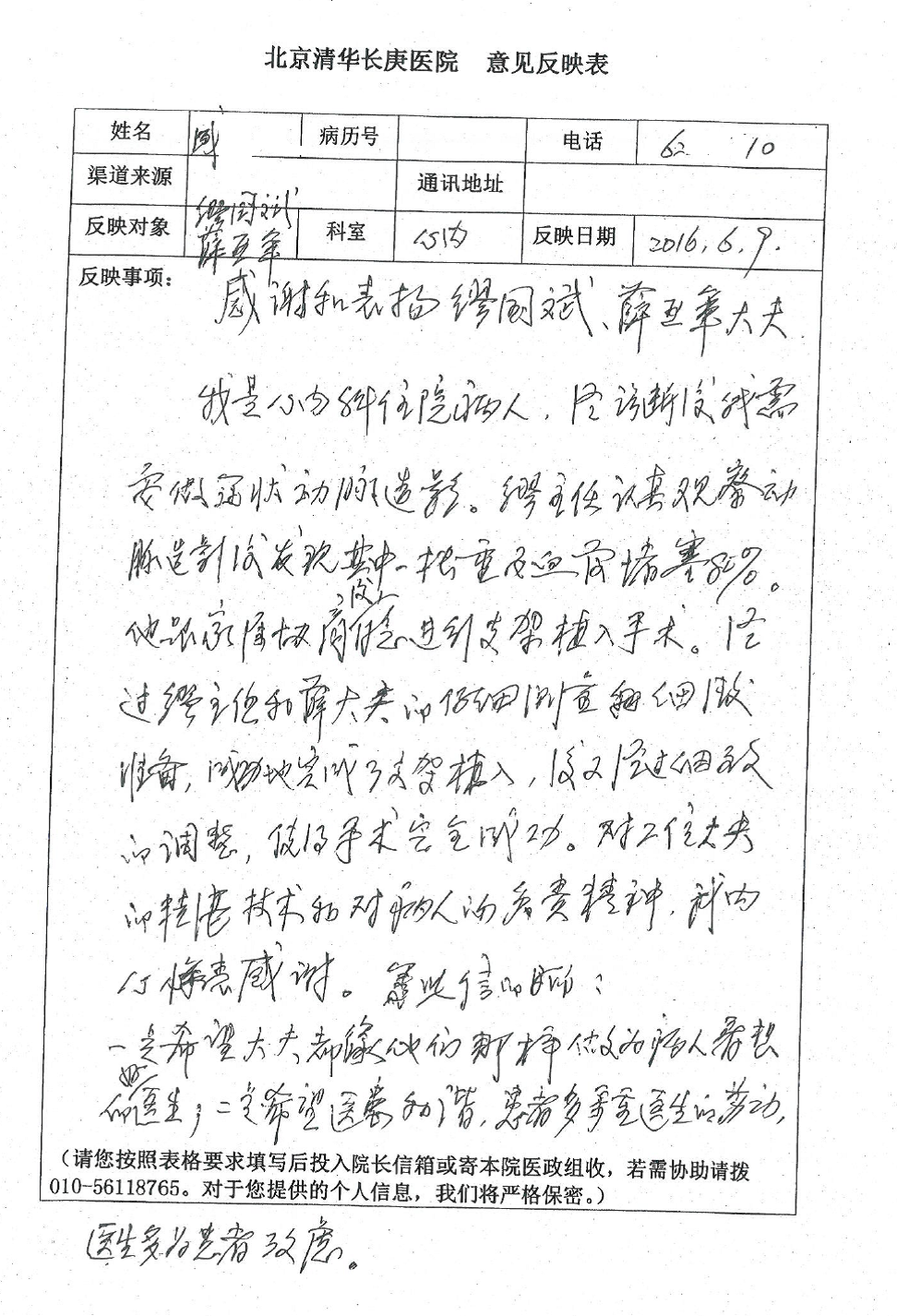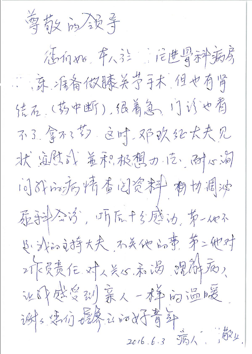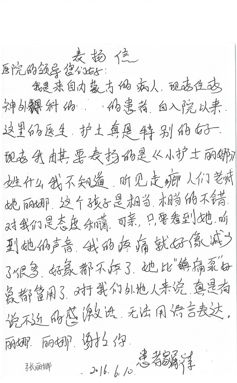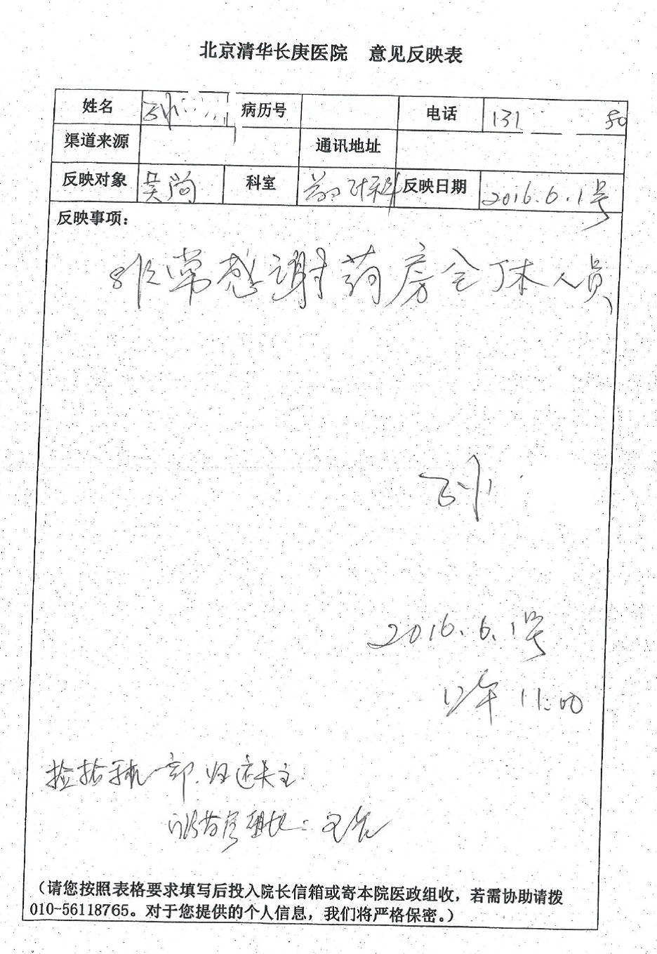 2016年6月,我院共接到患者及家属感谢信32封,其中肝胆胰外科董家鸿主任医师、韩东冬副主任医师、汤睿医师,神经外科张培海医师、刘东康医师,骨科潘勇卫主任医师、蔡谞主任医师、陈连旭副主任医师、邓玖征医师、容威医师、孙长鲛医师,血管外科吴巍巍副主任医师、曹战江医师,泌尿外科李建兴主任医师、张鑫副主任医师、黄鑫医师,心脏内科张萍主任医师、缪国斌副主任医师、佘飞副主任医师、何榕副主任医师、薛亚军主治医师、郭文佳医师,呼吸内科周杰医师,神经内科张菁副主任医师、杨亭亭医师、王也医师、李秀丽医师,血液及肿瘤内科李昕权主任医师、于凡主治医师,妇产科张蕾副主任医师、黄振宇副主任医师、吕涛主治医师、王奔医师、陈华云医师、刘俊医师、文佳医师,康复医学科潘钰主任医师、萧演清医师、徐泉医师、邹丽丽、陈固稳,口腔科聂小汉医师,眼科胡运韬主任医师,超声科张华斌主任医师,药剂科凌桂红、吴尚,护理部侯多朵、张丽娜、刘帅、徐宁、张萍、崔润喆、陈艳妮、张晓雨、张丽娜、李伟伟、季静、吴琼、黄婧倩、于小梅、宋辉辉、曹奇菲、郑爽、许平平、孙蕾蕾以及心内科、妇产科、泌尿外科全体医护人员,6B病区、7B病区全体护理人员,门诊药房全体工作人员,护工主管苏秀珍,食堂刘利荣收到具名表扬。特此公告,以资鼓励!