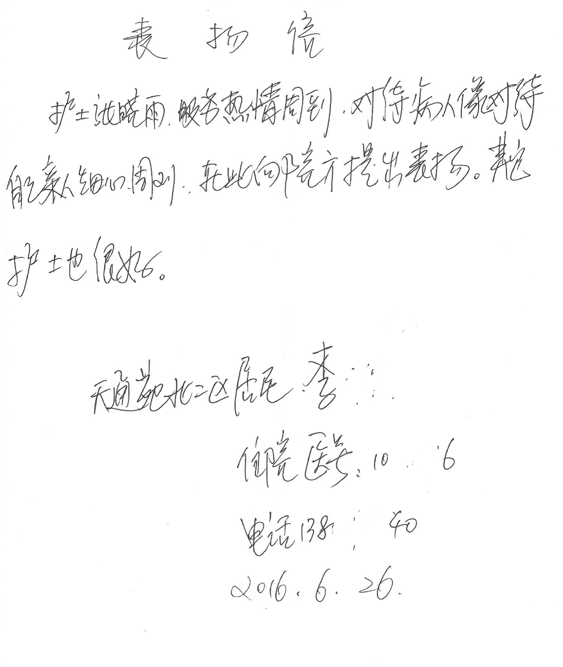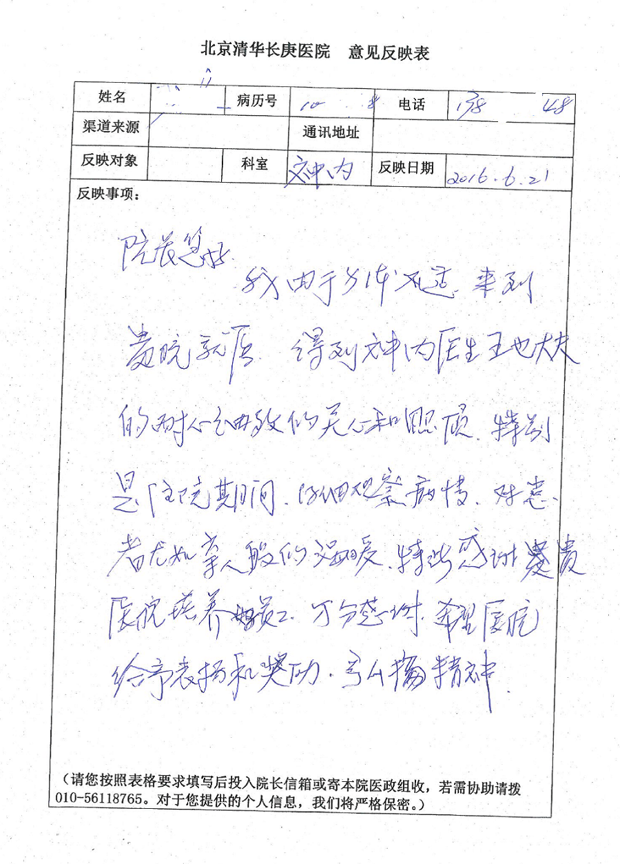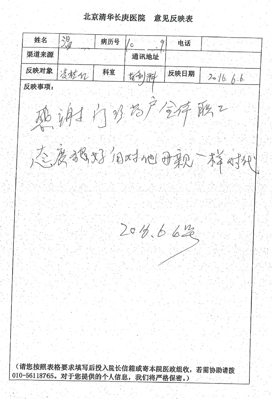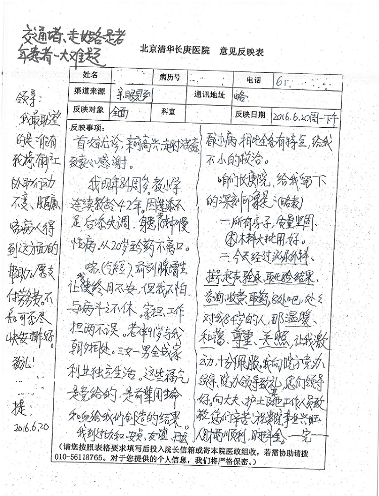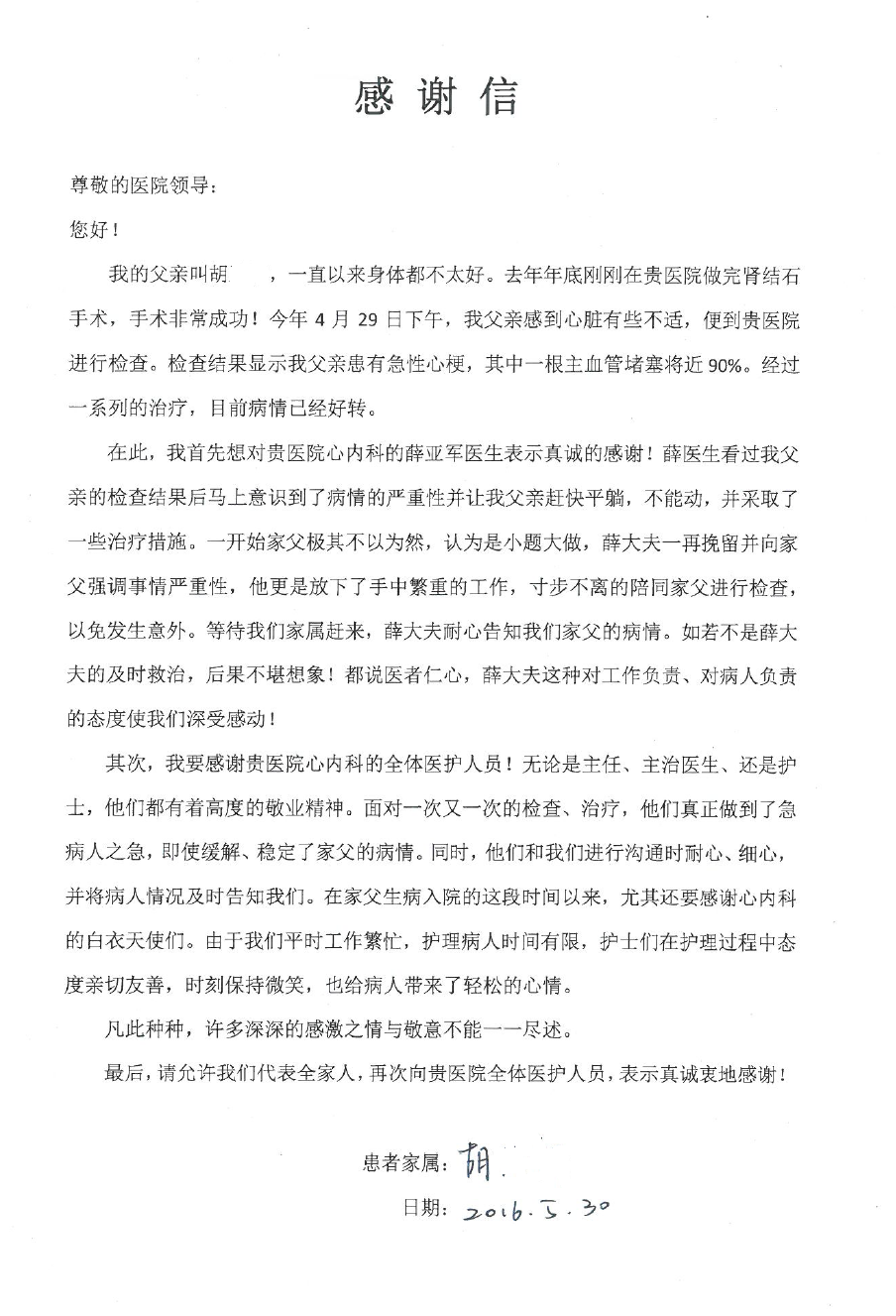 2016年6月,我院共接到患者及家属感谢信32封,其中肝胆胰外科董家鸿主任医师、韩东冬副主任医师、汤睿医师,神经外科张培海医师、刘东康医师,骨科潘勇卫主任医师、蔡谞主任医师、陈连旭副主任医师、邓玖征医师、容威医师、孙长鲛医师,血管外科吴巍巍副主任医师、曹战江医师,泌尿外科李建兴主任医师、张鑫副主任医师、黄鑫医师,心脏内科张萍主任医师、缪国斌副主任医师、佘飞副主任医师、何榕副主任医师、薛亚军主治医师、郭文佳医师,呼吸内科周杰医师,神经内科张菁副主任医师、杨亭亭医师、王也医师、李秀丽医师,血液及肿瘤内科李昕权主任医师、于凡主治医师,妇产科张蕾副主任医师、黄振宇副主任医师、吕涛主治医师、王奔医师、陈华云医师、刘俊医师、文佳医师,康复医学科潘钰主任医师、萧演清医师、徐泉医师、邹丽丽、陈固稳,口腔科聂小汉医师,眼科胡运韬主任医师,超声科张华斌主任医师,药剂科凌桂红、吴尚,护理部侯多朵、张丽娜、刘帅、徐宁、张萍、崔润喆、陈艳妮、张晓雨、张丽娜、李伟伟、季静、吴琼、黄婧倩、于小梅、宋辉辉、曹奇菲、郑爽、许平平、孙蕾蕾以及心内科、妇产科、泌尿外科全体医护人员,6B病区、7B病区全体护理人员,门诊药房全体工作人员,护工主管苏秀珍,食堂刘利荣收到具名表扬。特此公告,以资鼓励!