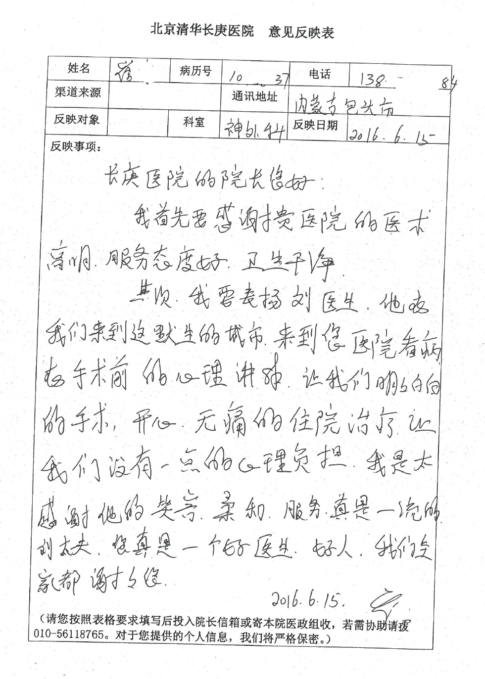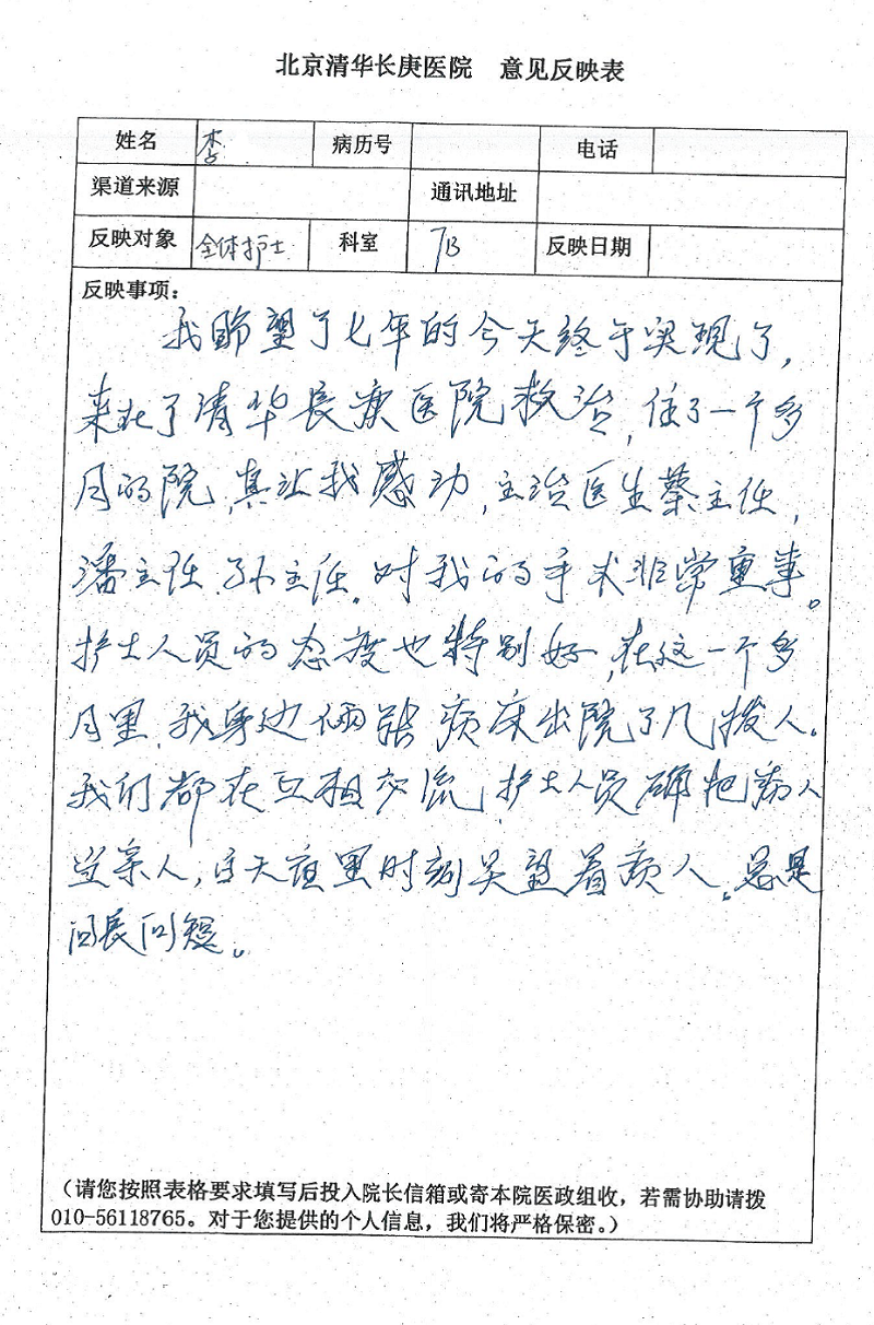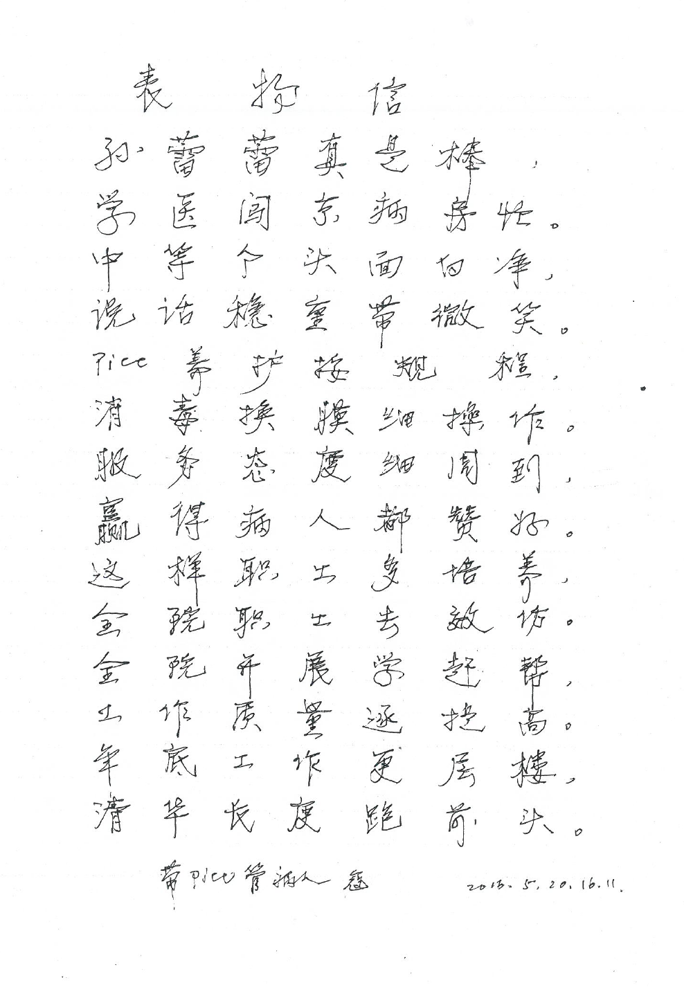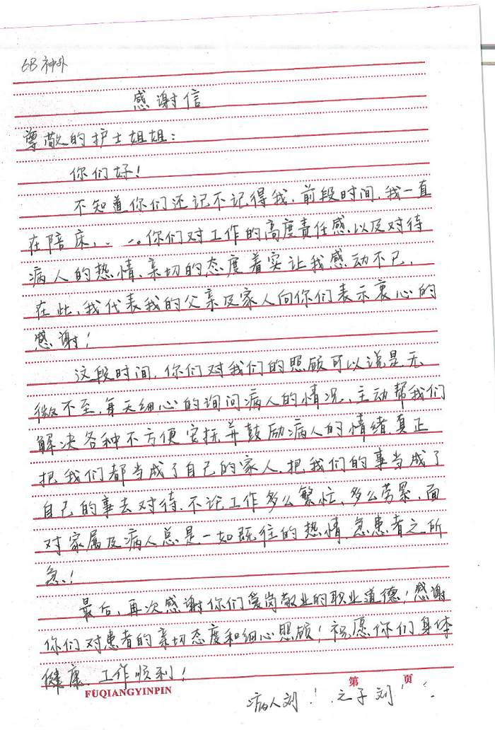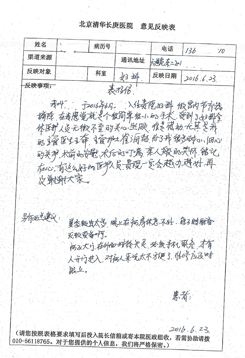 2016年6月,我院共接到患者及家属感谢信32封,其中肝胆胰外科董家鸿主任医师、韩东冬副主任医师、汤睿医师,神经外科张培海医师、刘东康医师,骨科潘勇卫主任医师、蔡谞主任医师、陈连旭副主任医师、邓玖征医师、容威医师、孙长鲛医师,血管外科吴巍巍副主任医师、曹战江医师,泌尿外科李建兴主任医师、张鑫副主任医师、黄鑫医师,心脏内科张萍主任医师、缪国斌副主任医师、佘飞副主任医师、何榕副主任医师、薛亚军主治医师、郭文佳医师,呼吸内科周杰医师,神经内科张菁副主任医师、杨亭亭医师、王也医师、李秀丽医师,血液及肿瘤内科李昕权主任医师、于凡主治医师,妇产科张蕾副主任医师、黄振宇副主任医师、吕涛主治医师、王奔医师、陈华云医师、刘俊医师、文佳医师,康复医学科潘钰主任医师、萧演清医师、徐泉医师、邹丽丽、陈固稳,口腔科聂小汉医师,眼科胡运韬主任医师,超声科张华斌主任医师,药剂科凌桂红、吴尚,护理部侯多朵、张丽娜、刘帅、徐宁、张萍、崔润喆、陈艳妮、张晓雨、张丽娜、李伟伟、季静、吴琼、黄婧倩、于小梅、宋辉辉、曹奇菲、郑爽、许平平、孙蕾蕾以及心内科、妇产科、泌尿外科全体医护人员,6B病区、7B病区全体护理人员,门诊药房全体工作人员,护工主管苏秀珍,食堂刘利荣收到具名表扬。特此公告,以资鼓励!