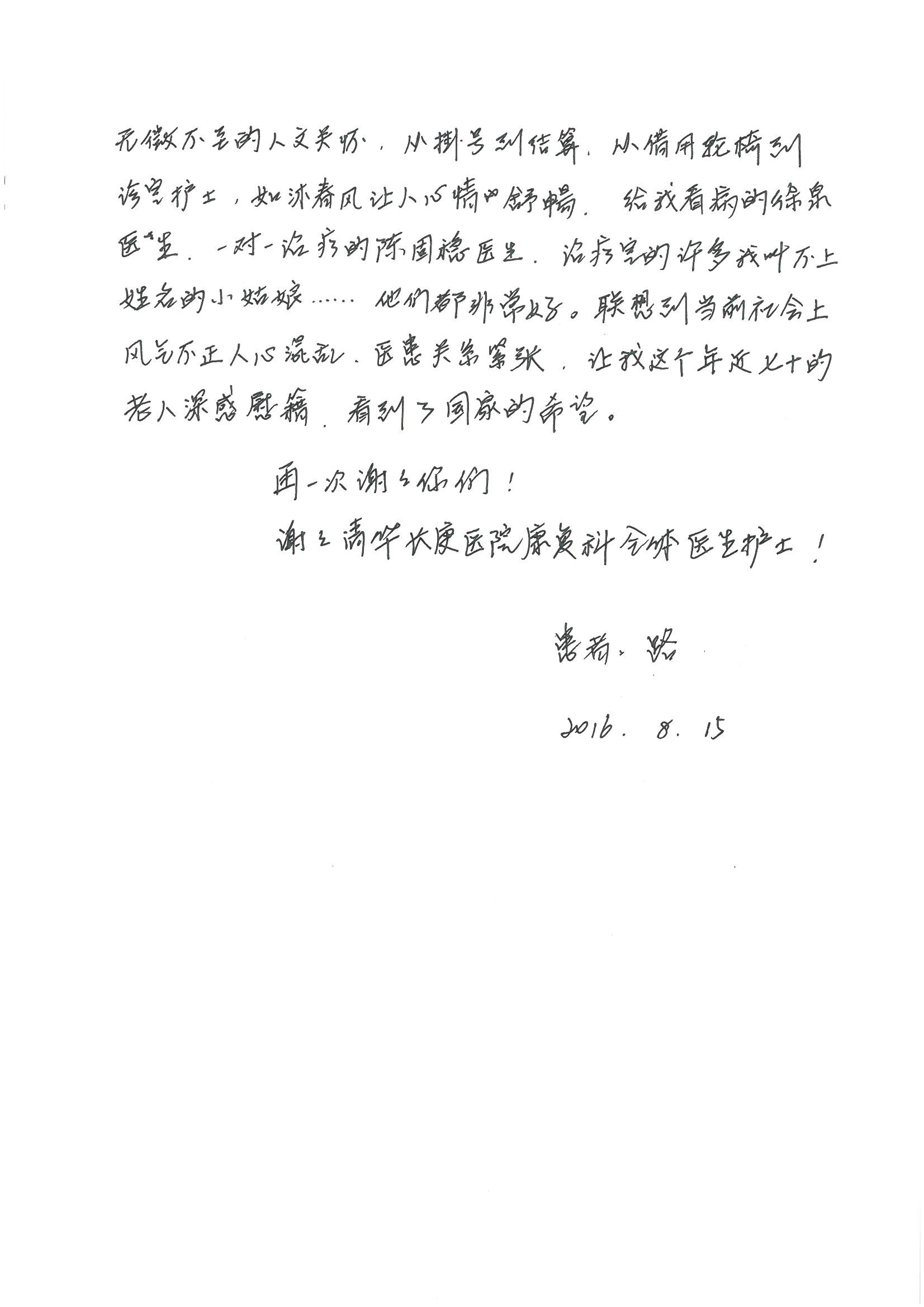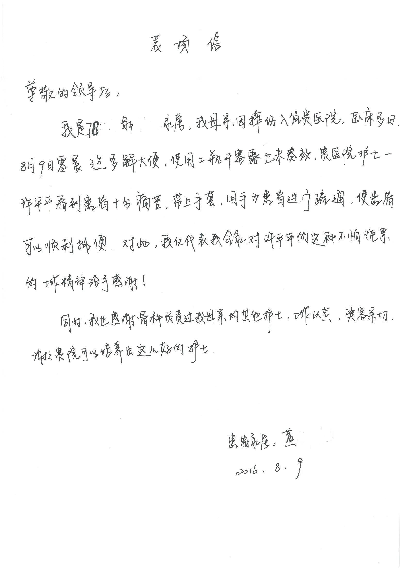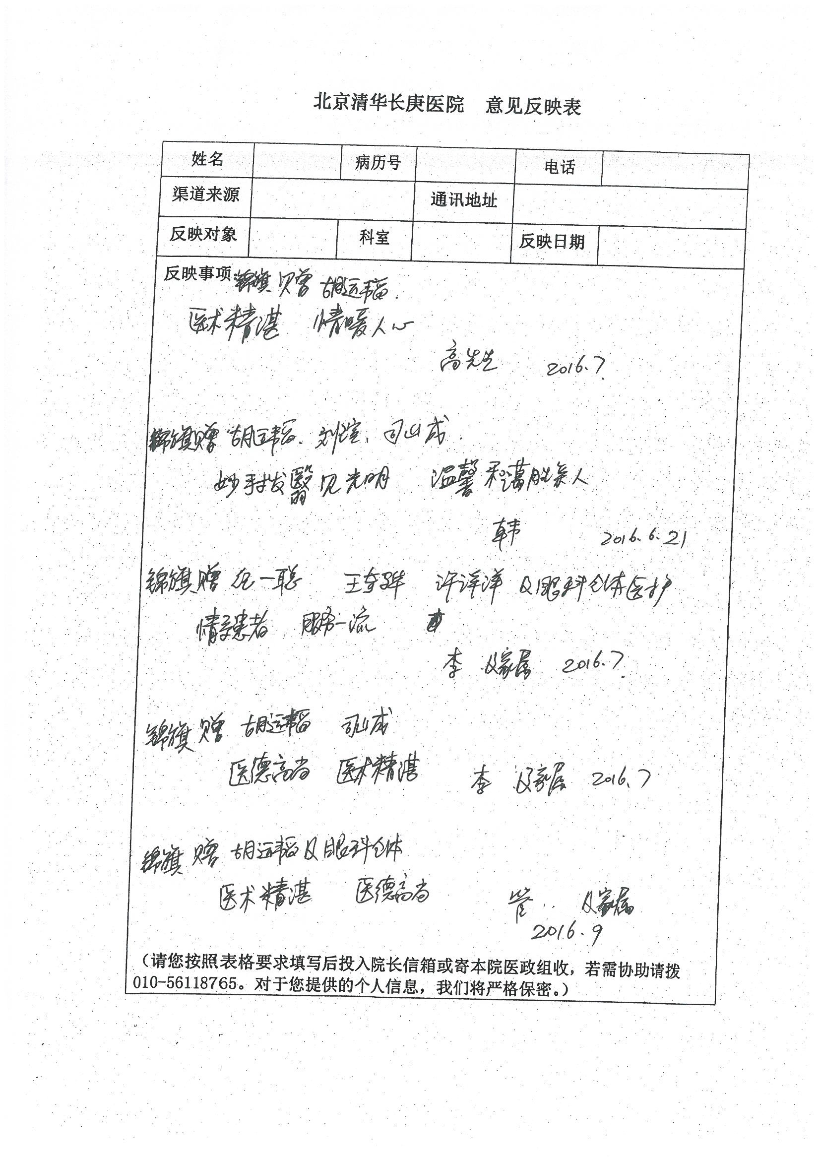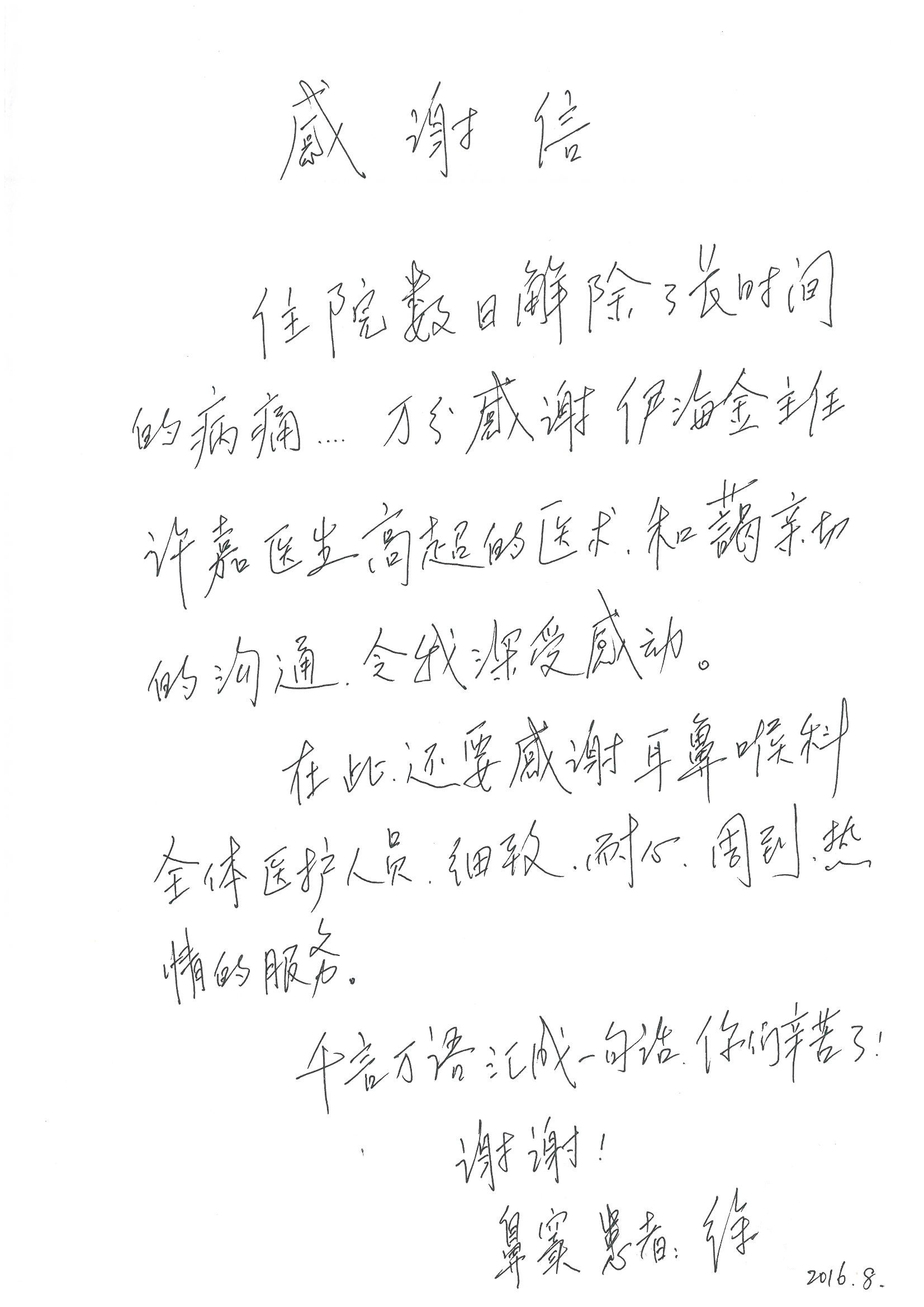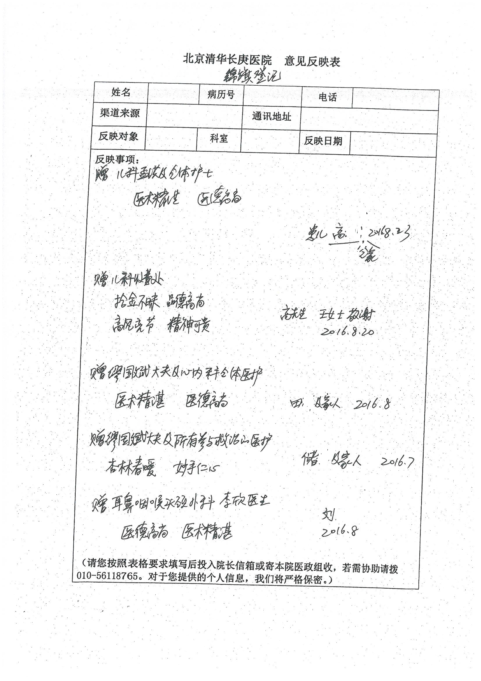 2016年8月,我院共接到患者及家属感谢信63封,其中肝胆外科董家鸿主任医师、张洪义主任医师、张跃伟主任医师、曾建平主治医师、王学栋医师、于里涵医师,神经外科王贵怀主任医师,普通外科罗斌主任医师、李元新主任医师、张鹏主治医师、刘安阳医师,骨科肖嵩华主任医师、潘勇卫主任医师、蔡谞主任医师、陈连旭副主任医师、宋飞主治医生、赵喆主治医师、朱剑津医师、邓玖征医师、付立功医师、孙长鲛医师、何大炜医师、徐凯医师、陈强医师、黄鑫医师,血管外科吴巍巍副主任医师、赵俊来医师、曹战江医师,心脏内科缪国斌主任医师、薛亚军主治医师,肾脏内科李月红主任医师、王炜主治医师、陈瑞医师,消化内科相马宁主任医师,血液内科李墨丹医师,儿科孟洪医师,康复科潘钰主任医师、萧演清医师、徐泉医师、阎澍妤医师、杨晓辉、马春岳、屠媛媛、邹丽丽、樊森朝、付莉莉、张丽春、尹航、陈固稳,内分泌科肖建中主任医师,皮肤科陈典医师,眼科胡运韬主任医师、刘瑄副主任医师、司山成医师、王奇骅医师、纪一聪,耳鼻喉科伊海金副主任医师、李欣副主任医师、许嘉医师,急诊科宋琳琳主治医师,医事处范丹梅,药剂科闫玉莹、杨学斌、李成玉、张心悦,护理部许洋洋、李梦雅、王梦瑶、李怡然、许丽丽、张晓宇、李亚灵、李冰、王秋惠、李双双、张传云、王慧颖、徐欣慧、徐宁、张苹、李彩云、辛扬眉、张慧文、郭婧倩、宋辉辉、季静、谢兰兰、曹奇菲、苑贵芳、杜双双、方玲、许平平、于洋洋、刘宇琛、郑爽、梁佳玉、陈莹、李硕、王梦瑶、于萍萍、苏贵云、杨旭东、辛扬眉、郑农、方玲、曹奇菲、带海栾、尹雪以及眼科、心脏内科、神经外科、动态心电图室、血管外科、耳鼻喉头颈外科全体医护人员,儿科全体护理人员,儿科收费处收到具名表扬。特此公告,以资鼓励!