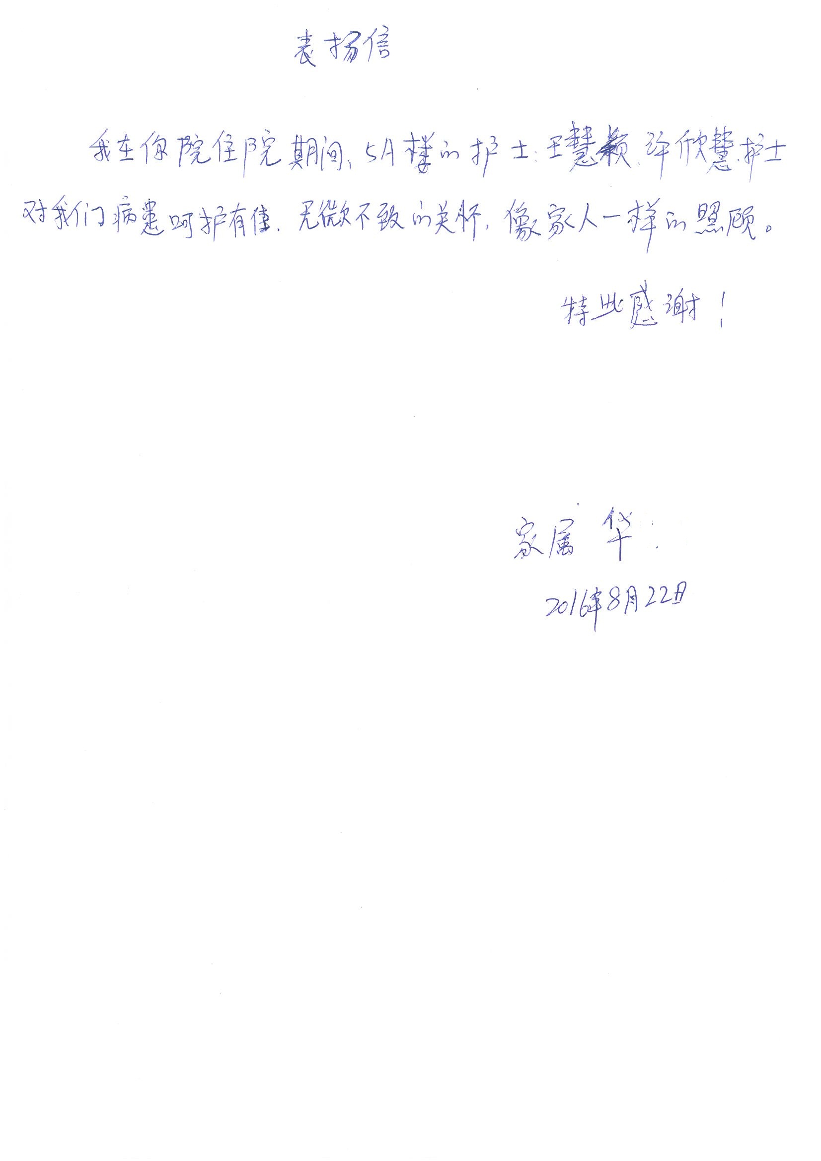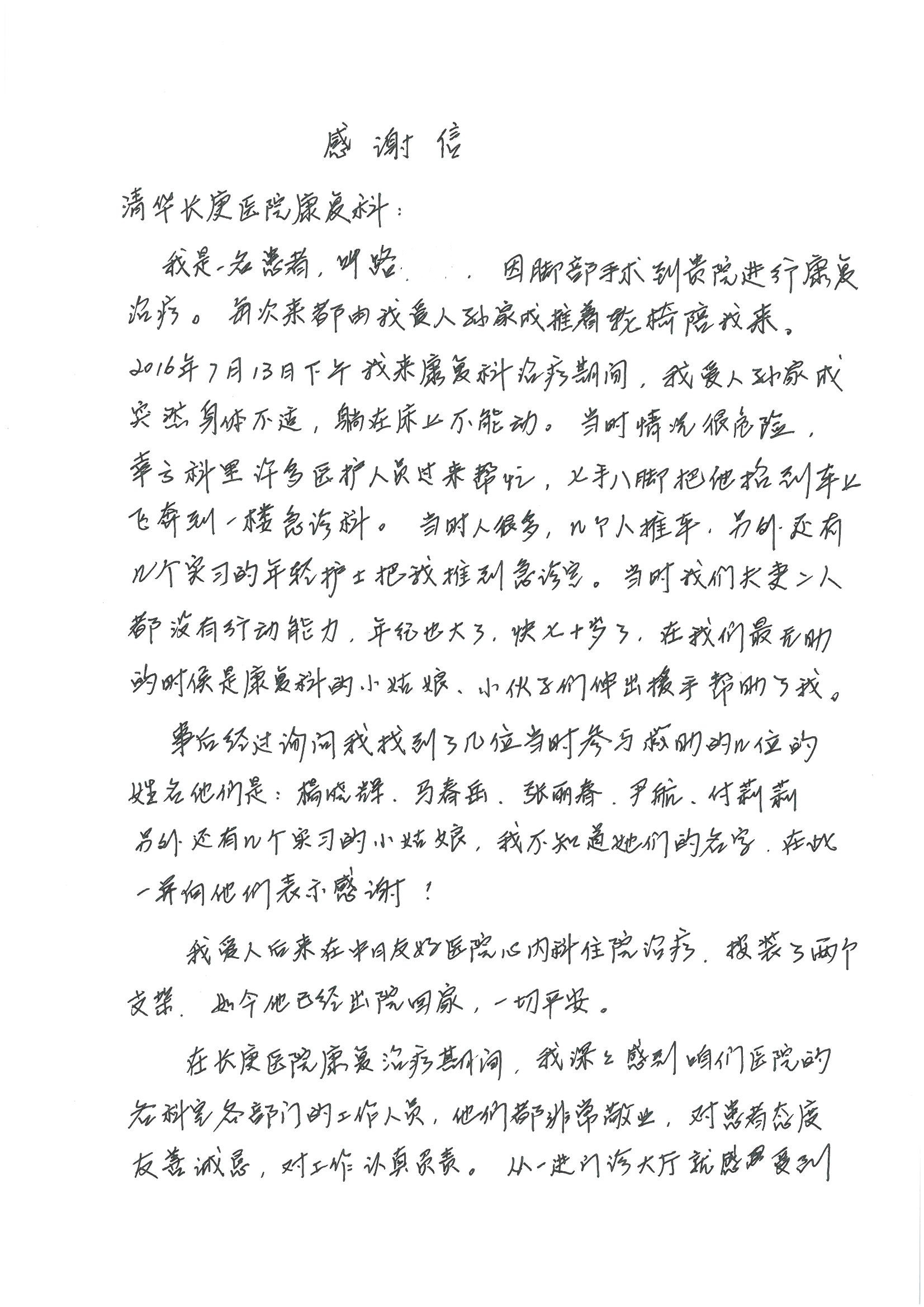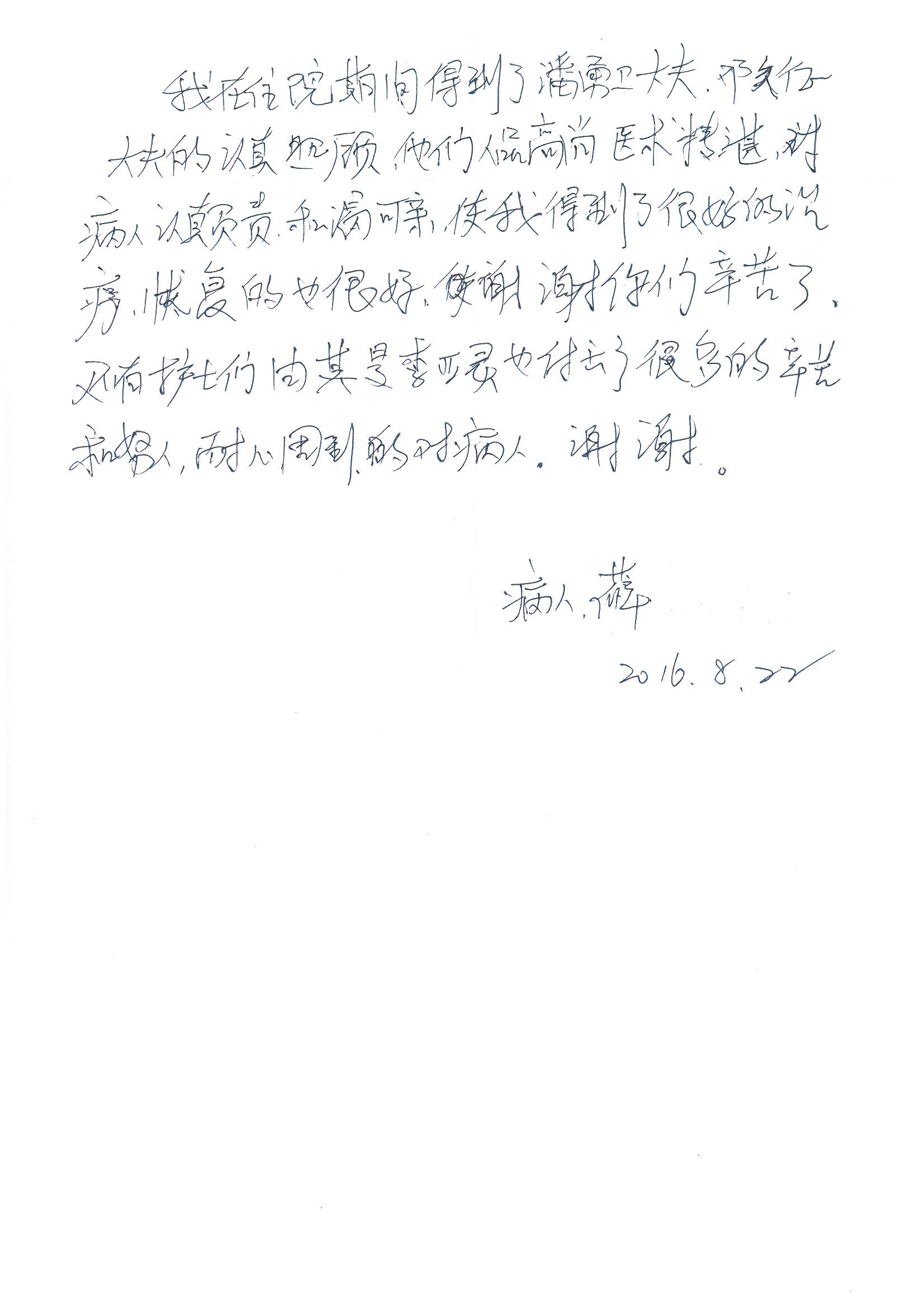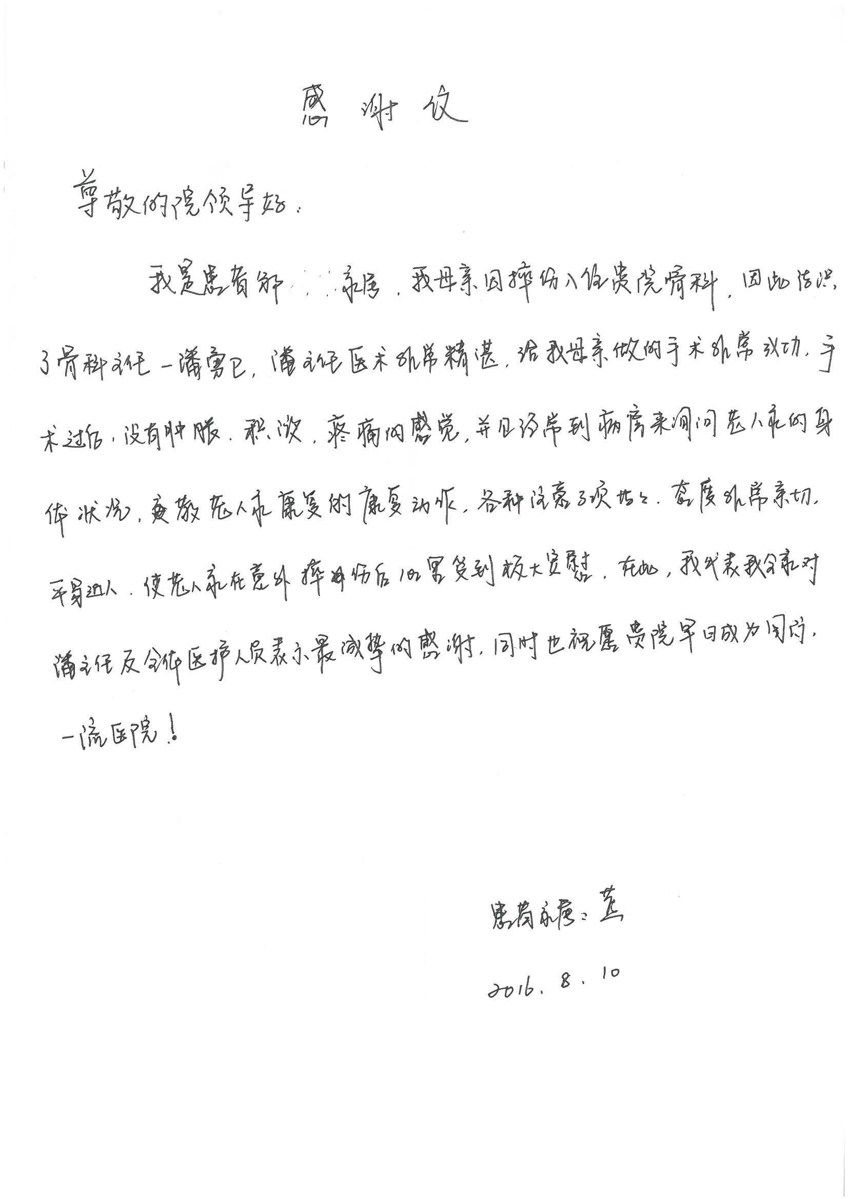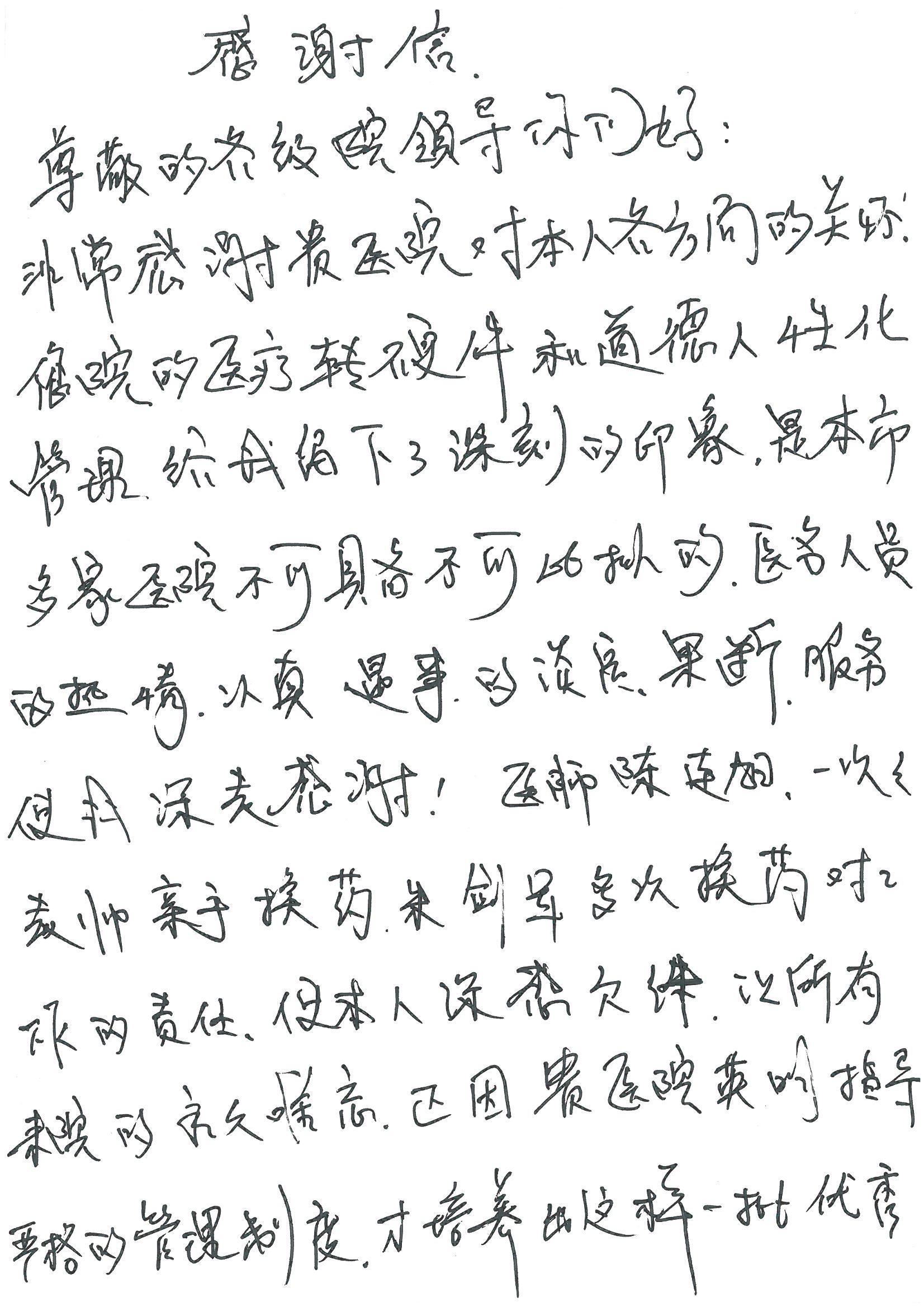 2016年8月,我院共接到患者及家属感谢信63封,其中肝胆外科董家鸿主任医师、张洪义主任医师、张跃伟主任医师、曾建平主治医师、王学栋医师、于里涵医师,神经外科王贵怀主任医师,普通外科罗斌主任医师、李元新主任医师、张鹏主治医师、刘安阳医师,骨科肖嵩华主任医师、潘勇卫主任医师、蔡谞主任医师、陈连旭副主任医师、宋飞主治医生、赵喆主治医师、朱剑津医师、邓玖征医师、付立功医师、孙长鲛医师、何大炜医师、徐凯医师、陈强医师、黄鑫医师,血管外科吴巍巍副主任医师、赵俊来医师、曹战江医师,心脏内科缪国斌主任医师、薛亚军主治医师,肾脏内科李月红主任医师、王炜主治医师、陈瑞医师,消化内科相马宁主任医师,血液内科李墨丹医师,儿科孟洪医师,康复科潘钰主任医师、萧演清医师、徐泉医师、阎澍妤医师、杨晓辉、马春岳、屠媛媛、邹丽丽、樊森朝、付莉莉、张丽春、尹航、陈固稳,内分泌科肖建中主任医师,皮肤科陈典医师,眼科胡运韬主任医师、刘瑄副主任医师、司山成医师、王奇骅医师、纪一聪,耳鼻喉科伊海金副主任医师、李欣副主任医师、许嘉医师,急诊科宋琳琳主治医师,医事处范丹梅,药剂科闫玉莹、杨学斌、李成玉、张心悦,护理部许洋洋、李梦雅、王梦瑶、李怡然、许丽丽、张晓宇、李亚灵、李冰、王秋惠、李双双、张传云、王慧颖、徐欣慧、徐宁、张苹、李彩云、辛扬眉、张慧文、郭婧倩、宋辉辉、季静、谢兰兰、曹奇菲、苑贵芳、杜双双、方玲、许平平、于洋洋、刘宇琛、郑爽、梁佳玉、陈莹、李硕、王梦瑶、于萍萍、苏贵云、杨旭东、辛扬眉、郑农、方玲、曹奇菲、带海栾、尹雪以及眼科、心脏内科、神经外科、动态心电图室、血管外科、耳鼻喉头颈外科全体医护人员,儿科全体护理人员,儿科收费处收到具名表扬。特此公告,以资鼓励!