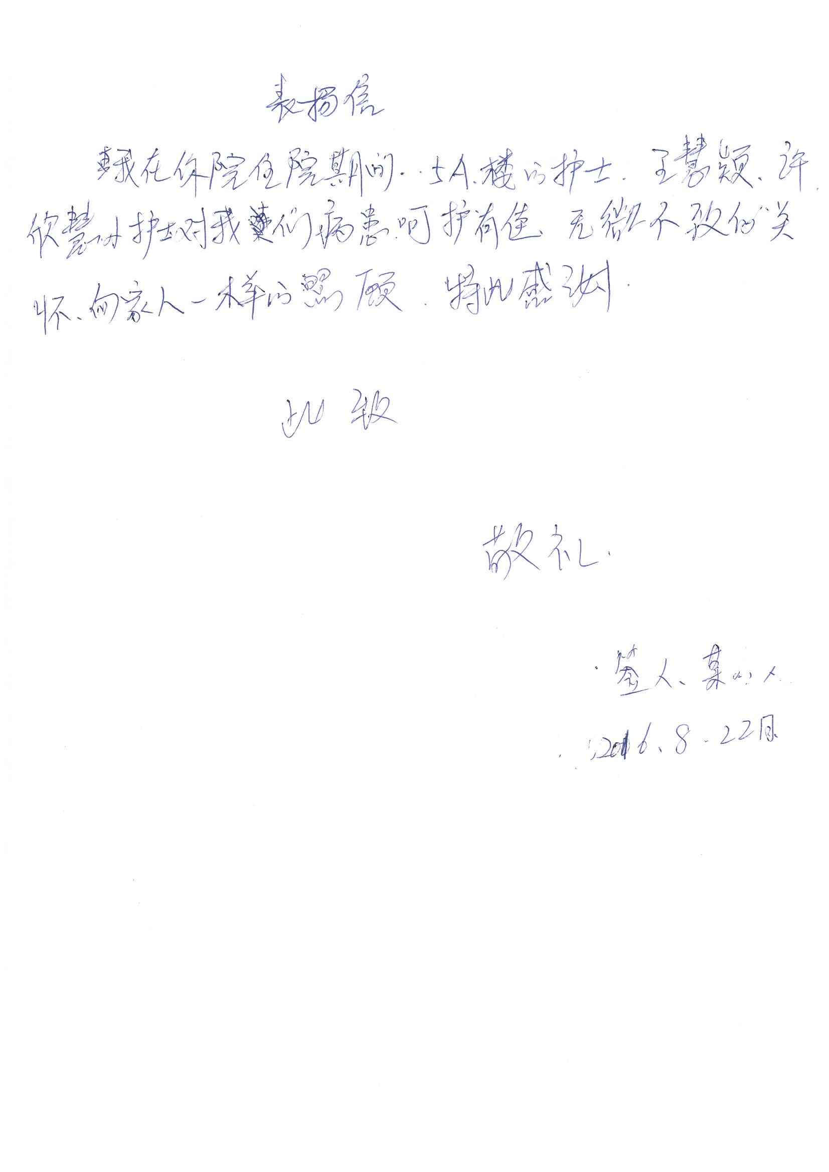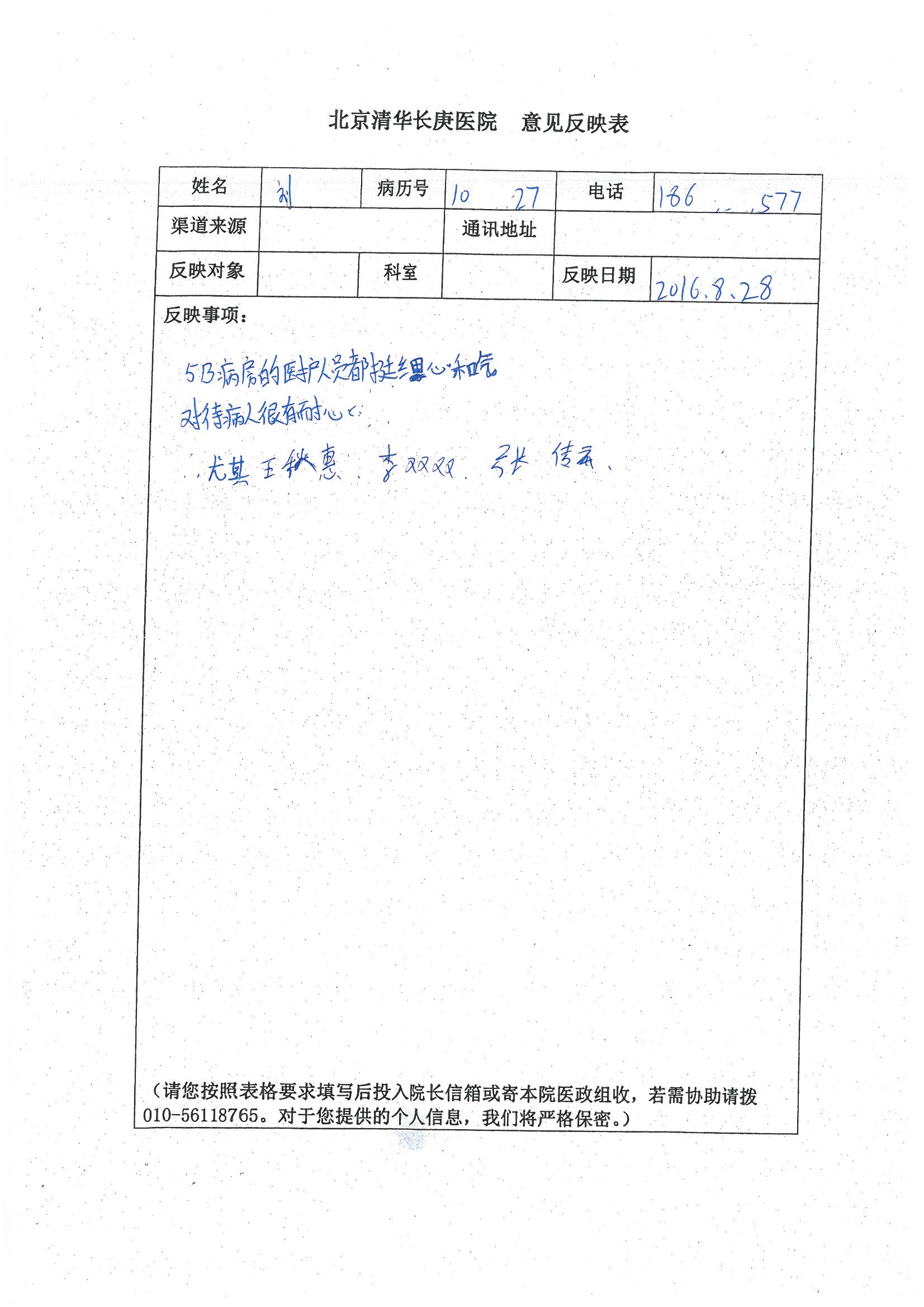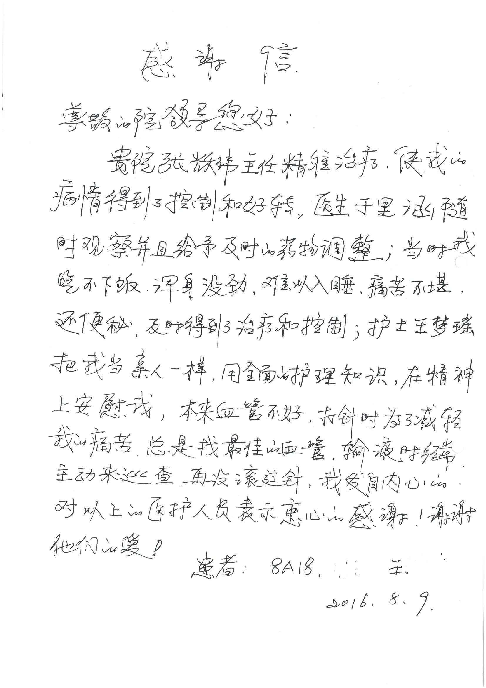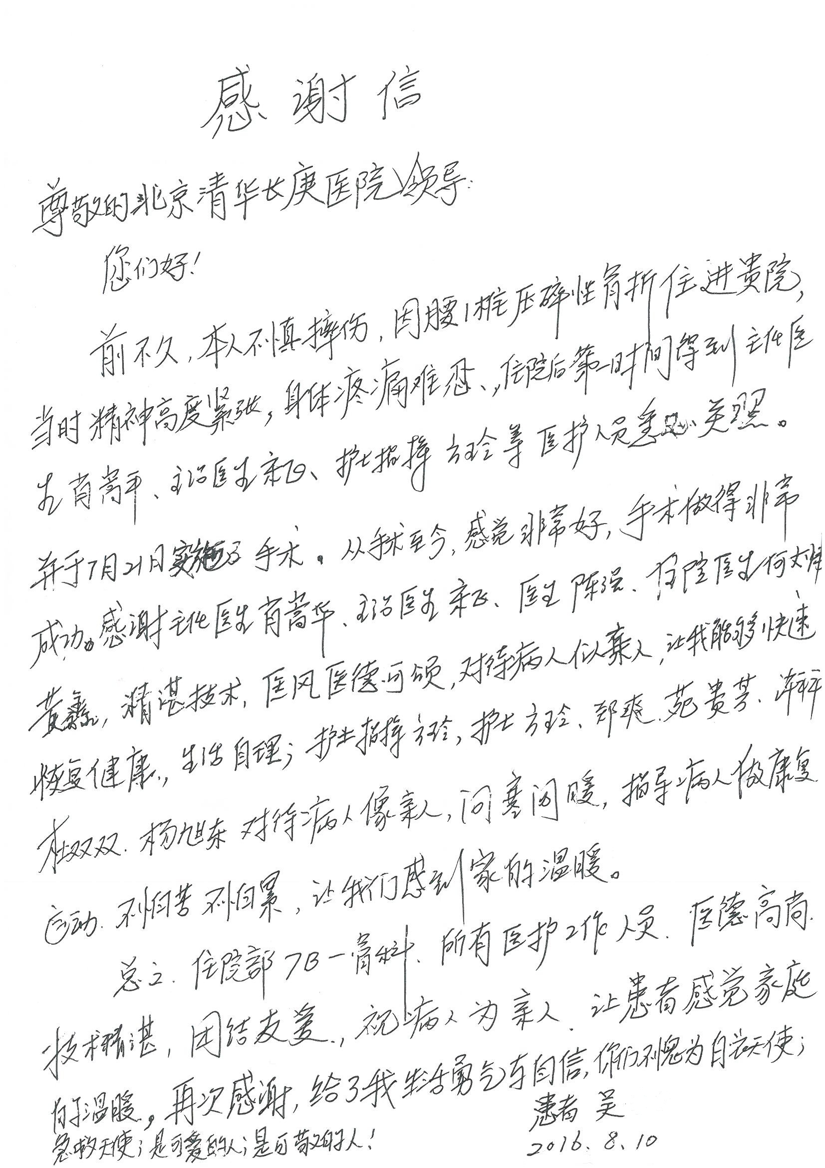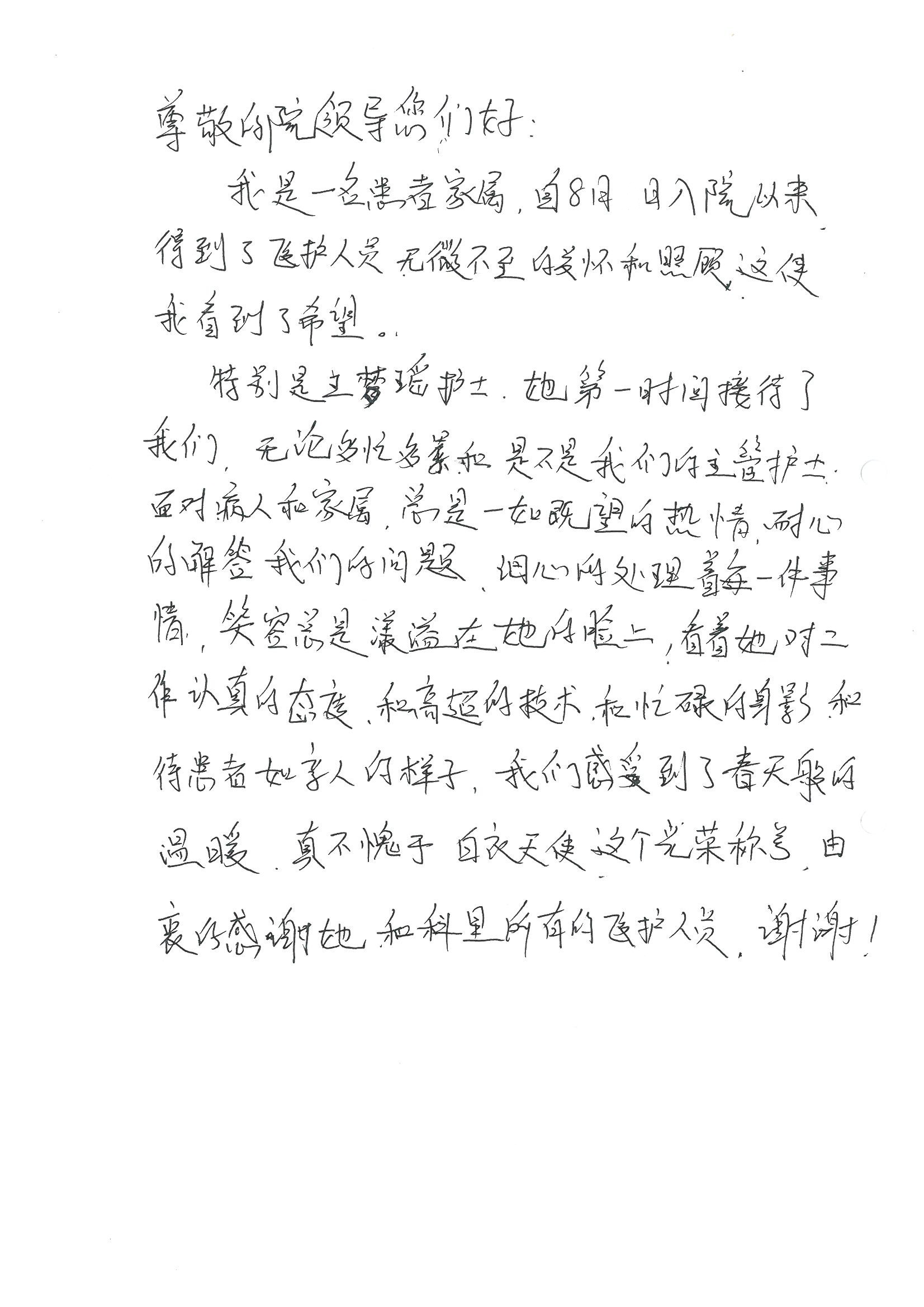 2016年8月,我院共接到患者及家属感谢信63封,其中肝胆外科董家鸿主任医师、张洪义主任医师、张跃伟主任医师、曾建平主治医师、王学栋医师、于里涵医师,神经外科王贵怀主任医师,普通外科罗斌主任医师、李元新主任医师、张鹏主治医师、刘安阳医师,骨科肖嵩华主任医师、潘勇卫主任医师、蔡谞主任医师、陈连旭副主任医师、宋飞主治医生、赵喆主治医师、朱剑津医师、邓玖征医师、付立功医师、孙长鲛医师、何大炜医师、徐凯医师、陈强医师、黄鑫医师,血管外科吴巍巍副主任医师、赵俊来医师、曹战江医师,心脏内科缪国斌主任医师、薛亚军主治医师,肾脏内科李月红主任医师、王炜主治医师、陈瑞医师,消化内科相马宁主任医师,血液内科李墨丹医师,儿科孟洪医师,康复科潘钰主任医师、萧演清医师、徐泉医师、阎澍妤医师、杨晓辉、马春岳、屠媛媛、邹丽丽、樊森朝、付莉莉、张丽春、尹航、陈固稳,内分泌科肖建中主任医师,皮肤科陈典医师,眼科胡运韬主任医师、刘瑄副主任医师、司山成医师、王奇骅医师、纪一聪,耳鼻喉科伊海金副主任医师、李欣副主任医师、许嘉医师,急诊科宋琳琳主治医师,医事处范丹梅,药剂科闫玉莹、杨学斌、李成玉、张心悦,护理部许洋洋、李梦雅、王梦瑶、李怡然、许丽丽、张晓宇、李亚灵、李冰、王秋惠、李双双、张传云、王慧颖、徐欣慧、徐宁、张苹、李彩云、辛扬眉、张慧文、郭婧倩、宋辉辉、季静、谢兰兰、曹奇菲、苑贵芳、杜双双、方玲、许平平、于洋洋、刘宇琛、郑爽、梁佳玉、陈莹、李硕、王梦瑶、于萍萍、苏贵云、杨旭东、辛扬眉、郑农、方玲、曹奇菲、带海栾、尹雪以及眼科、心脏内科、神经外科、动态心电图室、血管外科、耳鼻喉头颈外科全体医护人员,儿科全体护理人员,儿科收费处收到具名表扬。特此公告,以资鼓励!