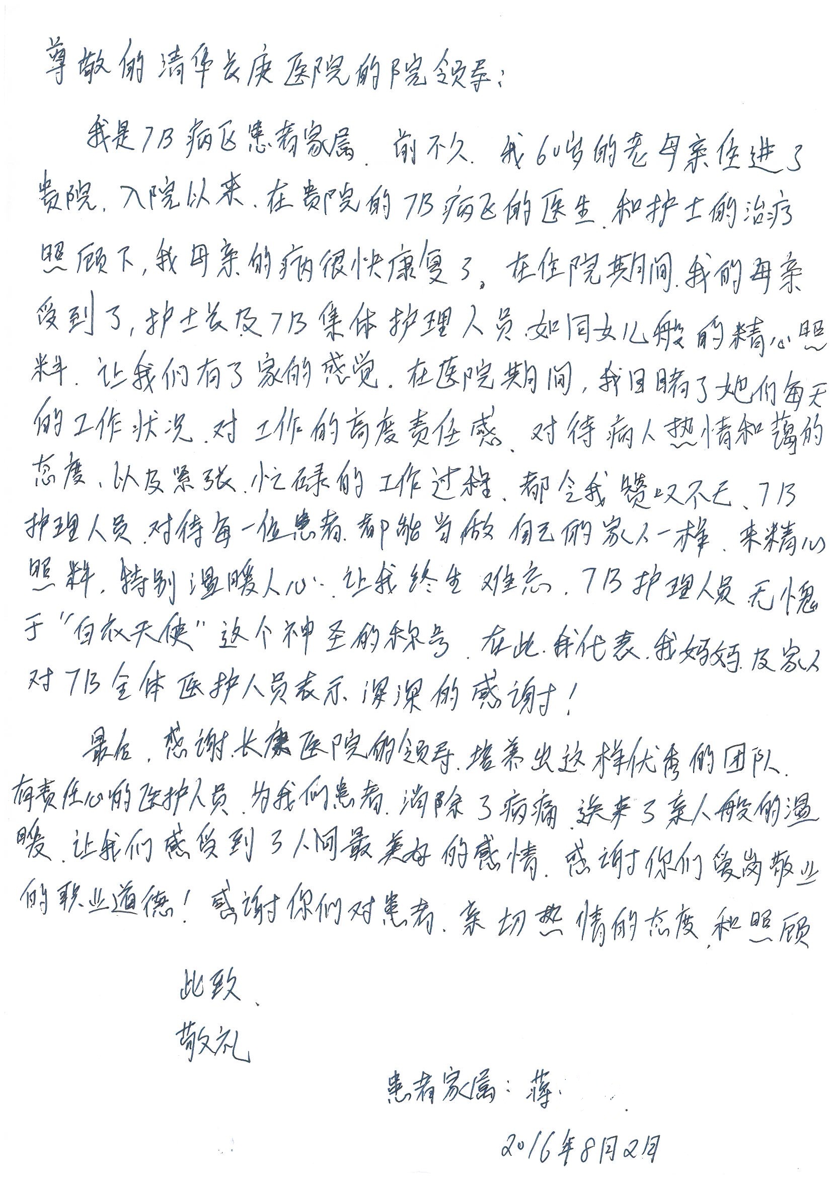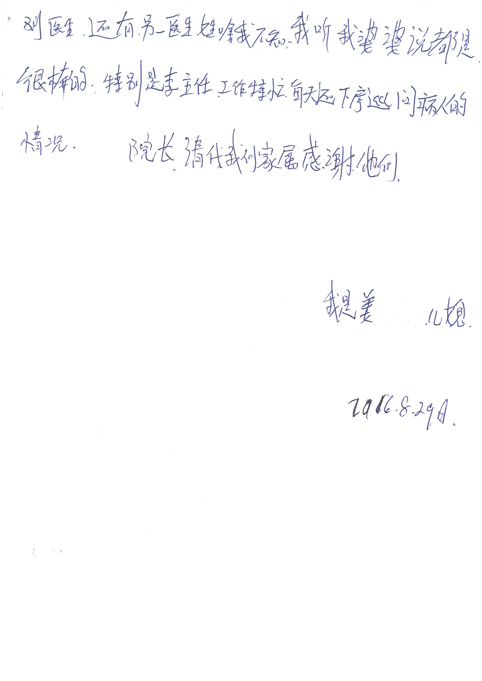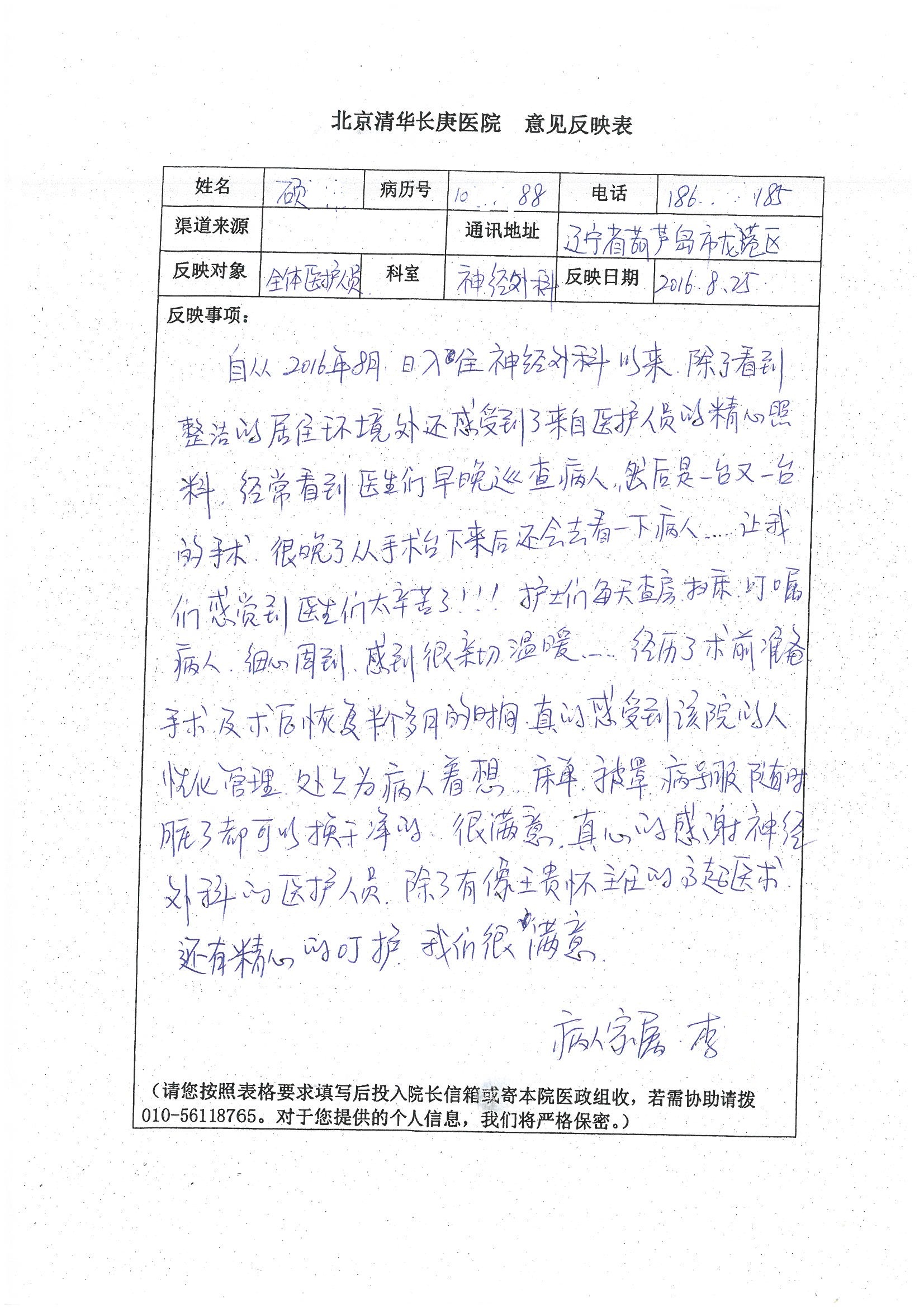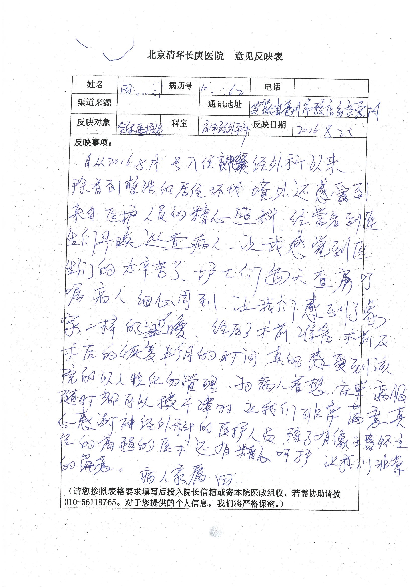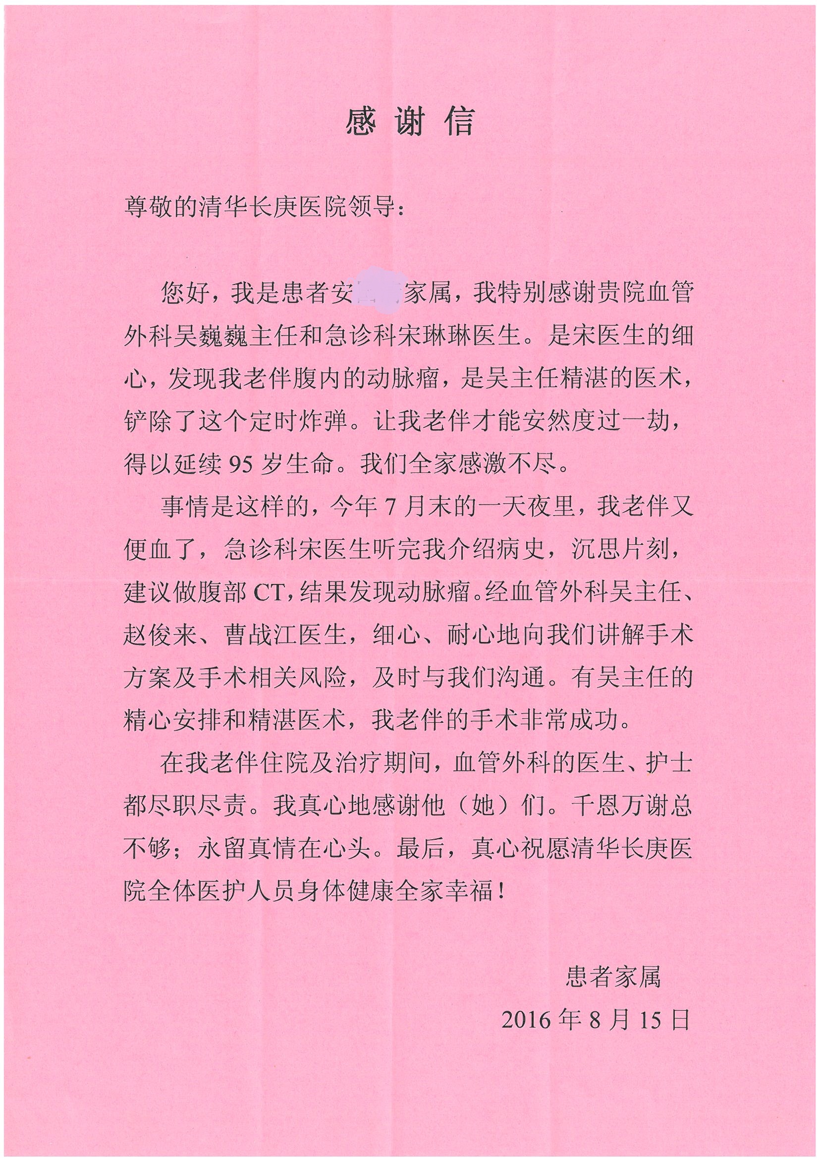 2016年8月,我院共接到患者及家属感谢信63封,其中肝胆外科董家鸿主任医师、张洪义主任医师、张跃伟主任医师、曾建平主治医师、王学栋医师、于里涵医师,神经外科王贵怀主任医师,普通外科罗斌主任医师、李元新主任医师、张鹏主治医师、刘安阳医师,骨科肖嵩华主任医师、潘勇卫主任医师、蔡谞主任医师、陈连旭副主任医师、宋飞主治医生、赵喆主治医师、朱剑津医师、邓玖征医师、付立功医师、孙长鲛医师、何大炜医师、徐凯医师、陈强医师、黄鑫医师,血管外科吴巍巍副主任医师、赵俊来医师、曹战江医师,心脏内科缪国斌主任医师、薛亚军主治医师,肾脏内科李月红主任医师、王炜主治医师、陈瑞医师,消化内科相马宁主任医师,血液内科李墨丹医师,儿科孟洪医师,康复科潘钰主任医师、萧演清医师、徐泉医师、阎澍妤医师、杨晓辉、马春岳、屠媛媛、邹丽丽、樊森朝、付莉莉、张丽春、尹航、陈固稳,内分泌科肖建中主任医师,皮肤科陈典医师,眼科胡运韬主任医师、刘瑄副主任医师、司山成医师、王奇骅医师、纪一聪,耳鼻喉科伊海金副主任医师、李欣副主任医师、许嘉医师,急诊科宋琳琳主治医师,医事处范丹梅,药剂科闫玉莹、杨学斌、李成玉、张心悦,护理部许洋洋、李梦雅、王梦瑶、李怡然、许丽丽、张晓宇、李亚灵、李冰、王秋惠、李双双、张传云、王慧颖、徐欣慧、徐宁、张苹、李彩云、辛扬眉、张慧文、郭婧倩、宋辉辉、季静、谢兰兰、曹奇菲、苑贵芳、杜双双、方玲、许平平、于洋洋、刘宇琛、郑爽、梁佳玉、陈莹、李硕、王梦瑶、于萍萍、苏贵云、杨旭东、辛扬眉、郑农、方玲、曹奇菲、带海栾、尹雪以及眼科、心脏内科、神经外科、动态心电图室、血管外科、耳鼻喉头颈外科全体医护人员,儿科全体护理人员,儿科收费处收到具名表扬。特此公告,以资鼓励!