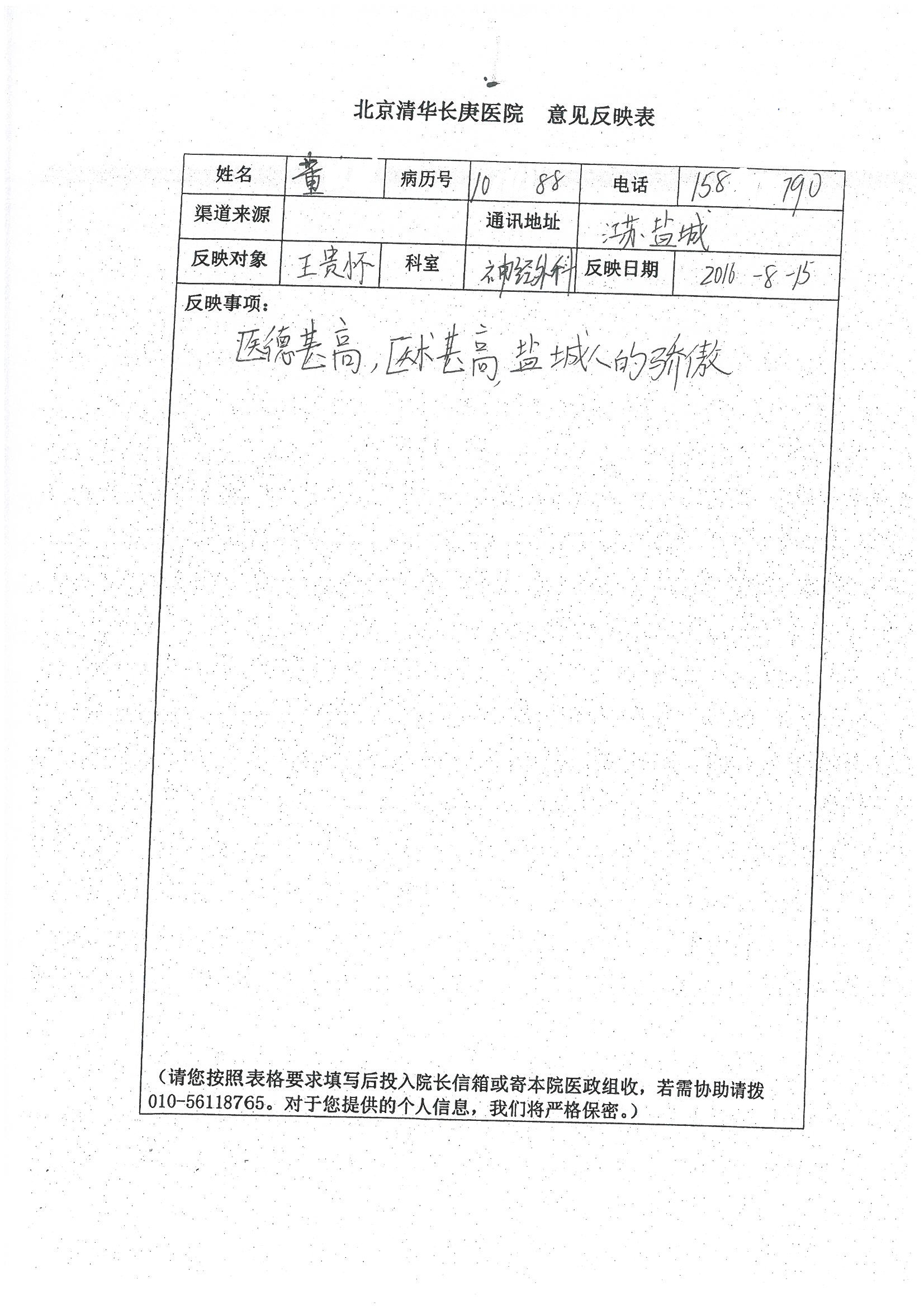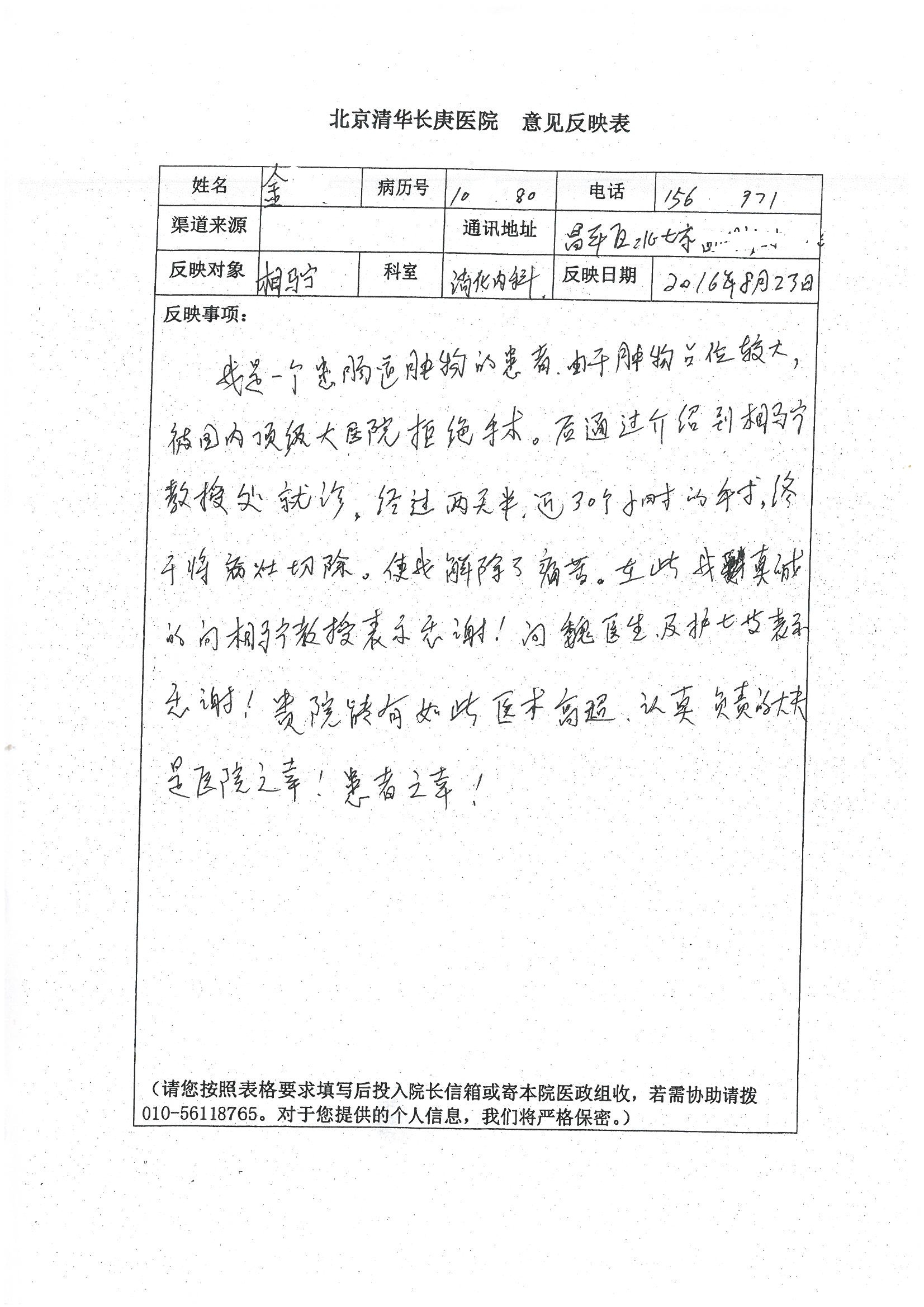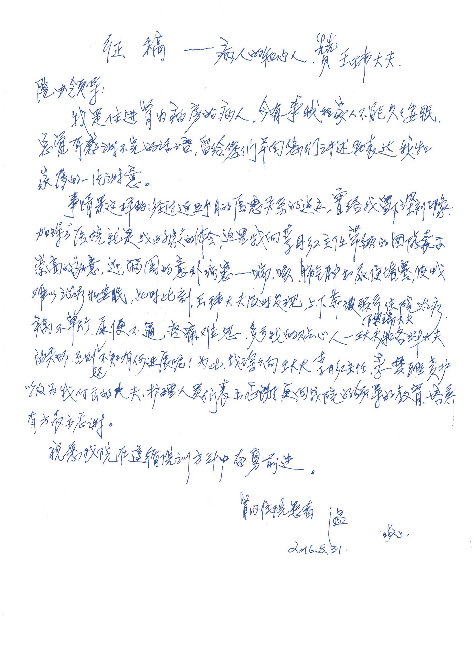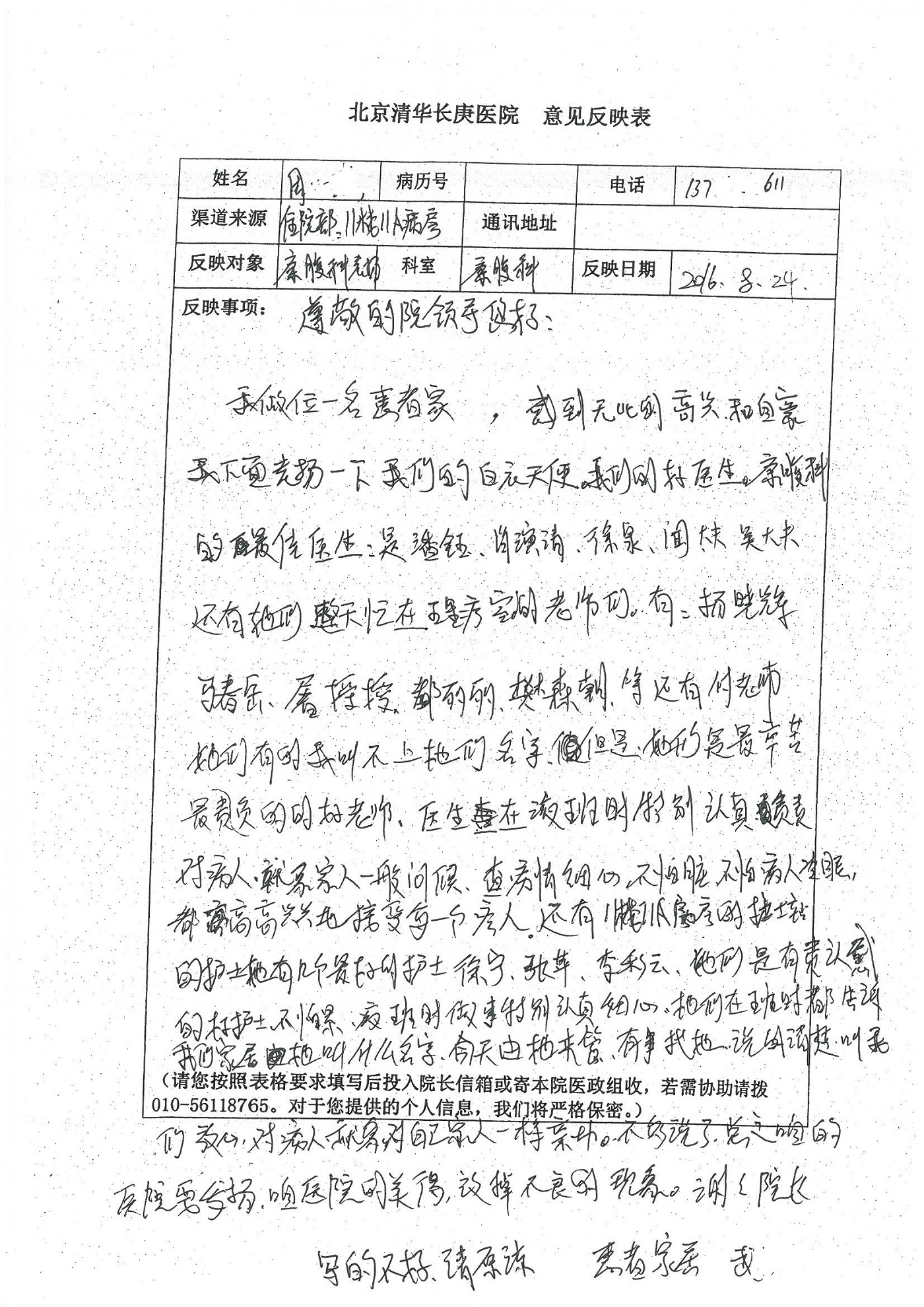 2016年8月,我院共接到患者及家属感谢信63封,其中肝胆外科董家鸿主任医师、张洪义主任医师、张跃伟主任医师、曾建平主治医师、王学栋医师、于里涵医师,神经外科王贵怀主任医师,普通外科罗斌主任医师、李元新主任医师、张鹏主治医师、刘安阳医师,骨科肖嵩华主任医师、潘勇卫主任医师、蔡谞主任医师、陈连旭副主任医师、宋飞主治医生、赵喆主治医师、朱剑津医师、邓玖征医师、付立功医师、孙长鲛医师、何大炜医师、徐凯医师、陈强医师、黄鑫医师,血管外科吴巍巍副主任医师、赵俊来医师、曹战江医师,心脏内科缪国斌主任医师、薛亚军主治医师,肾脏内科李月红主任医师、王炜主治医师、陈瑞医师,消化内科相马宁主任医师,血液内科李墨丹医师,儿科孟洪医师,康复科潘钰主任医师、萧演清医师、徐泉医师、阎澍妤医师、杨晓辉、马春岳、屠媛媛、邹丽丽、樊森朝、付莉莉、张丽春、尹航、陈固稳,内分泌科肖建中主任医师,皮肤科陈典医师,眼科胡运韬主任医师、刘瑄副主任医师、司山成医师、王奇骅医师、纪一聪,耳鼻喉科伊海金副主任医师、李欣副主任医师、许嘉医师,急诊科宋琳琳主治医师,医事处范丹梅,药剂科闫玉莹、杨学斌、李成玉、张心悦,护理部许洋洋、李梦雅、王梦瑶、李怡然、许丽丽、张晓宇、李亚灵、李冰、王秋惠、李双双、张传云、王慧颖、徐欣慧、徐宁、张苹、李彩云、辛扬眉、张慧文、郭婧倩、宋辉辉、季静、谢兰兰、曹奇菲、苑贵芳、杜双双、方玲、许平平、于洋洋、刘宇琛、郑爽、梁佳玉、陈莹、李硕、王梦瑶、于萍萍、苏贵云、杨旭东、辛扬眉、郑农、方玲、曹奇菲、带海栾、尹雪以及眼科、心脏内科、神经外科、动态心电图室、血管外科、耳鼻喉头颈外科全体医护人员,儿科全体护理人员,儿科收费处收到具名表扬。特此公告,以资鼓励!