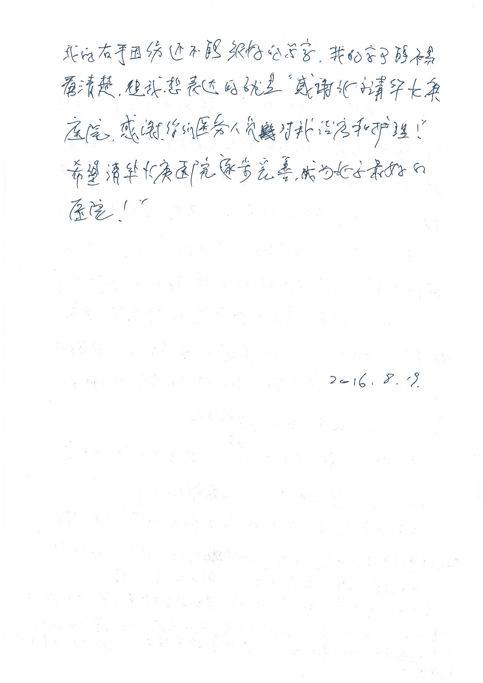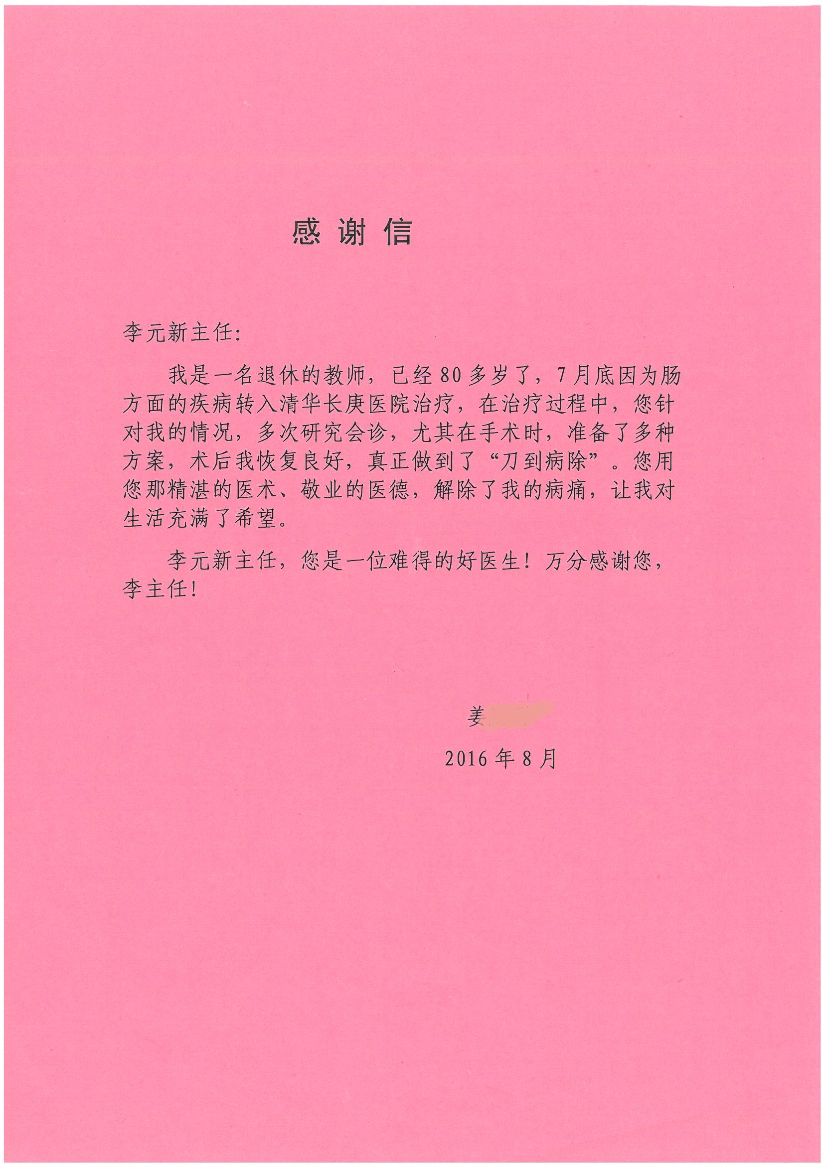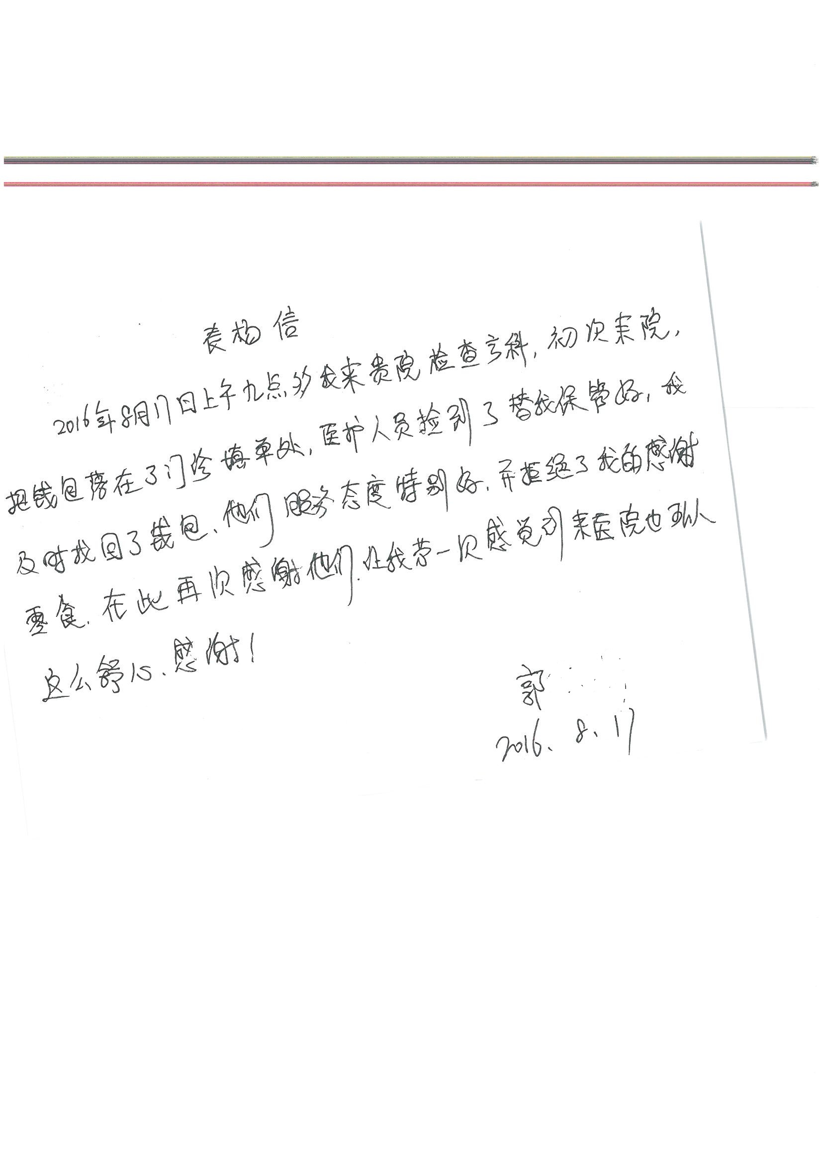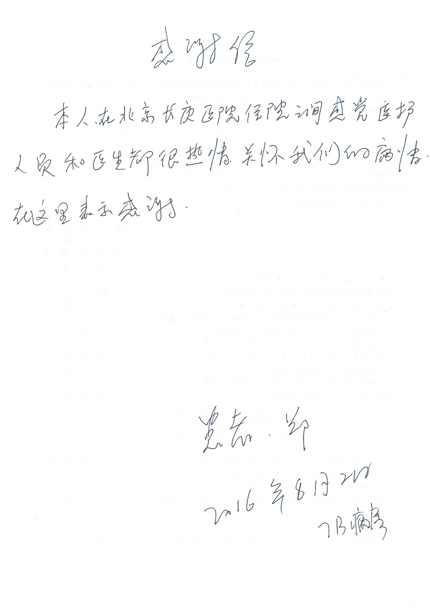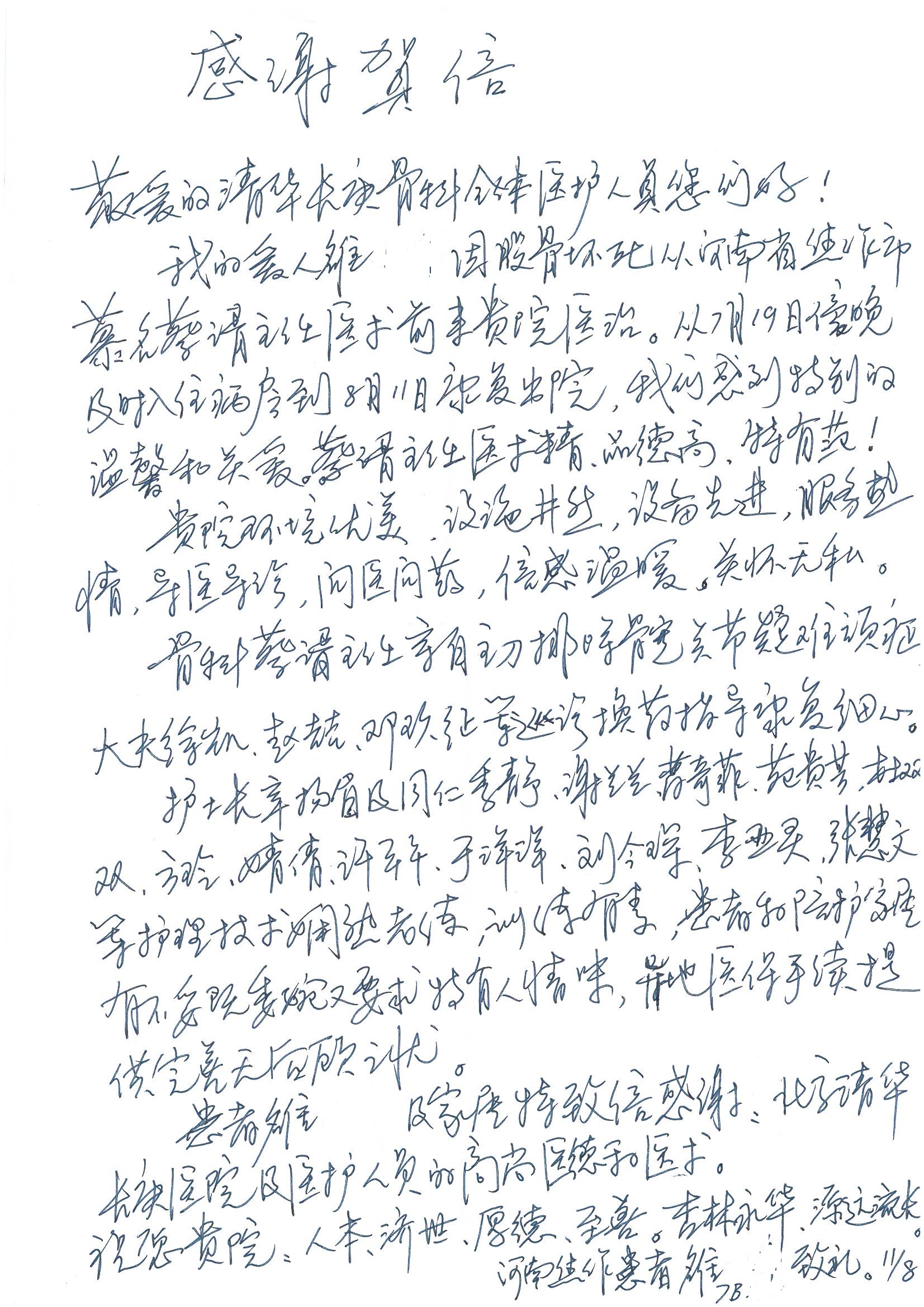 2016年8月,我院共接到患者及家属感谢信63封,其中肝胆外科董家鸿主任医师、张洪义主任医师、张跃伟主任医师、曾建平主治医师、王学栋医师、于里涵医师,神经外科王贵怀主任医师,普通外科罗斌主任医师、李元新主任医师、张鹏主治医师、刘安阳医师,骨科肖嵩华主任医师、潘勇卫主任医师、蔡谞主任医师、陈连旭副主任医师、宋飞主治医生、赵喆主治医师、朱剑津医师、邓玖征医师、付立功医师、孙长鲛医师、何大炜医师、徐凯医师、陈强医师、黄鑫医师,血管外科吴巍巍副主任医师、赵俊来医师、曹战江医师,心脏内科缪国斌主任医师、薛亚军主治医师,肾脏内科李月红主任医师、王炜主治医师、陈瑞医师,消化内科相马宁主任医师,血液内科李墨丹医师,儿科孟洪医师,康复科潘钰主任医师、萧演清医师、徐泉医师、阎澍妤医师、杨晓辉、马春岳、屠媛媛、邹丽丽、樊森朝、付莉莉、张丽春、尹航、陈固稳,内分泌科肖建中主任医师,皮肤科陈典医师,眼科胡运韬主任医师、刘瑄副主任医师、司山成医师、王奇骅医师、纪一聪,耳鼻喉科伊海金副主任医师、李欣副主任医师、许嘉医师,急诊科宋琳琳主治医师,医事处范丹梅,药剂科闫玉莹、杨学斌、李成玉、张心悦,护理部许洋洋、李梦雅、王梦瑶、李怡然、许丽丽、张晓宇、李亚灵、李冰、王秋惠、李双双、张传云、王慧颖、徐欣慧、徐宁、张苹、李彩云、辛扬眉、张慧文、郭婧倩、宋辉辉、季静、谢兰兰、曹奇菲、苑贵芳、杜双双、方玲、许平平、于洋洋、刘宇琛、郑爽、梁佳玉、陈莹、李硕、王梦瑶、于萍萍、苏贵云、杨旭东、辛扬眉、郑农、方玲、曹奇菲、带海栾、尹雪以及眼科、心脏内科、神经外科、动态心电图室、血管外科、耳鼻喉头颈外科全体医护人员,儿科全体护理人员,儿科收费处收到具名表扬。特此公告,以资鼓励!