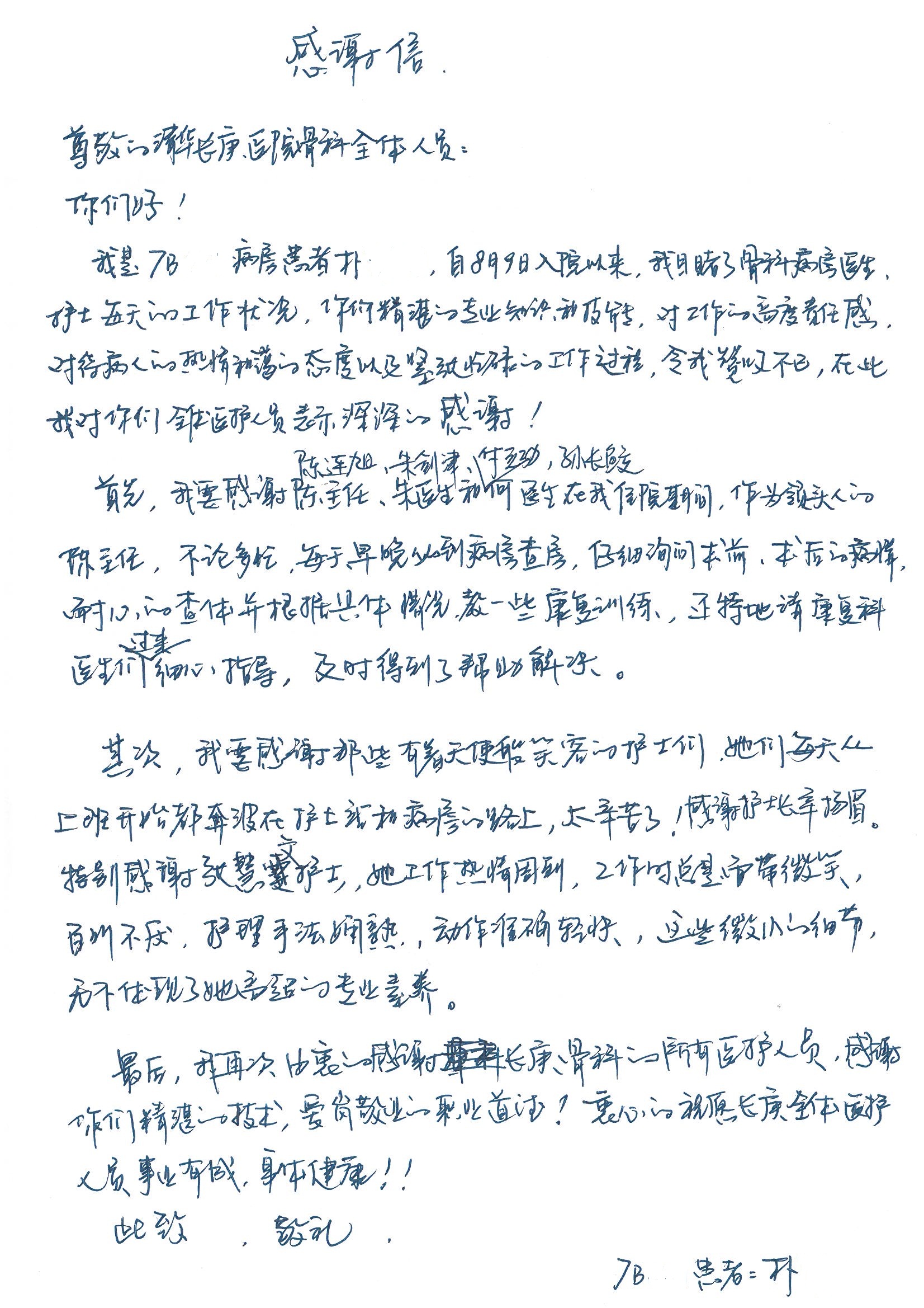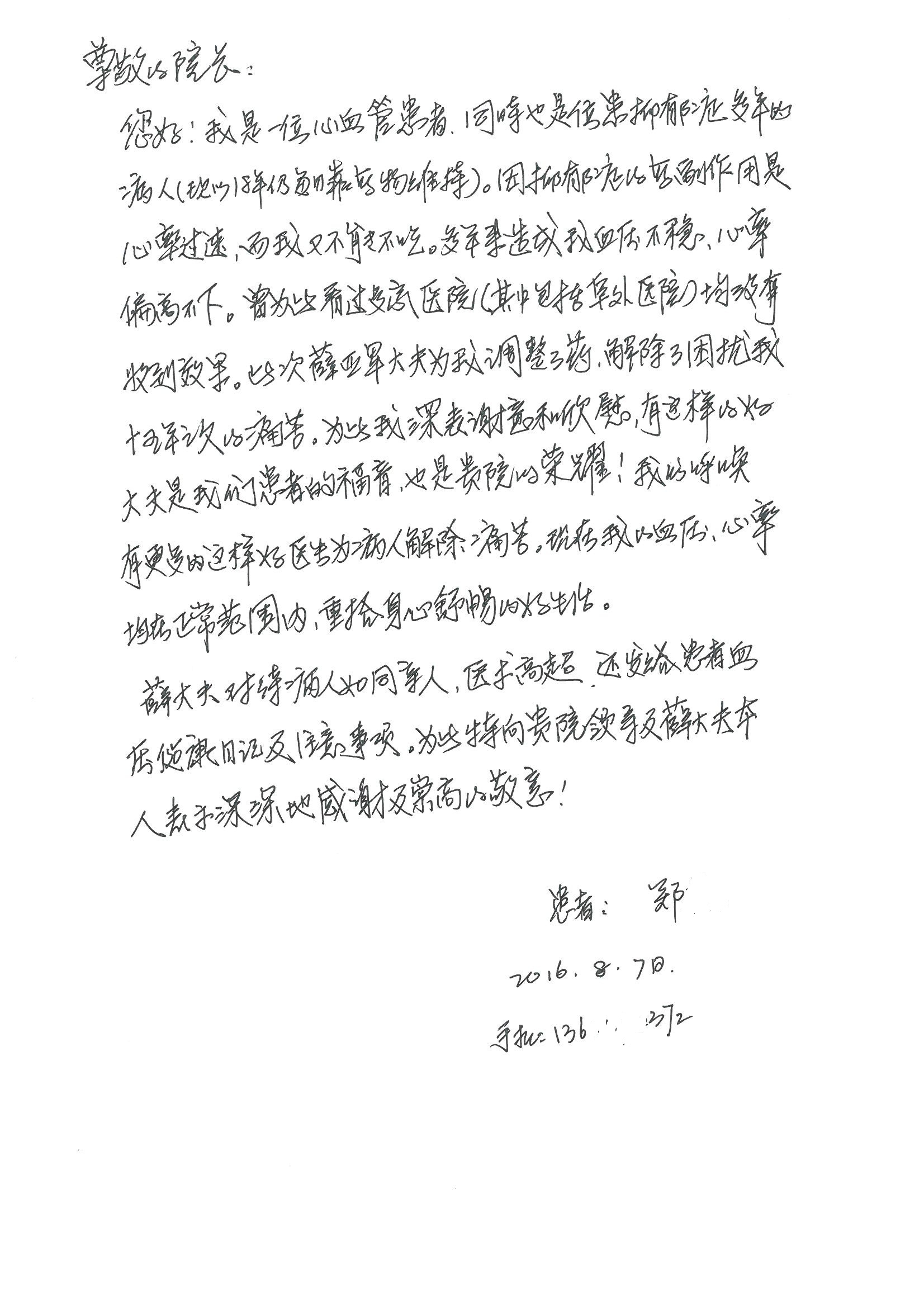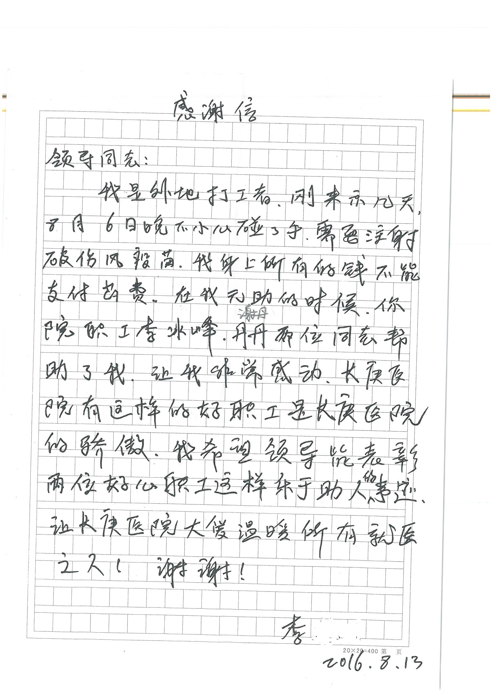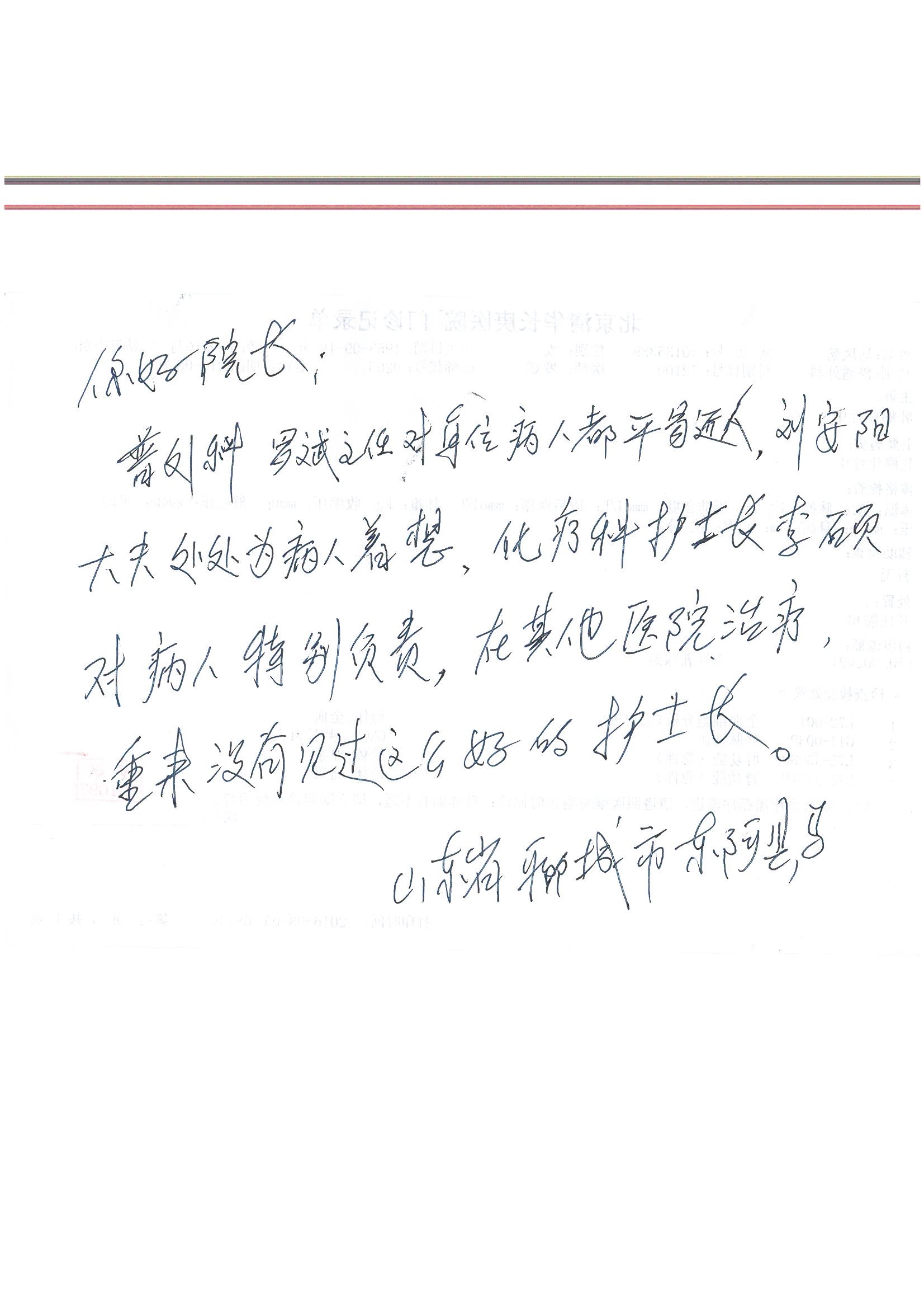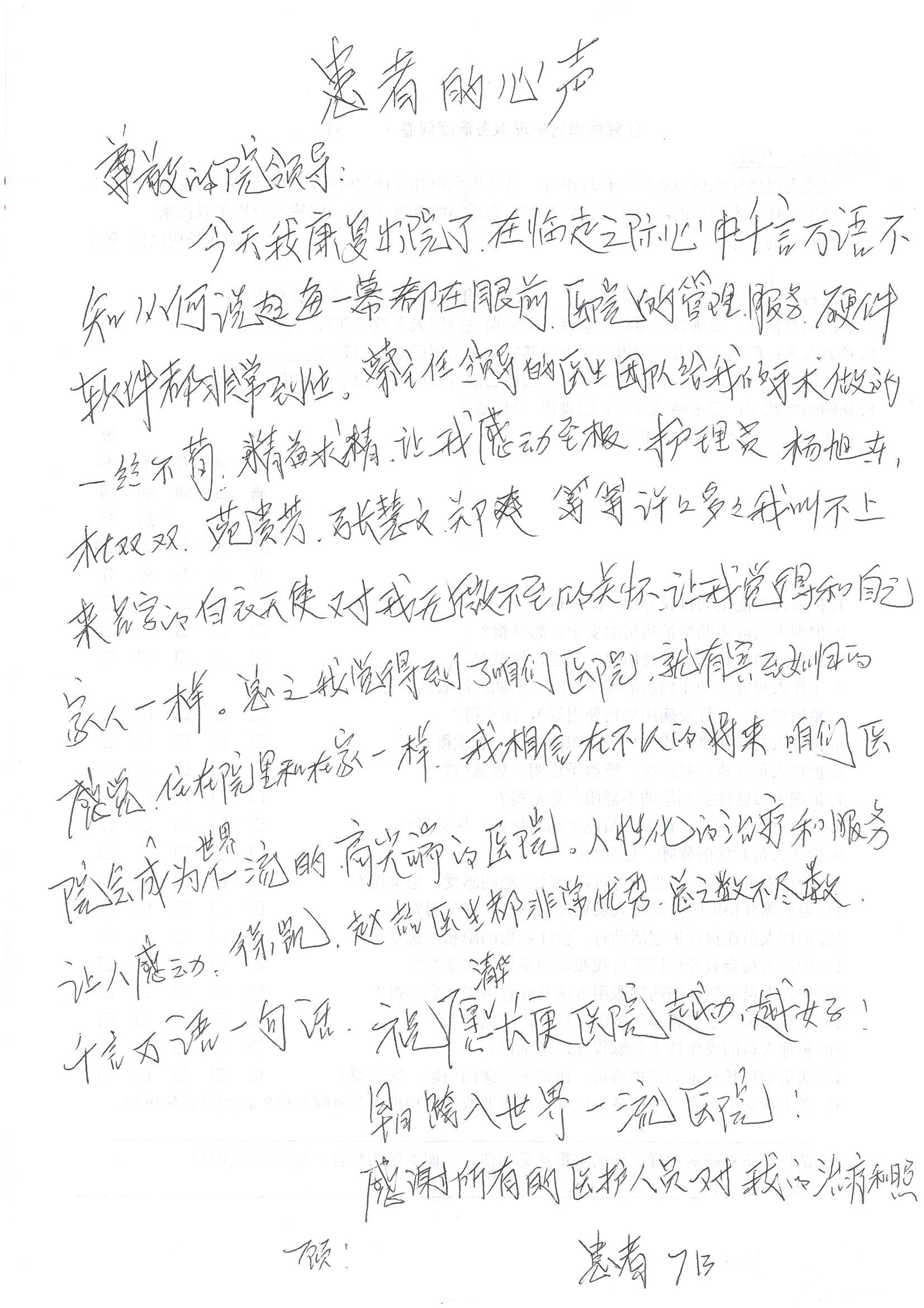 2016年8月,我院共接到患者及家属感谢信63封,其中肝胆外科董家鸿主任医师、张洪义主任医师、张跃伟主任医师、曾建平主治医师、王学栋医师、于里涵医师,神经外科王贵怀主任医师,普通外科罗斌主任医师、李元新主任医师、张鹏主治医师、刘安阳医师,骨科肖嵩华主任医师、潘勇卫主任医师、蔡谞主任医师、陈连旭副主任医师、宋飞主治医生、赵喆主治医师、朱剑津医师、邓玖征医师、付立功医师、孙长鲛医师、何大炜医师、徐凯医师、陈强医师、黄鑫医师,血管外科吴巍巍副主任医师、赵俊来医师、曹战江医师,心脏内科缪国斌主任医师、薛亚军主治医师,肾脏内科李月红主任医师、王炜主治医师、陈瑞医师,消化内科相马宁主任医师,血液内科李墨丹医师,儿科孟洪医师,康复科潘钰主任医师、萧演清医师、徐泉医师、阎澍妤医师、杨晓辉、马春岳、屠媛媛、邹丽丽、樊森朝、付莉莉、张丽春、尹航、陈固稳,内分泌科肖建中主任医师,皮肤科陈典医师,眼科胡运韬主任医师、刘瑄副主任医师、司山成医师、王奇骅医师、纪一聪,耳鼻喉科伊海金副主任医师、李欣副主任医师、许嘉医师,急诊科宋琳琳主治医师,医事处范丹梅,药剂科闫玉莹、杨学斌、李成玉、张心悦,护理部许洋洋、李梦雅、王梦瑶、李怡然、许丽丽、张晓宇、李亚灵、李冰、王秋惠、李双双、张传云、王慧颖、徐欣慧、徐宁、张苹、李彩云、辛扬眉、张慧文、郭婧倩、宋辉辉、季静、谢兰兰、曹奇菲、苑贵芳、杜双双、方玲、许平平、于洋洋、刘宇琛、郑爽、梁佳玉、陈莹、李硕、王梦瑶、于萍萍、苏贵云、杨旭东、辛扬眉、郑农、方玲、曹奇菲、带海栾、尹雪以及眼科、心脏内科、神经外科、动态心电图室、血管外科、耳鼻喉头颈外科全体医护人员,儿科全体护理人员,儿科收费处收到具名表扬。特此公告,以资鼓励!