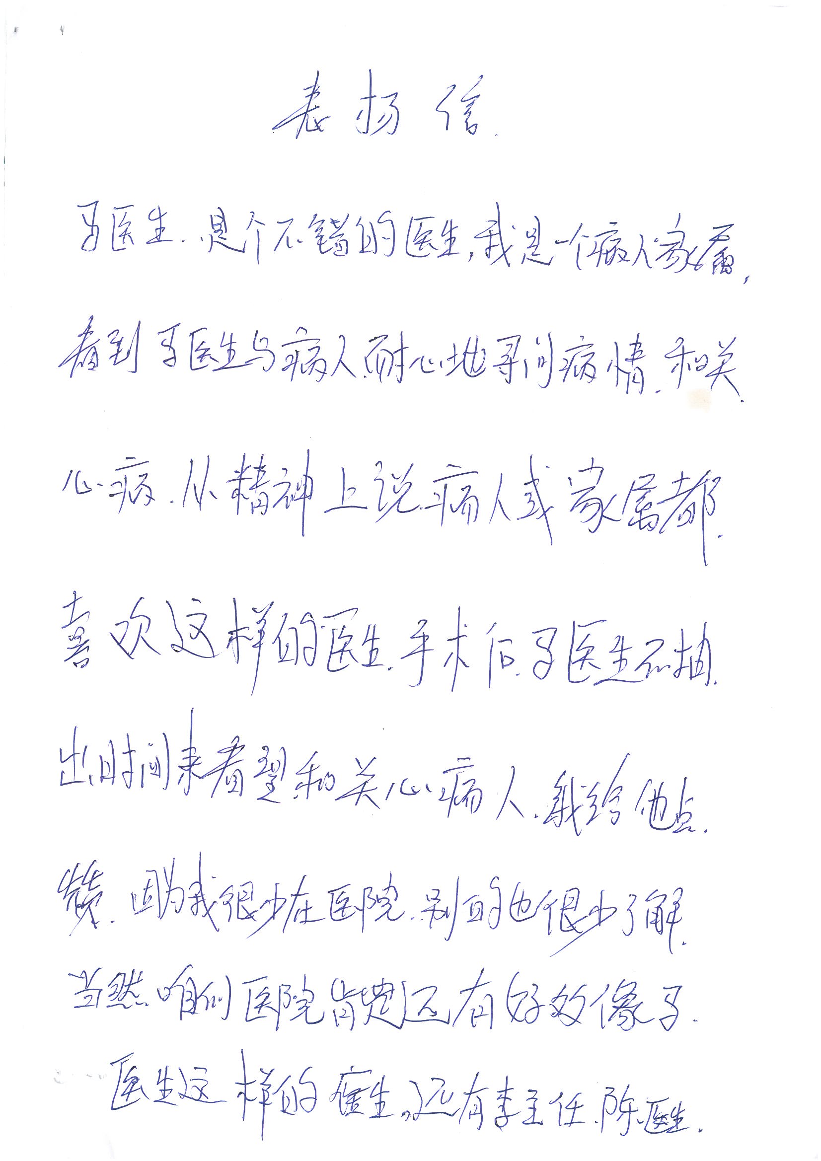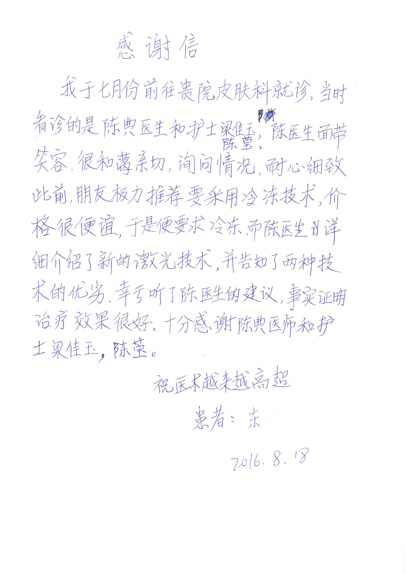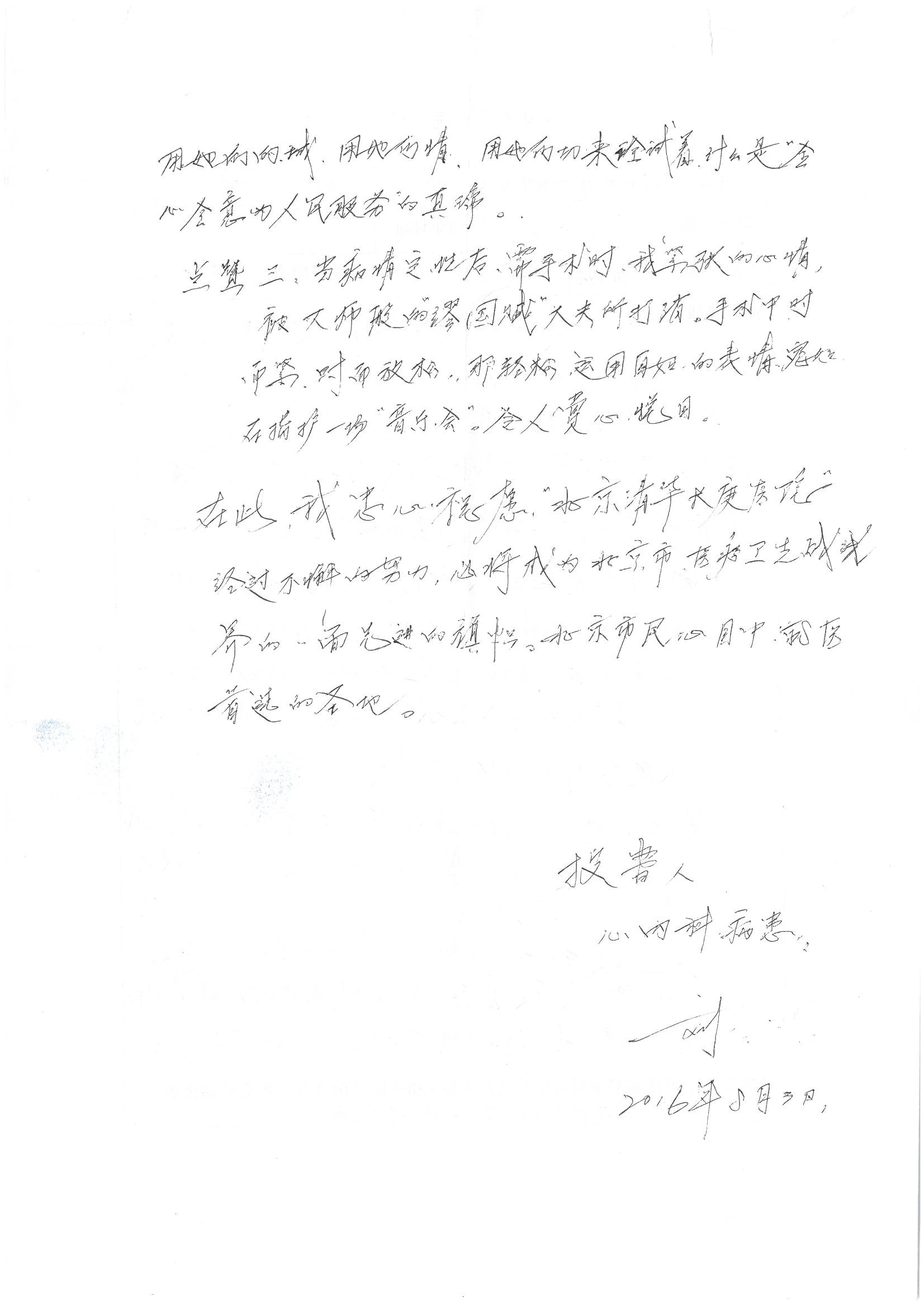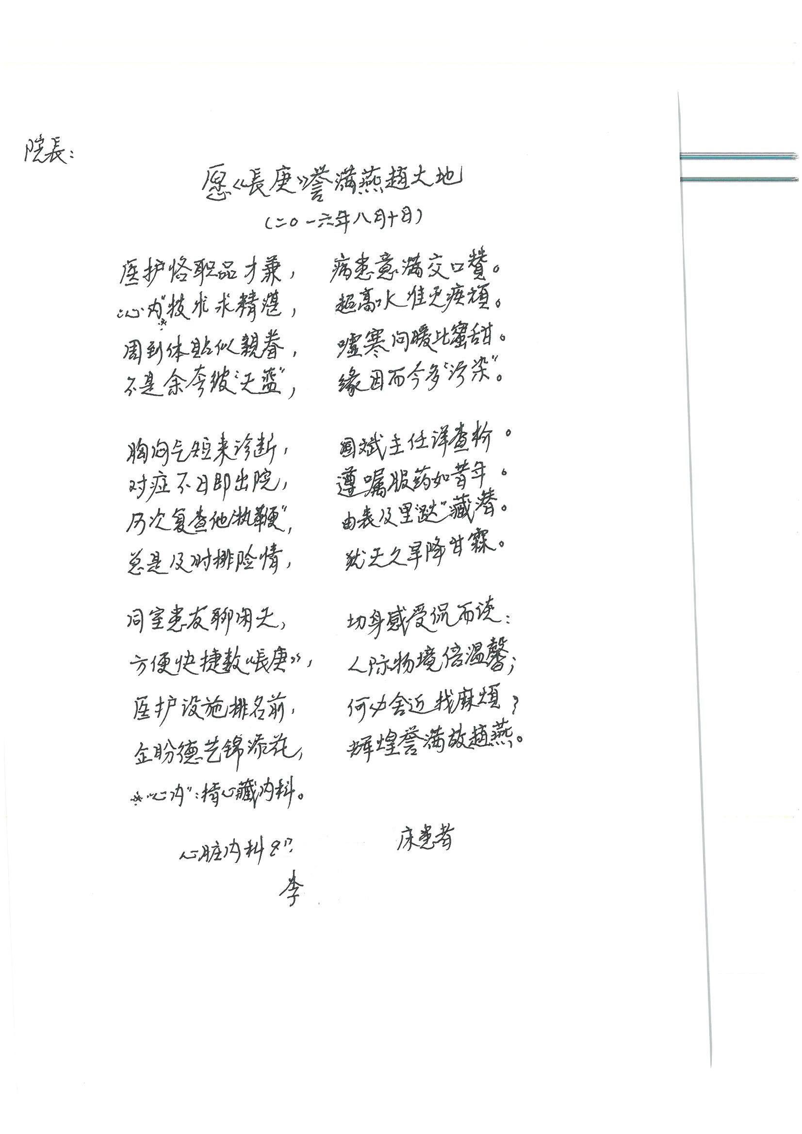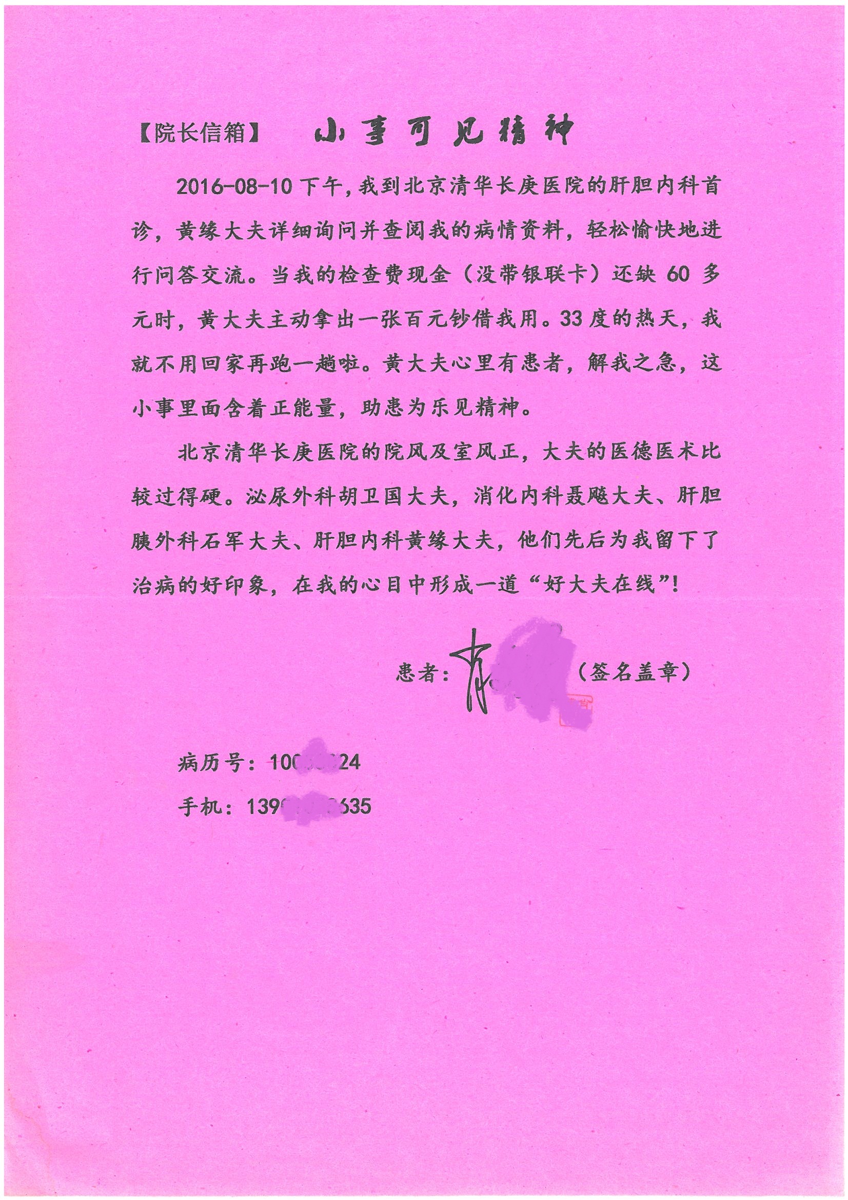 2016年8月,我院共接到患者及家属感谢信63封,其中肝胆外科董家鸿主任医师、张洪义主任医师、张跃伟主任医师、曾建平主治医师、王学栋医师、于里涵医师,神经外科王贵怀主任医师,普通外科罗斌主任医师、李元新主任医师、张鹏主治医师、刘安阳医师,骨科肖嵩华主任医师、潘勇卫主任医师、蔡谞主任医师、陈连旭副主任医师、宋飞主治医生、赵喆主治医师、朱剑津医师、邓玖征医师、付立功医师、孙长鲛医师、何大炜医师、徐凯医师、陈强医师、黄鑫医师,血管外科吴巍巍副主任医师、赵俊来医师、曹战江医师,心脏内科缪国斌主任医师、薛亚军主治医师,肾脏内科李月红主任医师、王炜主治医师、陈瑞医师,消化内科相马宁主任医师,血液内科李墨丹医师,儿科孟洪医师,康复科潘钰主任医师、萧演清医师、徐泉医师、阎澍妤医师、杨晓辉、马春岳、屠媛媛、邹丽丽、樊森朝、付莉莉、张丽春、尹航、陈固稳,内分泌科肖建中主任医师,皮肤科陈典医师,眼科胡运韬主任医师、刘瑄副主任医师、司山成医师、王奇骅医师、纪一聪,耳鼻喉科伊海金副主任医师、李欣副主任医师、许嘉医师,急诊科宋琳琳主治医师,医事处范丹梅,药剂科闫玉莹、杨学斌、李成玉、张心悦,护理部许洋洋、李梦雅、王梦瑶、李怡然、许丽丽、张晓宇、李亚灵、李冰、王秋惠、李双双、张传云、王慧颖、徐欣慧、徐宁、张苹、李彩云、辛扬眉、张慧文、郭婧倩、宋辉辉、季静、谢兰兰、曹奇菲、苑贵芳、杜双双、方玲、许平平、于洋洋、刘宇琛、郑爽、梁佳玉、陈莹、李硕、王梦瑶、于萍萍、苏贵云、杨旭东、辛扬眉、郑农、方玲、曹奇菲、带海栾、尹雪以及眼科、心脏内科、神经外科、动态心电图室、血管外科、耳鼻喉头颈外科全体医护人员,儿科全体护理人员,儿科收费处收到具名表扬。特此公告,以资鼓励!