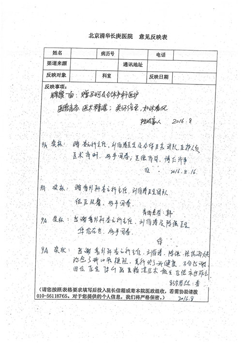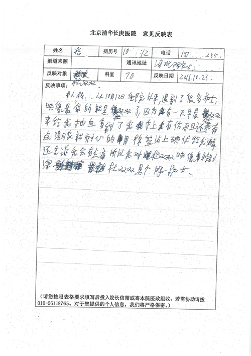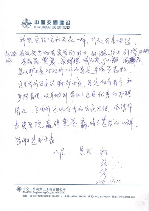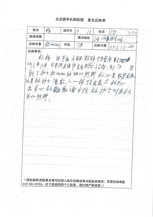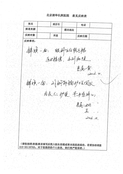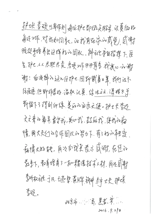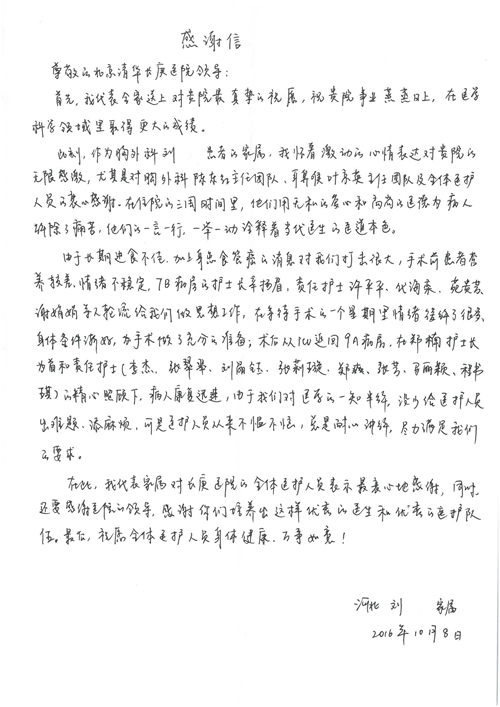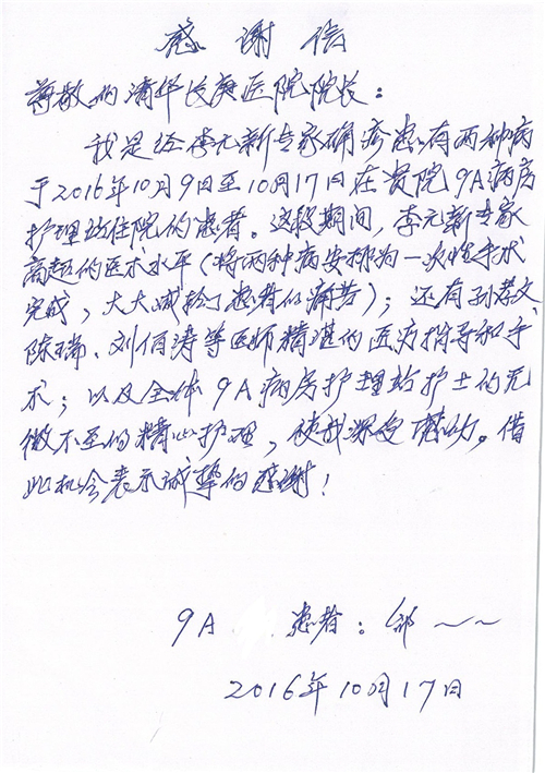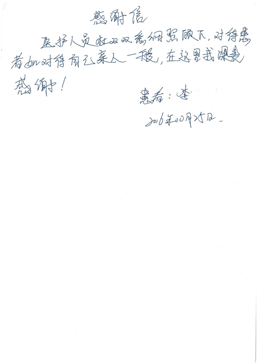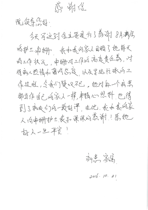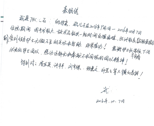 2016年10月,我院共接到患者及家属感谢信43封,其中肝胆外科韩东冬副主任医师、石军副主任医师、曾建平主治医师、公磊医师、袁玉娥医师,神经外科张培海医师,普通外科李元新主任医师、刘伯涛主治医师、汤洁莹医师、陈强医师、孙孝文医师、陈瑞医师,骨科陈连旭副主任医师,泌尿外科王澍医师,胸腔外科陈东红副主任医师、杨帆主治医师、朱伟鹏医师,心脏内科张金萍医师、王昊天医师、李雪,神经内科武剑主任医师、黄丽主治医师,肾脏内科庄震主治医师,消化内科聂飚副主任医师、刘佳文主治医师、王佳主治医师、李思源医师,血液内科李昕权主任医师、于凡主治医师、黄月华主治医师、王燕婴医师、乔宇医师、钱坤医师、谌琦医师,妇产科马珂主治医师、刘瑛医师,眼科胡运韬主任医师、司山成医师,中医科王颖莹,耳鼻咽喉-头颈外科叶京英主任医师、尹国平主治医师、胡斌医师,急诊科王非主治医师、龚晓杰主治医师、徐婷主治医师,医事处杨新蕊,护理部辛扬眉、许平平、代海栾、苑贵芳、谢娟娟、郑楠、李杰、张翠翠、刘晶钰、张莉璇、郑爽、张芳、马丽颖、程书琪、申姗、袁雪丽、孙璐、刘洛、李晶晶、贾晨、宋辉辉、荆红英、于小梅、高飞、杜双双、王子秋、刘灿、孟瑶、吴琼、李硕、张文文、李亚灵、刘宇琛、张惠文、郭莹莹以及蔺宏伟医师团队、李元新医师团队、郑楠护士团队、陈东红医师团队、叶京英医师团队,神经内科、妇产科、眼科全体医护人员,9A全体护士收到具名表扬。特此公告,以资鼓励!