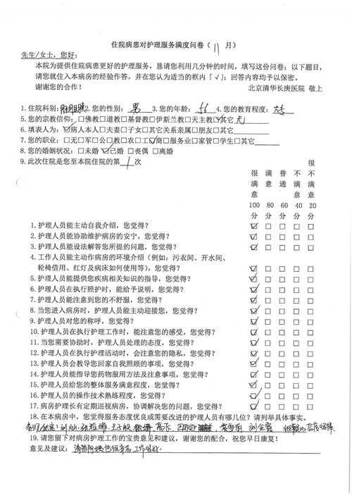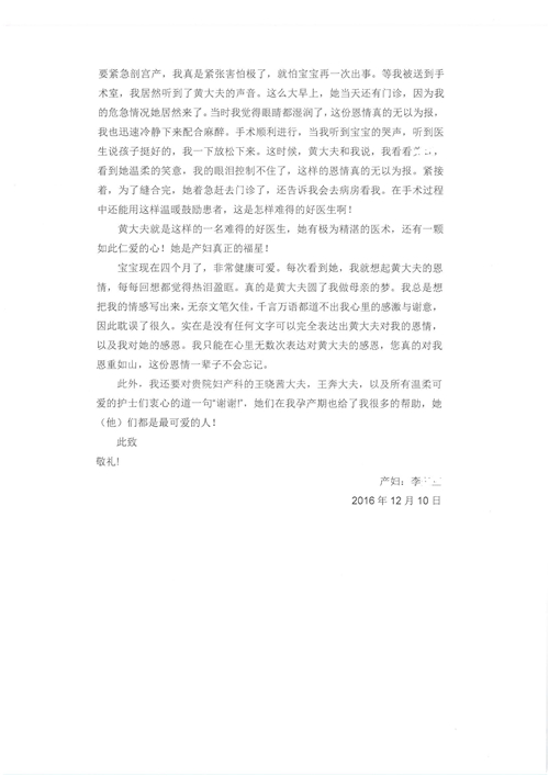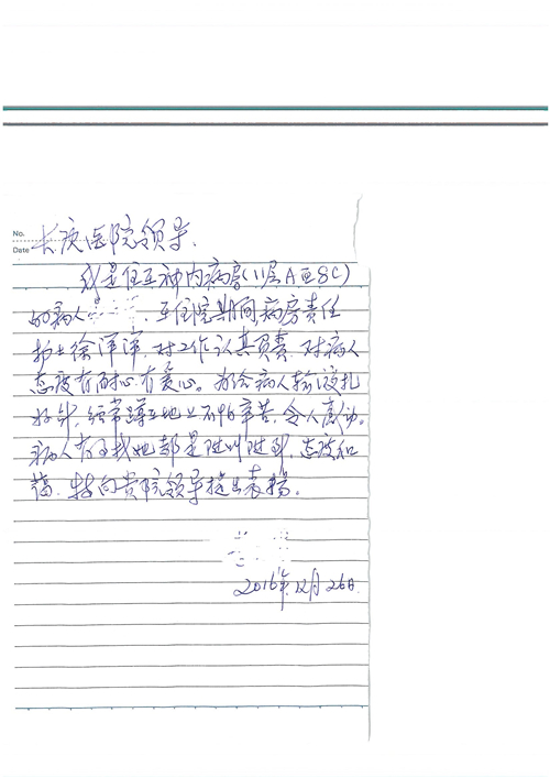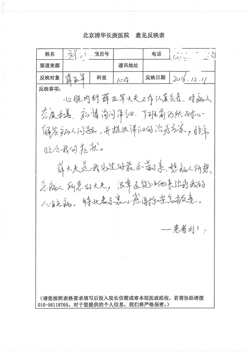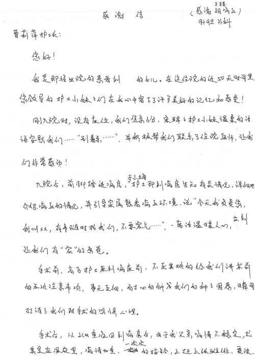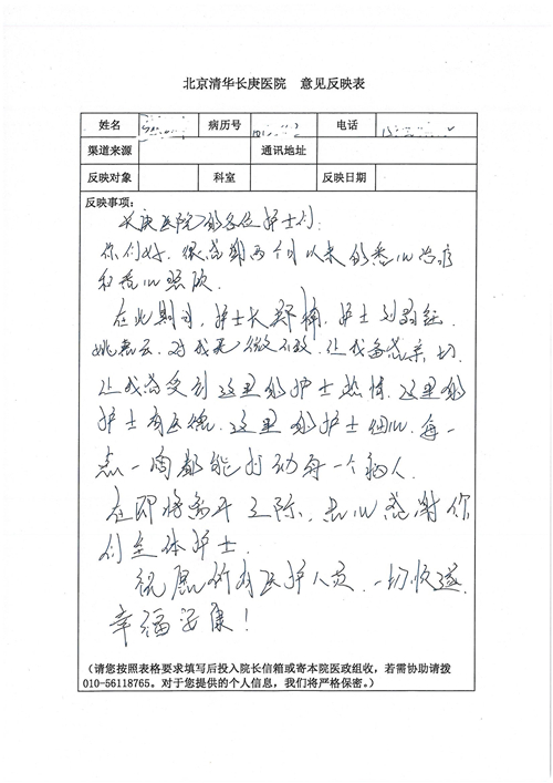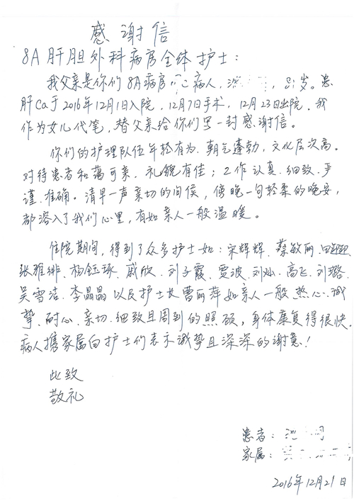 2016年12月,我院共接到患者及家属感谢信81封,其中肝胆外科董家鸿主任医师、张洪义主任医师、张跃伟主任医师、石军副主任医师、韩东冬副主任医师、项灿宏副主任医师、公磊医师、杨世伟医师、汤睿医师、李昂医师、袁玉斌医师,普通外科罗斌主任医师、李元新主任医师、刘伯涛主治医师、白熠州主治医师、汤洁莹医师、赵传多医师、朱融融医师,骨科肖嵩华主任医师、宋飞主治医师、杨华东主治医师、顾苏熙主治医师,泌尿外科张鑫副主任医师、王澍医师,心脏内科张萍主任医师、缪国斌主任医师、薛亚军主治医师,肾脏内科李月红主任医师、庄震主治医师,消化内科相马宁主任医师、刘佳文主治医师,血液及肿瘤内科刘兆祥住院医师,妇产科黄振宇副主任医师、张蕾副主任医师、马珂副主任医师、刘晨副主任医师、刘瑛医师、王奔医师、王晓茜医师,儿科季丽娜副主任医师,内分泌科蓸沉香主治医师,眼科胡胡运韬主任医师、郭立斌副主任医师、司山成医师,耳鼻咽喉头颈外科叶京英主任医师、伊海金副主任医师、尹国平主治医师,急诊科周杰医师,ICU许媛主任医师,医事处李俊男,保卫处马班长,保洁员刘玉芳,护理部袁雪丽、吴雪洁、李伟伟、孙璐、蔡敏丽、李晶晶、秦蒙蒙、于小梅、张雅绯、周圆、王子秋、刘子霞、贾波、高飞、曹艳飞、田迎迎、甄娇、王嘉琦、申姗、李晶晶、宋辉辉、荆红英、张保乾、刘灿、杨钰琢、贾晨、高雅、曹莉萍、戚欣、刘金霞、曹明霞、杨旭东、叶露、李文静、李慧、林景熠、王梦瑶、许丽、杨秀玉、徐洋洋、许平平、谢娟娟、谢兰兰、季静、郭莹莹、代海栾、苑贵芳、杜双双、李亚灵、张慧文、方玲、于洋洋、黄婧倩、刘宇琛、李冰、赵金立、刘天玉、杨凯、赵宝晶、张晓岚、刘盼、陈晓红、赵杰、王宇、赵金立、郑楠、刘晶钰、姚惠云、许乐、周小懿、郑爽、李杰、李双双、姜欣悦、潘景娜、张东鑫、李梦莹、宋研研、范李璐以及缪国斌医护团队,心脏内科、骨科、血管外科、肝胆外科、妇产科、ICU、肾脏内科全体医护人员,6B、9A、普通外科全体护士收到具名表扬。特此公告,以资鼓励!