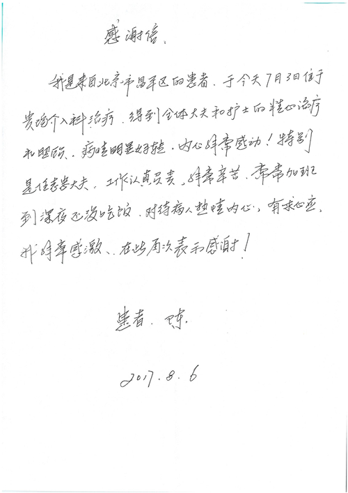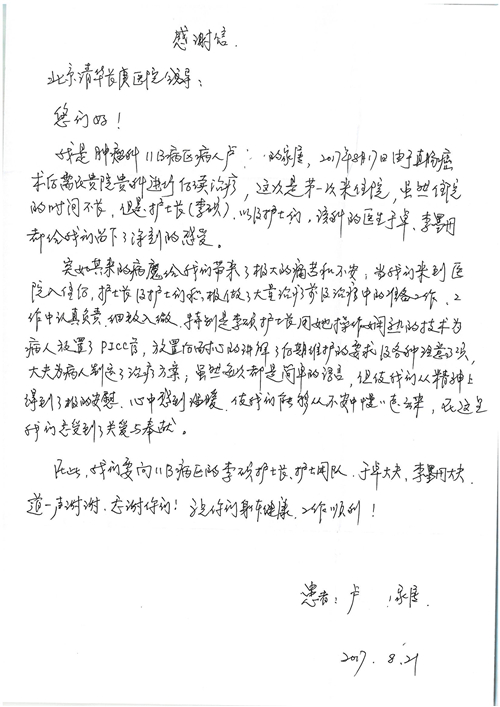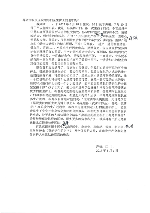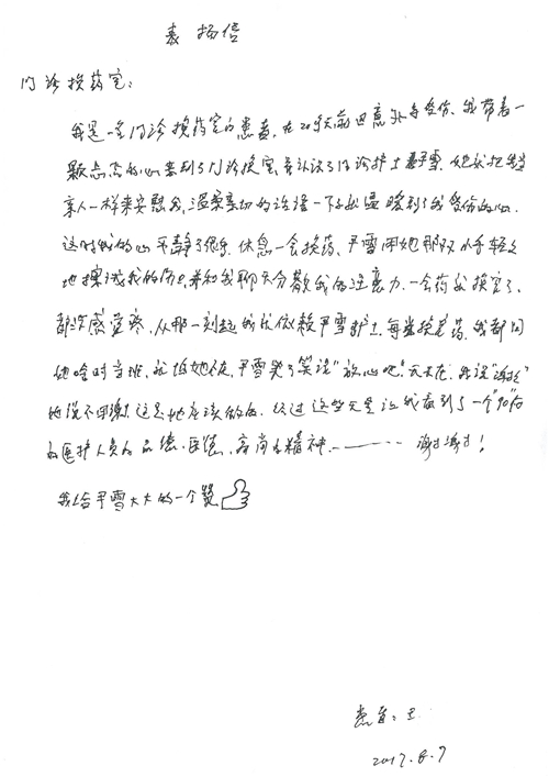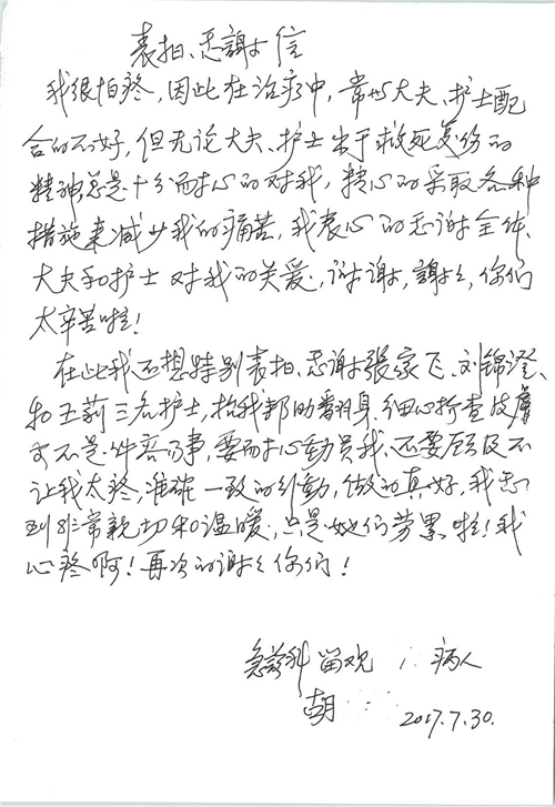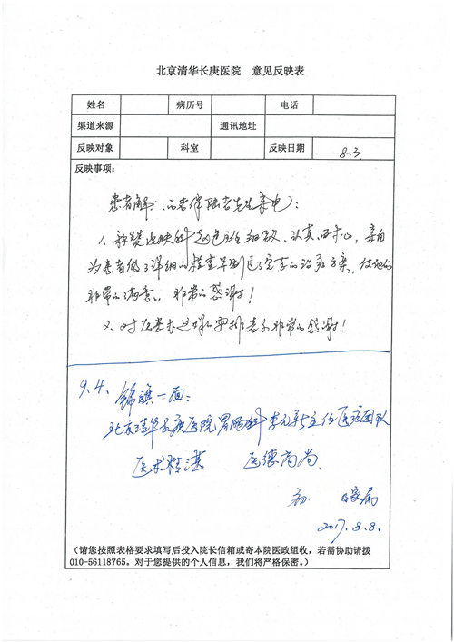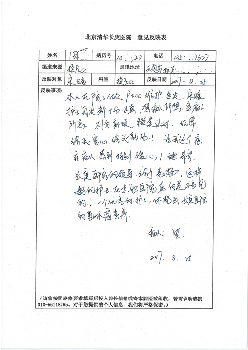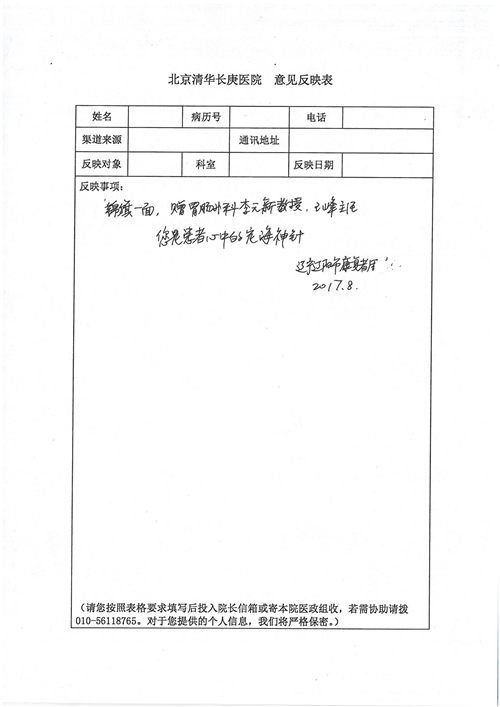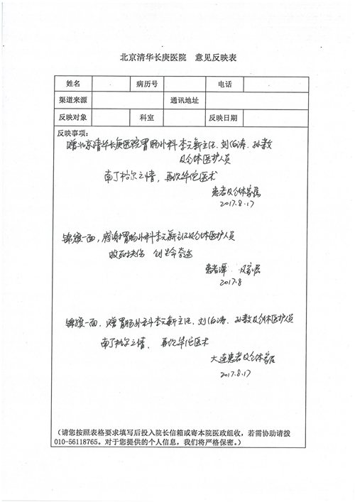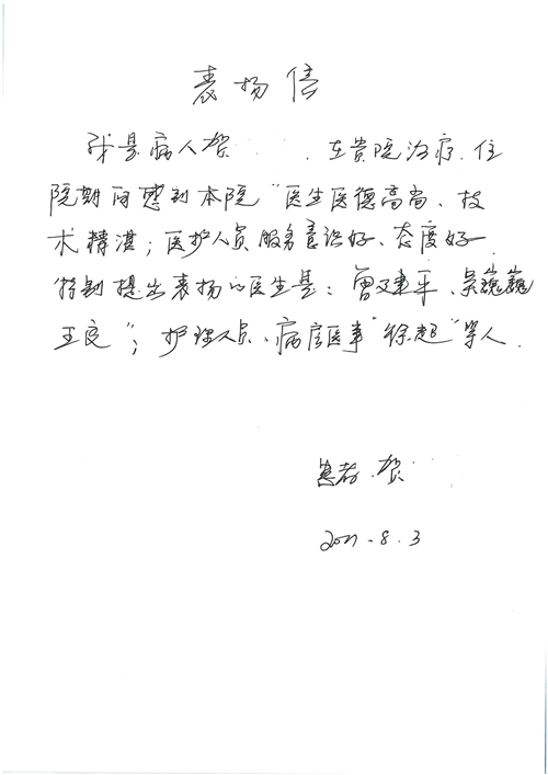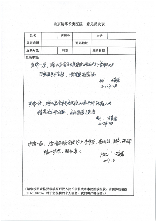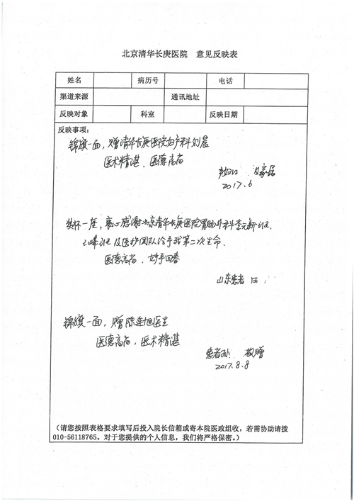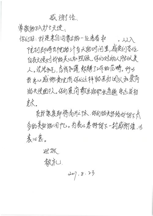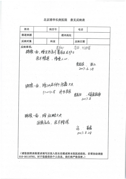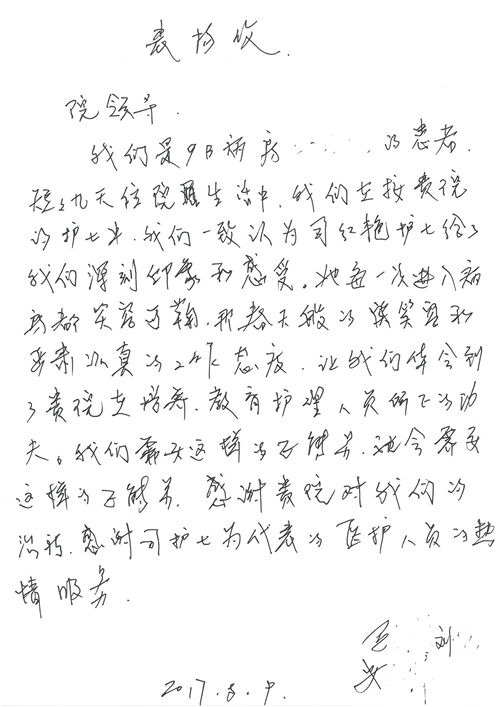 2017年8月,我院共接到患者及家属感谢信49封,其中肝胆外科张跃伟主任医师、曾建平主治医师、王良医师、任志忠医师;胃肠外科李元新主任医师、蔺宏伟副主任医师、王峰副主任医师、刘伯涛主治医师、张鹏主治医师、孙孝文医师;骨科陈连旭主任医师;血管外科吴巍巍主任医师;泌尿外科张鑫主任医师;胸腔外科陈东红副主任医师、杨帆主治医师、苏博兴医师;疼痛治疗科刘芳主治医师;心脏外科沈冬焱副主任医师、李永超医师;心脏内科缪国斌主任医师、王昊天主治医师;呼吸内科王立万副主任医师;血液肿瘤内科于卓副主任医师、李墨丹医师;妇产科廖秦平主任医师、张蕾副主任医师、黄振宇副主任医师、马珂副主任医师、刘晨副主任医师、杨曦主治医师、薛瑶主治医师、陈锐医师;康复医学科张丽春、周鑫;皮肤科赵邑主任医师、陈典主治医师;口腔科谭雍慧医师;眼科何凯;中医科秦建婷主治医师;耳鼻咽喉头颈外科伊海金副主任医师;急诊科张向阳副主任医师、葛厚印医师;医事处刘艳凤、徐超、范丹梅;保卫处万磊;护理部李硕、范李露、宋暖、张丽娜、武洪玥、张家飞、刘锦澄、王莉、蔡娟、陈岐、魏月秀、李丽、代秋菊、司红艳、艾盛月、李梦莹、崔润喆、孟婷、胡志华、王琳琳、尹雪;肖嵩华医护团队、李元新医护团队、廖秦平医护团队;妇产科、胃肠外科、急诊科全体医护人员及8A、妇产科门诊全体护士收到具名表扬。特此公告,以资鼓励!
