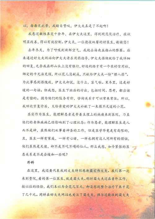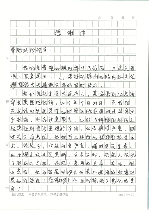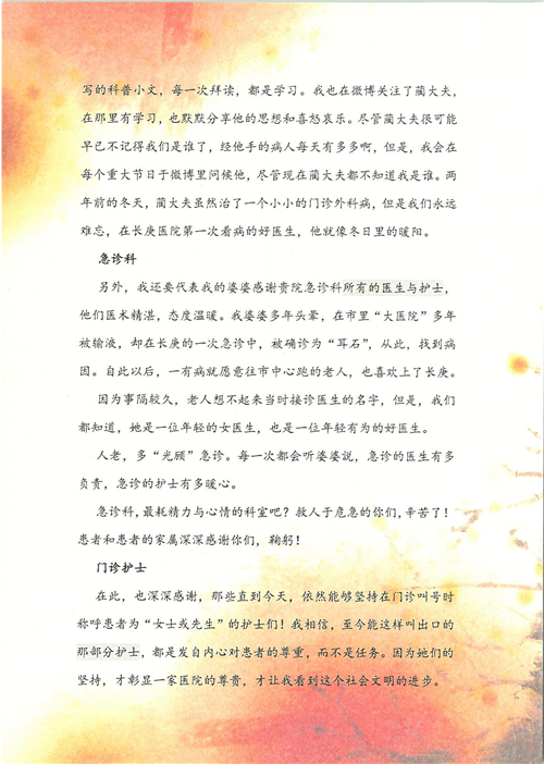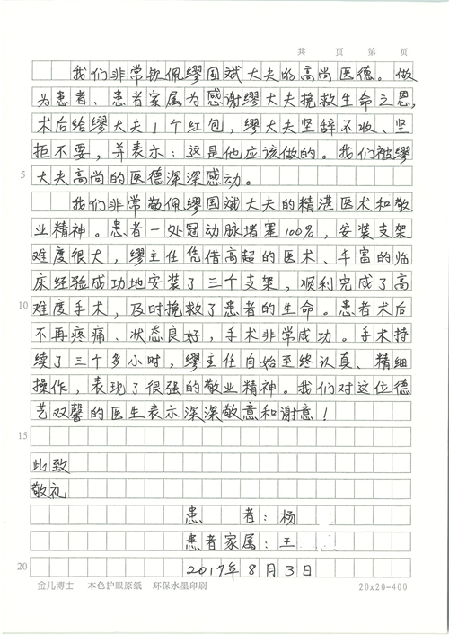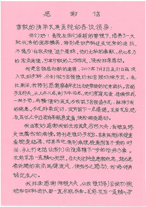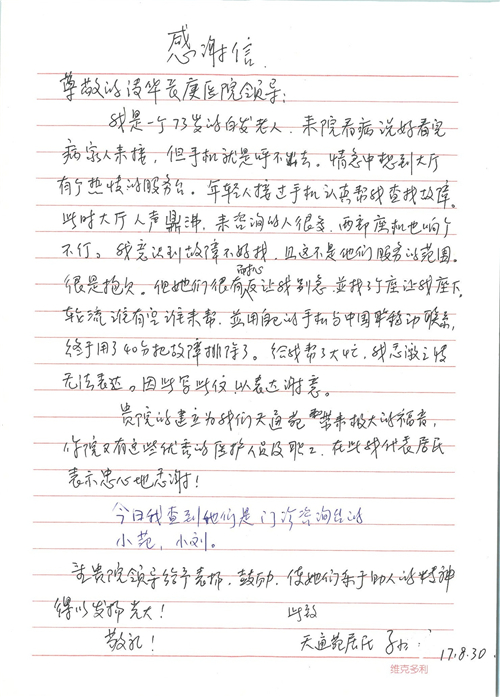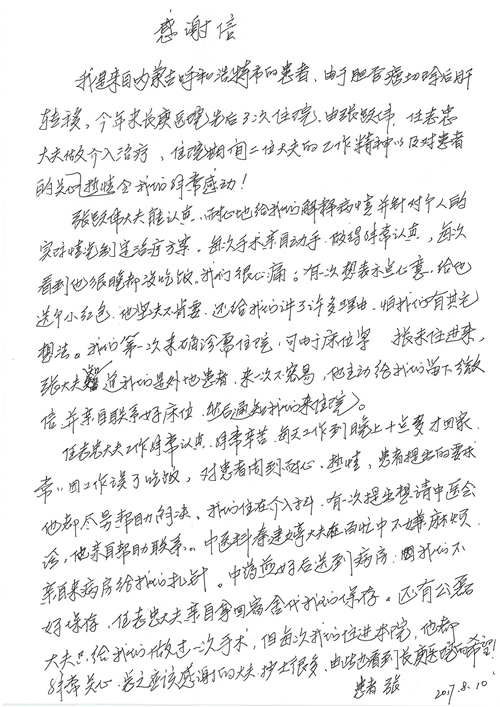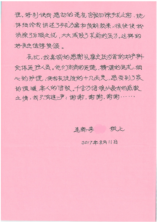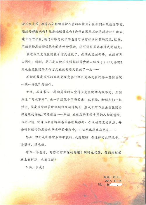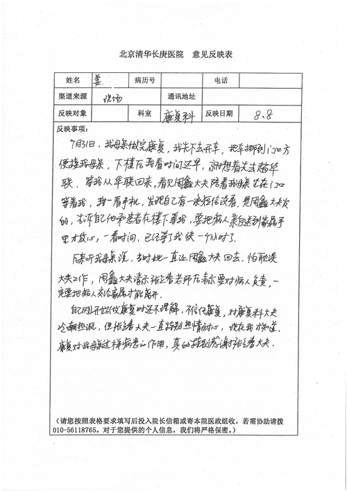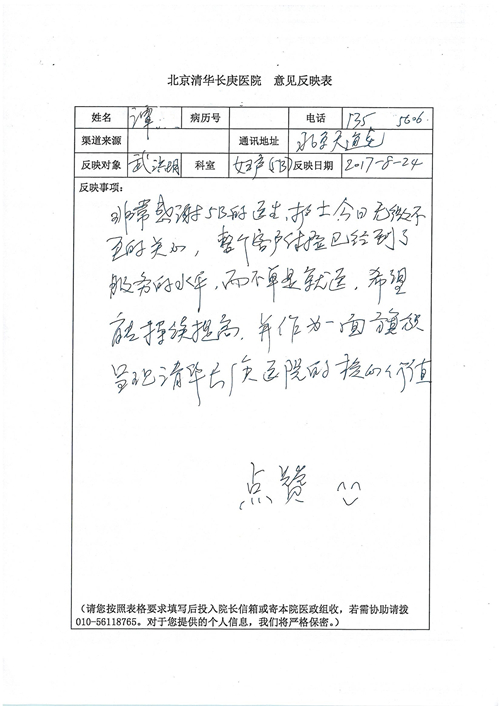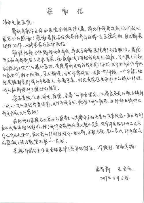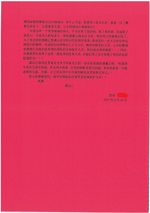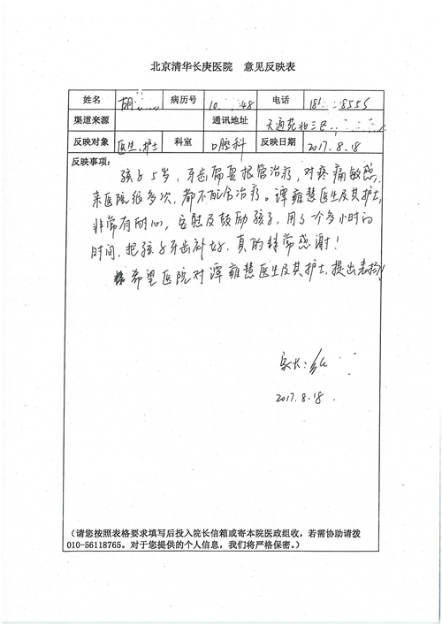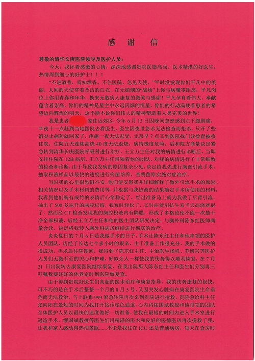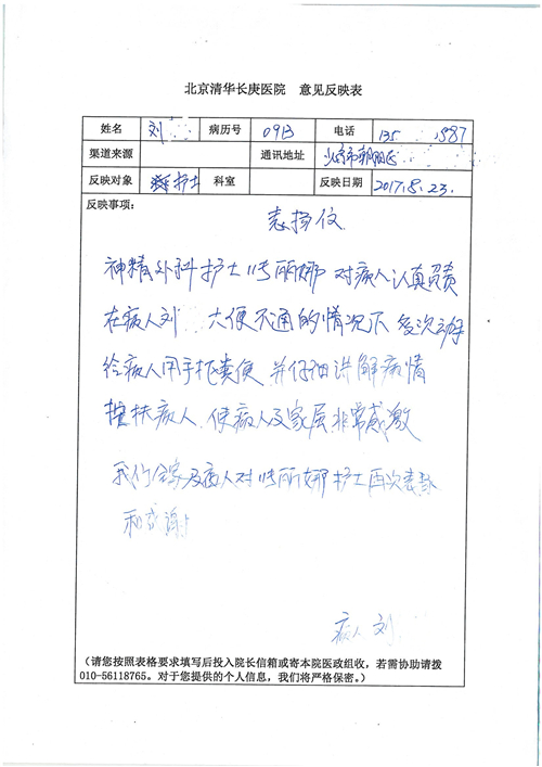 2017年8月,我院共接到患者及家属感谢信49封,其中肝胆外科张跃伟主任医师、曾建平主治医师、王良医师、任志忠医师;胃肠外科李元新主任医师、蔺宏伟副主任医师、王峰副主任医师、刘伯涛主治医师、张鹏主治医师、孙孝文医师;骨科陈连旭主任医师;血管外科吴巍巍主任医师;泌尿外科张鑫主任医师;胸腔外科陈东红副主任医师、杨帆主治医师、苏博兴医师;疼痛治疗科刘芳主治医师;心脏外科沈冬焱副主任医师、李永超医师;心脏内科缪国斌主任医师、王昊天主治医师;呼吸内科王立万副主任医师;血液肿瘤内科于卓副主任医师、李墨丹医师;妇产科廖秦平主任医师、张蕾副主任医师、黄振宇副主任医师、马珂副主任医师、刘晨副主任医师、杨曦主治医师、薛瑶主治医师、陈锐医师;康复医学科张丽春、周鑫;皮肤科赵邑主任医师、陈典主治医师;口腔科谭雍慧医师;眼科何凯;中医科秦建婷主治医师;耳鼻咽喉头颈外科伊海金副主任医师;急诊科张向阳副主任医师、葛厚印医师;医事处刘艳凤、徐超、范丹梅;保卫处万磊;护理部李硕、范李露、宋暖、张丽娜、武洪玥、张家飞、刘锦澄、王莉、蔡娟、陈岐、魏月秀、李丽、代秋菊、司红艳、艾盛月、李梦莹、崔润喆、孟婷、胡志华、王琳琳、尹雪;肖嵩华医护团队、李元新医护团队、廖秦平医护团队;妇产科、胃肠外科、急诊科全体医护人员及8A、妇产科门诊全体护士收到具名表扬。特此公告,以资鼓励!