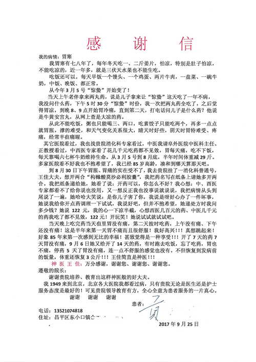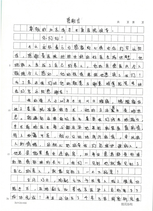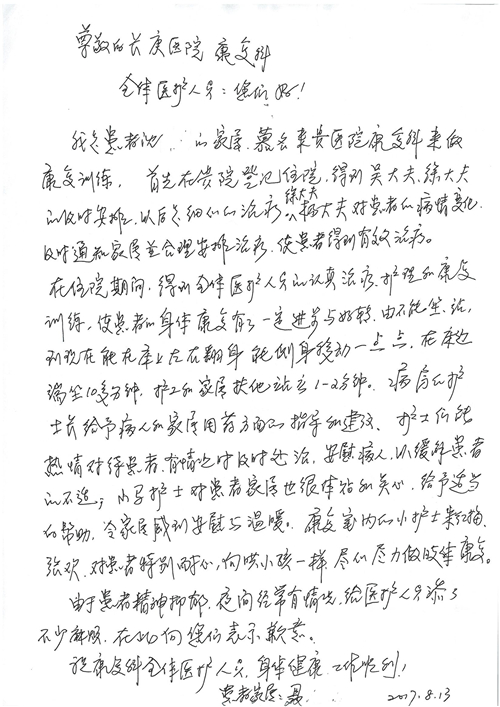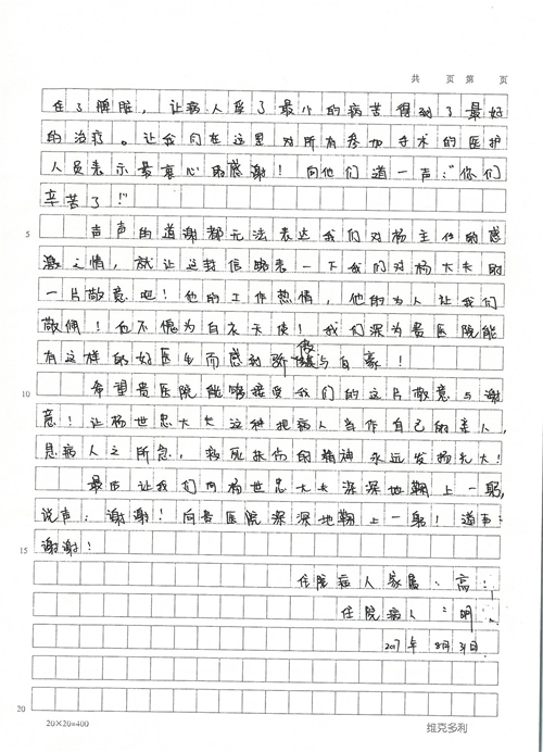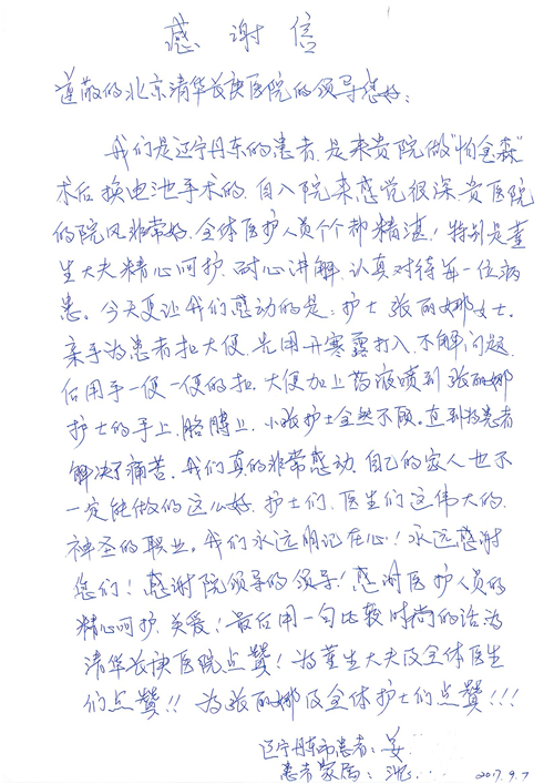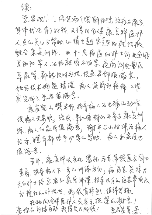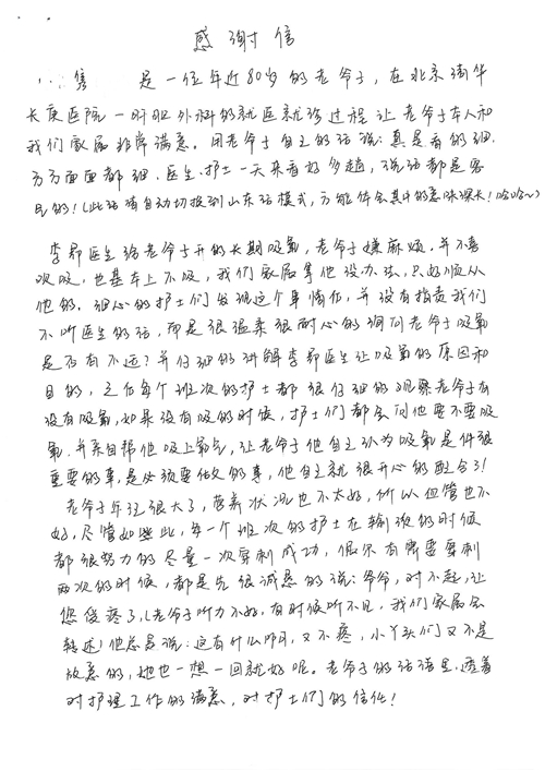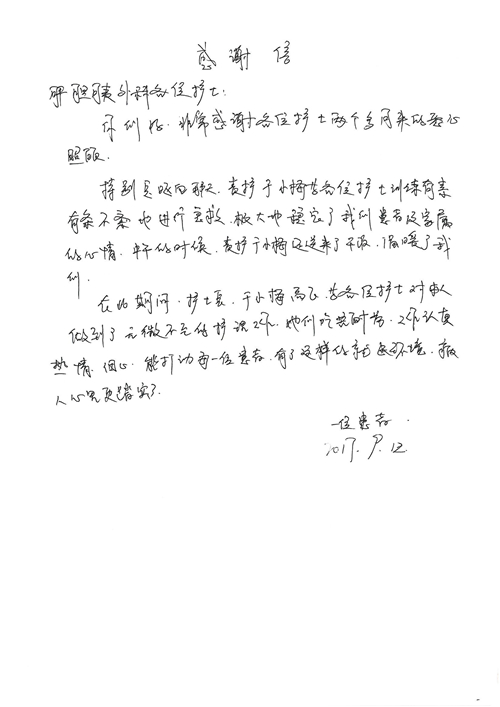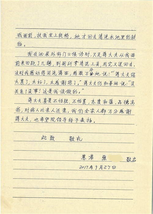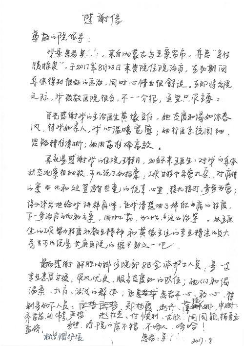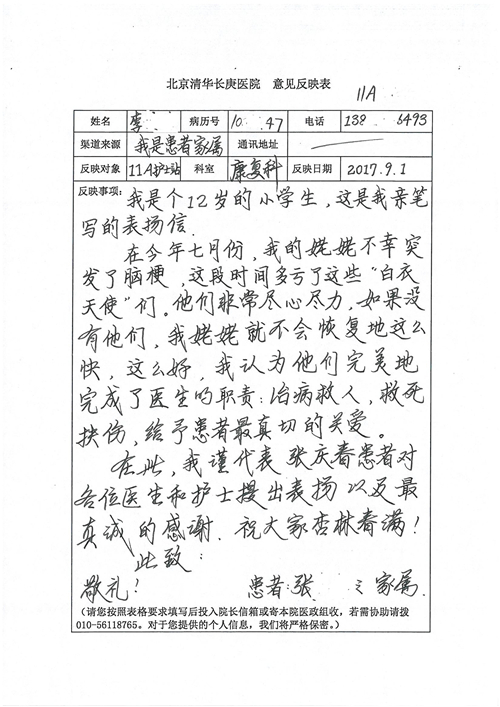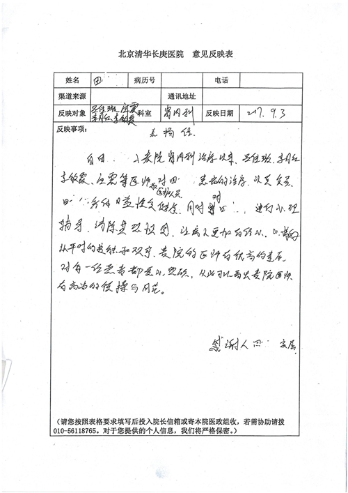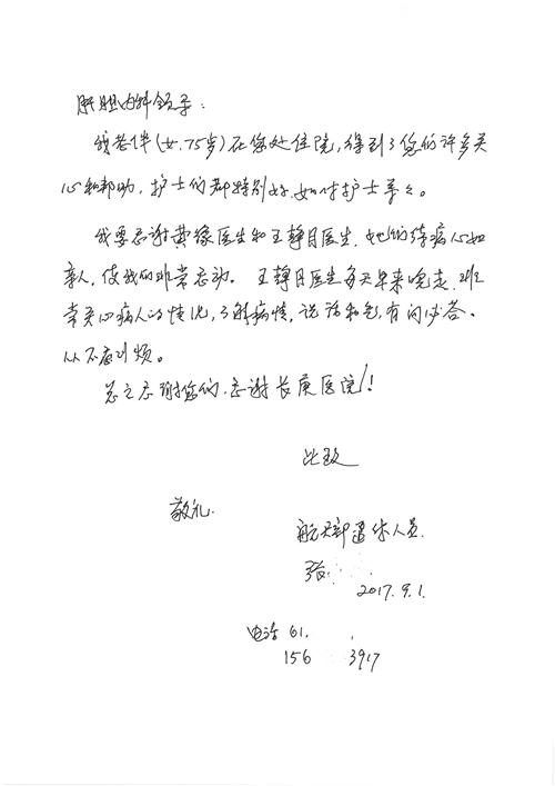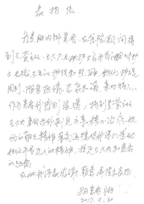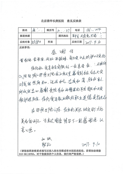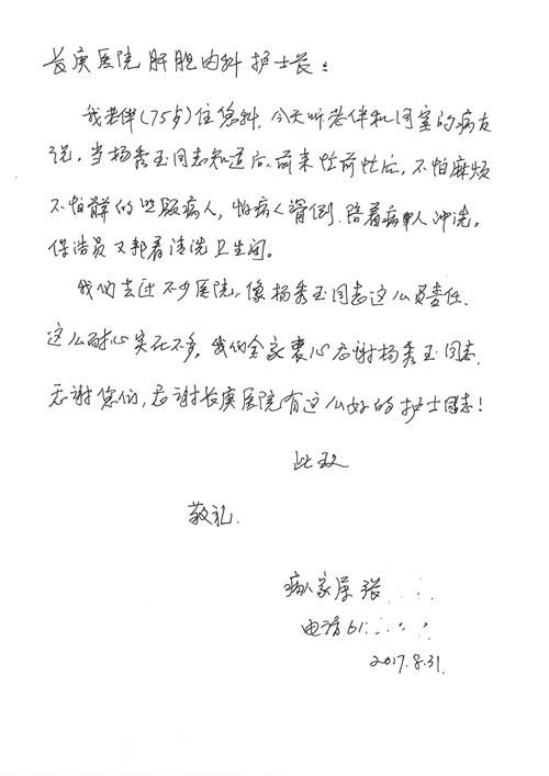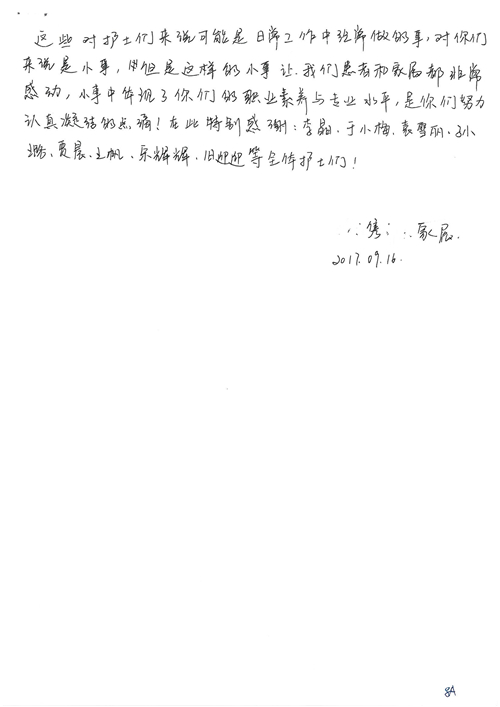 2017年9月,我院共接到患者及家属感谢信65封,其中肝胆外科张跃伟主任医师、杨世忠副主任医师、曾建平主治医师、公磊主治医师、张新静医师、任志忠医师、王良医师、杨世伟医师、朱融融医师;神经外科董生医师;普通外科罗斌主任医师;胃肠外科李元新主任医师、蔺宏伟副主任医师、张鹏主治医师、刘伯涛主治医师、孙孝文医师;骨科肖嵩华主任医师、邓玖征医师;血管外科吴巍巍主任医师、杨宇医师;胸腔外科陈东红副主任医师;麻醉科严思益主治医师;心脏内科张萍主任医师、缪国斌主任医师、李艳芳主任医师;呼吸内科王立万副主任医师、郭军副主任医师;肾脏内科李月红主任医师、李敏侠主治医师、庄震主治医师、吕佳璇医师;普通内科马序竹副主任医师、乔宇医师、杨靖医师、段瑶医师;消化内科王佳主治医师、郭晓娟医师、应小芳、李姣姣、霍雪茹;肝胆内科黄缘主任医师、王静月医师;妇产科张蕾副主任医师、杨曦主治医师、王晓茜主治医师;康复医学科潘钰主任医师、吴琼主治医师、徐泉主治医师、杨绯医师、张欢、朱红梅、谢平,皮肤科舒丹主治医师;口腔科朱静医师;眼科胡运韬主任医师;中医科秦建婷主治医师;耳鼻咽喉头颈外科伊海金副主任医师、秦贺副主任医师、许嘉医师、胡斌医师;急诊科张向阳副主任医师、宋琳琳主治医师、魏正杰医师;ICU许媛主任医师、谢志毅副主任医师、周华副主任医师;临床药学科张微微药师;医事处徐超、霍占娟;护理部李渝红、李冬蓉、林景熠、王雪君、李昌龙、张丽娜、袁雪丽、刘灿、张雅绯、荆红英、孙璐、张雅绯、田迎迎、贾晨、刘子霞、秦蒙蒙、宋辉辉、于小梅、周圆、贾波、吴雪洁、王帆、李晶、高飞、郑林霞、赵丹、薄艳娜、申姗、齐苗苗、刘伟芳、赵红杰、付焕丽、尤欣、周颖、杨秀玉、孟娇、杨秀玉、马阳阳、史金凤、尹雪、付焕丽、赵丹、严哲、刘天玉、朱笑蝶、李艺文、于晓华、孟令玉、甄娇、蒋红梅、高健、张静、朱鸿飞、刘岩、徐国良、成肖翠、李美婷、高国民、李春燕、朱文鹃、肖鑫、贺文静、马姗姗、郑薇薇、梁利杰、钱迎、刘娟、程美玲、孙雪洁、吴春慧、贾楠、胡春红;肖嵩华主任团队、吴巍巍主任团队、胡运韬主任团队、缪国斌主任团队以及胸外科全体医护人员收到具名表扬。特此公告,以资鼓励!