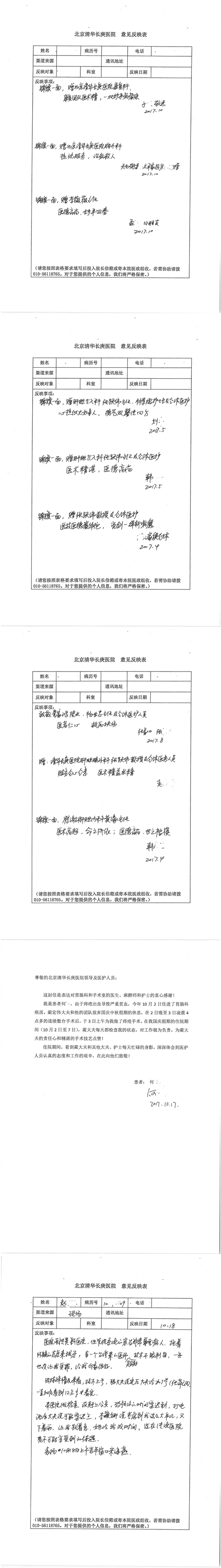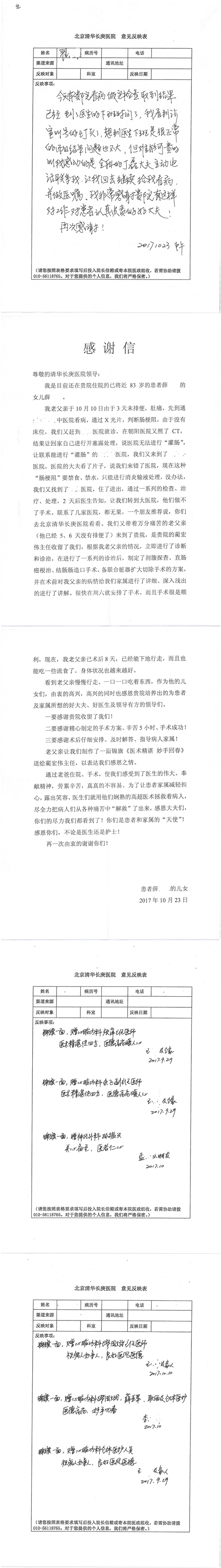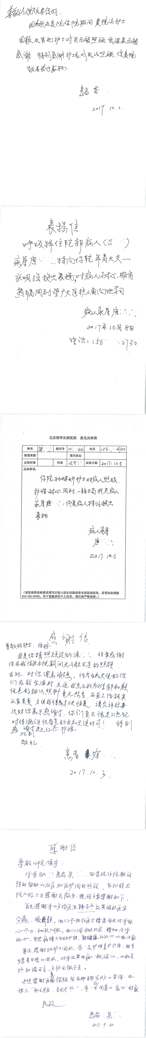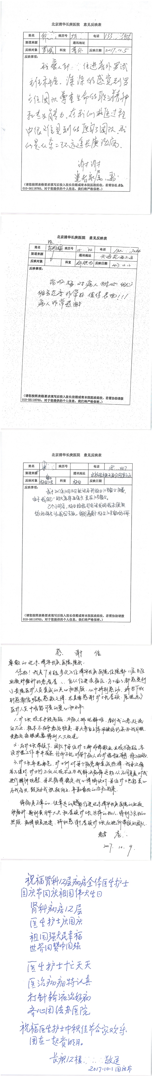 2017年10月,我院共接到患者及家属感谢信58封,其中肝胆外科董家鸿主任医师、张跃伟主任医师、杨世忠副主任医师、韩东冬副主任医师、公磊主治医师、任志忠医师、张新静医师;神经外科孙振兴医师;普通外科罗斌主任医师、白熠洲主治医师、刘安阳医师、田金翌医师;胃肠外科李元新主任医师、王峰副主任医师、蔺宏伟副主任医师;整形外科李薇薇副主任医师;泌尿外科张鑫主任医师、胡卫国副主任医师;胸腔外科陈东红副主任医师、杨帆主治医师、赵传多医师、朱伟鹏医师、曹加顺医师;心脏内科张萍主任医师、缪国斌主任医师、佘飞副主任医师、薛亚军主治医师、耿雨医师;呼吸内科郭军副主任医师;神经内科王梅副主任医师、沈懿医师;肾脏内科庄震副主任医师;肝胆内科黄缘主任医师;血液肿瘤内科黄月华主治医师;康复医学科徐泉主治医师;口腔科聂小汉主治医师、吴宓勋医师、张原彬;眼科胡运韬主任医师;全科医学科丁磊副主任医师;中医科秦建婷主治医师;医事处李晓娜、宋海燕、徐超、范丹梅;志愿者唐煜梓;护理部李硕、林景熠、朱笑蝶、孟令玉、孟欢、王宇、吴琼、张保乾、李慧、李杰、高雅、刘天玉、甄娇、周杰、赵杰、王瑞娅、紫威、周颖、申姗、杨秀玉、付焕丽、杨志丽、安金杰、张洋洋、张莉莉、齐苗苗、蒋帅男、曹明霞、肖江彬、孙姝妍、赵红杰、付莹;心脏内科、肝胆外科、肾脏内科全体医护人员收到具名表扬。特此公告,以资鼓励!