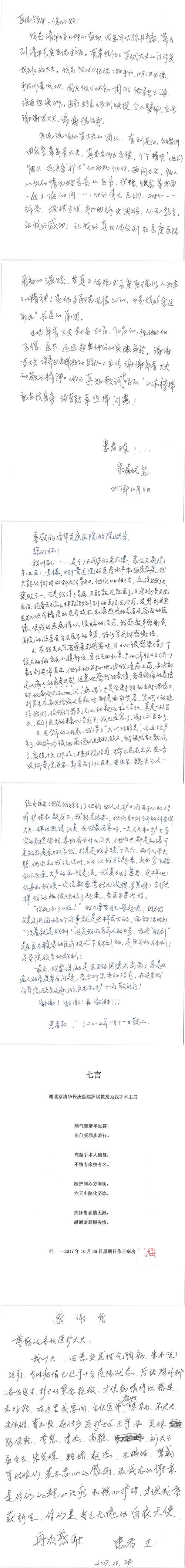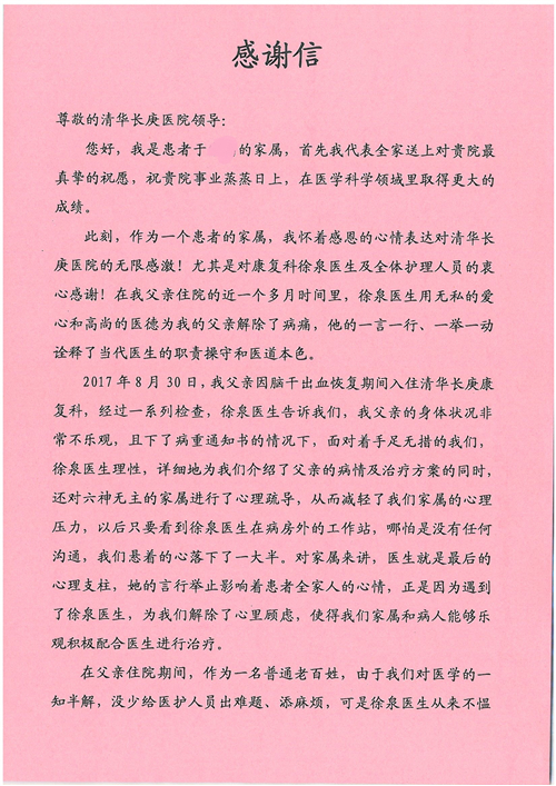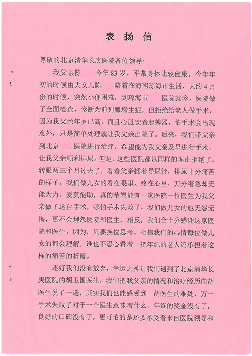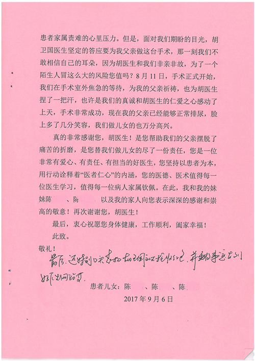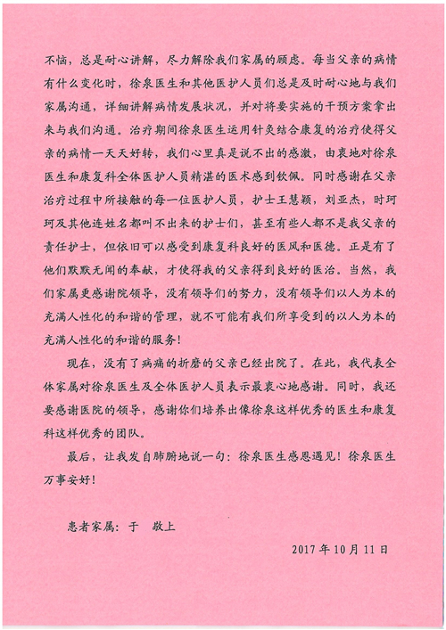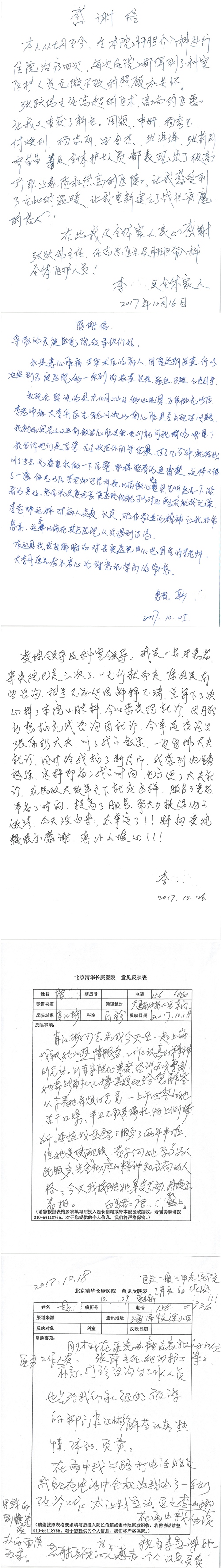 2017年10月,我院共接到患者及家属感谢信58封,其中肝胆外科董家鸿主任医师、张跃伟主任医师、杨世忠副主任医师、韩东冬副主任医师、公磊主治医师、任志忠医师、张新静医师;神经外科孙振兴医师;普通外科罗斌主任医师、白熠洲主治医师、刘安阳医师、田金翌医师;胃肠外科李元新主任医师、王峰副主任医师、蔺宏伟副主任医师;整形外科李薇薇副主任医师;泌尿外科张鑫主任医师、胡卫国副主任医师;胸腔外科陈东红副主任医师、杨帆主治医师、赵传多医师、朱伟鹏医师、曹加顺医师;心脏内科张萍主任医师、缪国斌主任医师、佘飞副主任医师、薛亚军主治医师、耿雨医师;呼吸内科郭军副主任医师;神经内科王梅副主任医师、沈懿医师;肾脏内科庄震副主任医师;肝胆内科黄缘主任医师;血液肿瘤内科黄月华主治医师;康复医学科徐泉主治医师;口腔科聂小汉主治医师、吴宓勋医师、张原彬;眼科胡运韬主任医师;全科医学科丁磊副主任医师;中医科秦建婷主治医师;医事处李晓娜、宋海燕、徐超、范丹梅;志愿者唐煜梓;护理部李硕、林景熠、朱笑蝶、孟令玉、孟欢、王宇、吴琼、张保乾、李慧、李杰、高雅、刘天玉、甄娇、周杰、赵杰、王瑞娅、紫威、周颖、申姗、杨秀玉、付焕丽、杨志丽、安金杰、张洋洋、张莉莉、齐苗苗、蒋帅男、曹明霞、肖江彬、孙姝妍、赵红杰、付莹;心脏内科、肝胆外科、肾脏内科全体医护人员收到具名表扬。特此公告,以资鼓励!