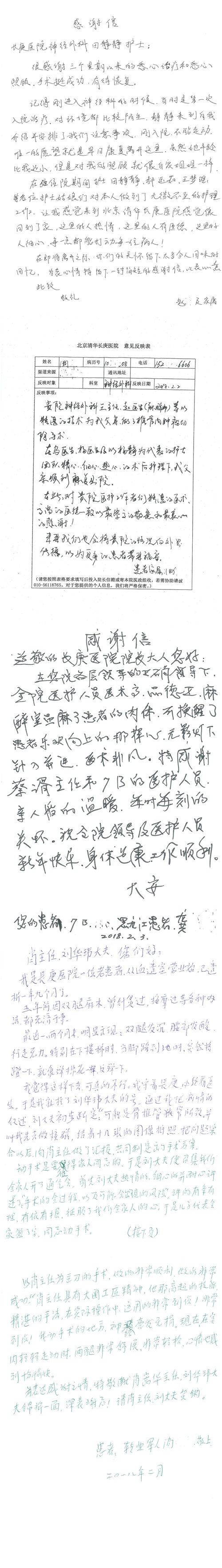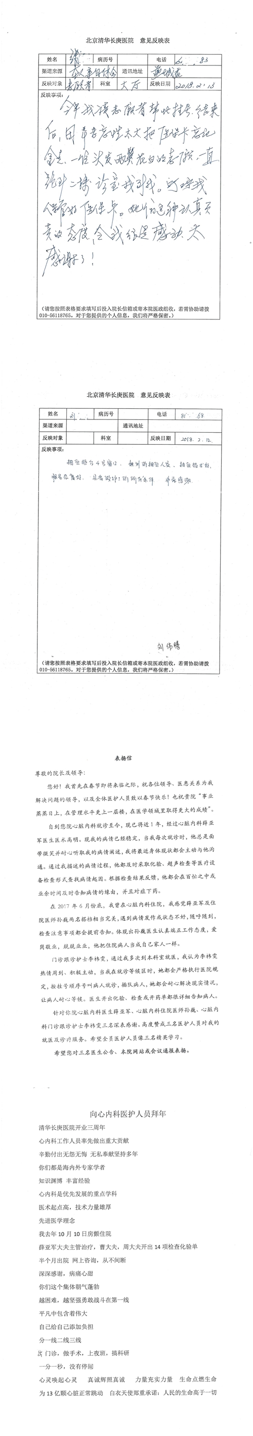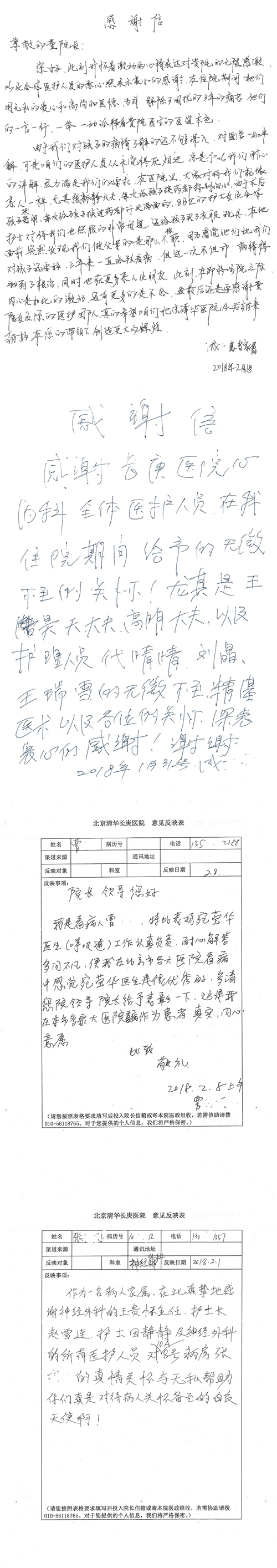 2018年2月,我院共接到患者及家属感谢信63封,其中肝胆胰外科董家鸿主任医师、张新静医师,神经外科王贵怀主任医师、郭毅副主任医师、乌优图医师、叶祖龙医师、杨峰医师,胃肠外科李元新主任医师、王峰副主任医师、赵宏伟主治医师、张骞主治医师,骨科肖嵩华主任医师、蔡谞主任医师,血管外科吴巍巍主任医师,泌尿外科陈松副主任医师,麻醉科赵艳军主治医师,心脏内科张萍主任医师、缪国斌主任医师、李艳芳主任医师、刘芳主任医师、何榕副主任医师、薛亚军主治医师、王昊天主治医师、孙巍医师、张鸥医师,呼吸内科王立万副主任医师、郭军副主任医师、蔡存良主治医师、宛莹华主治医师、安宇林医师、张明强医师,神经内科李珺主治医师,妇产科廖秦平主任医师、马珂副主任医师、陈华云医师,康复医学科萧演清主治医师、徐泉主治医师,内分泌科曹沉香主治医师,全科医学科王仲主任医师,中医科秦建婷医师,耳鼻喉科叶京英主任医师,急诊科张向阳副主任医师、张晓磊医师,超声科刘悦医师,检验科赵秀英主任医师、李润青医师、刘伟腾,输血科马海梅主任,对外合作办马龙男,医事处范丹梅、孙小乐、刘嘉仪、李俊男、刘艳凤、李蕊,护理部赵雪莲、杨静、田静静、郝运茹、王梦瑶、李艳梅、尹雪、方玲、郝津荣、许丽丽、张慧文、李祎雯、李艳梅、代晴晴、刘晶、王瑞雪、韩杰、袁敏、王朝群、杨硕以及护工薛希政收到具名表扬。特此公告,以资鼓励!
