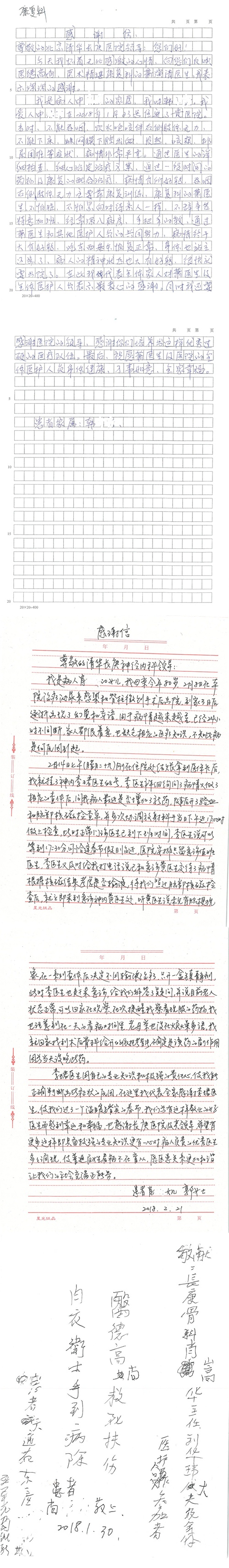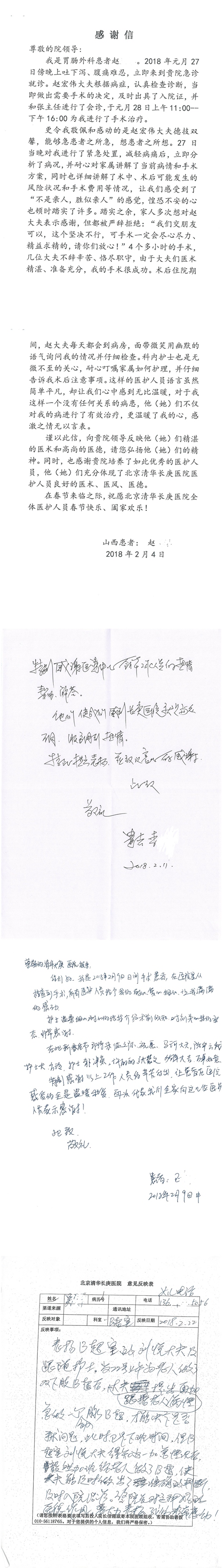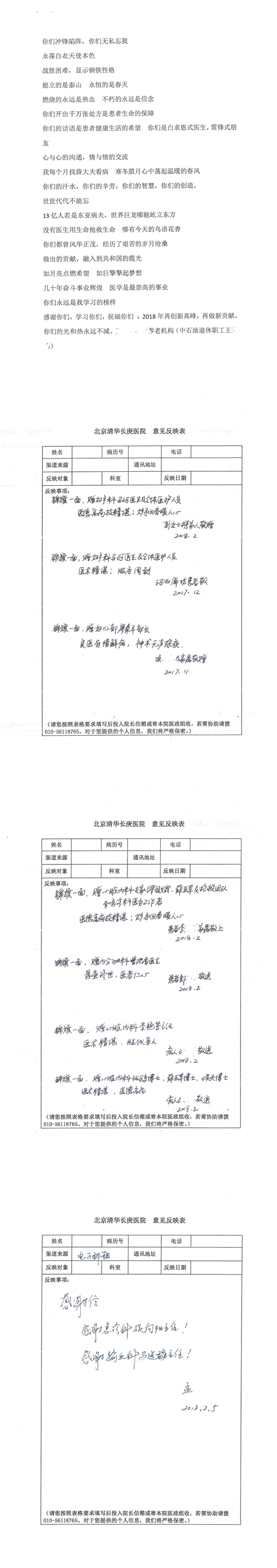 2018年2月,我院共接到患者及家属感谢信63封,其中肝胆胰外科董家鸿主任医师、张新静医师,神经外科王贵怀主任医师、郭毅副主任医师、乌优图医师、叶祖龙医师、杨峰医师,胃肠外科李元新主任医师、王峰副主任医师、赵宏伟主治医师、张骞主治医师,骨科肖嵩华主任医师、蔡谞主任医师,血管外科吴巍巍主任医师,泌尿外科陈松副主任医师,麻醉科赵艳军主治医师,心脏内科张萍主任医师、缪国斌主任医师、李艳芳主任医师、刘芳主任医师、何榕副主任医师、薛亚军主治医师、王昊天主治医师、孙巍医师、张鸥医师,呼吸内科王立万副主任医师、郭军副主任医师、蔡存良主治医师、宛莹华主治医师、安宇林医师、张明强医师,神经内科李珺主治医师,妇产科廖秦平主任医师、马珂副主任医师、陈华云医师,康复医学科萧演清主治医师、徐泉主治医师,内分泌科曹沉香主治医师,全科医学科王仲主任医师,中医科秦建婷医师,耳鼻喉科叶京英主任医师,急诊科张向阳副主任医师、张晓磊医师,超声科刘悦医师,检验科赵秀英主任医师、李润青医师、刘伟腾,输血科马海梅主任,对外合作办马龙男,医事处范丹梅、孙小乐、刘嘉仪、李俊男、刘艳凤、李蕊,护理部赵雪莲、杨静、田静静、郝运茹、王梦瑶、李艳梅、尹雪、方玲、郝津荣、许丽丽、张慧文、李祎雯、李艳梅、代晴晴、刘晶、王瑞雪、韩杰、袁敏、王朝群、杨硕以及护工薛希政收到具名表扬。特此公告,以资鼓励!