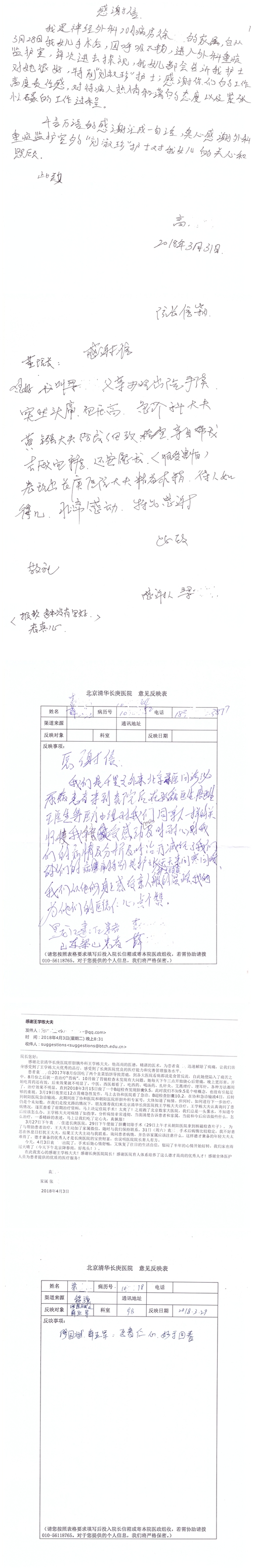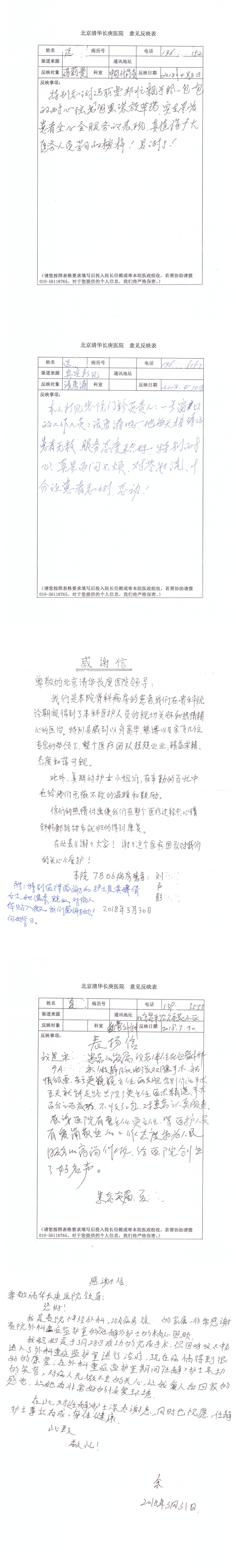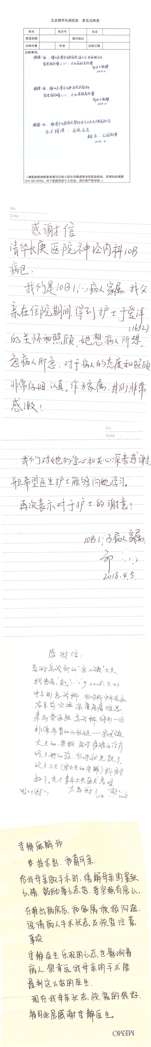 2018年4月,我院共接到患者及家属感谢信55封,其中肝胆胰外科项灿宏主任医师、张琳副主任医师、王良主治医师、王学栋主治医师、公磊主治医师,神经外科王贵怀主任医师、吕宪利副主任医师、孙振兴医师、梁士凯医师,普通外科罗斌主任医师、白熠洲主治医师、霍东方主治医师,胃肠外科李元新主任医师、王峰副主任医师、张骞主治医师,骨科肖嵩华主任医师、蔡谞主任医师、宋飞副主任医师、顾苏熙主治医师、邓玖征医师,血管外科吴巍巍主任医师,泌尿外科张鑫主任医师、陈松副主任医师、胡卫国副主任医师、苏博兴医师、唐宇哲医师、王澍医师,麻醉科张欢主任医师、王琳琳主治医师、季静,心脏外科沈冬焱副主任医师,心脏内科缪国斌主任医师、何榕副主任医师、薛亚军主治医师、王昊天主治医师,呼吸内科王立万副主任医师、蔡存良主治医师、张明强医师,神经内科冯新红副主任医师、张菁副主任医师、黄丽主治医师、沈懿医师,肾脏内科庄震副主任医师、李敏侠主治医师,普通内科冯莉莉主治医师、王逸群主治医师,血液肿瘤内科黄月华主治医师,眼科胡运韬主任医师、刘瑄副主任医师、宋丹副主任医师、司山成主治医师,耳鼻喉科秦贺副主任医师,急诊科宋晓微医师、黄镪医师,药剂科冯莉曼,对外合作办马龙男,保卫处刘家明副处长,医事处张勇涛,停车管理员乔桂选,护理部于爱洋、史玉静、李健桃、肖佳、王金花、杨静、李建华、王子秋、刘淼、刘淑珍、黄婧倩、徐宁、孙璐、陈瑞敏、李亚灵、于俊平、刘翚、陈艳妮、任静收到具名表扬。特此公告,以资鼓励!