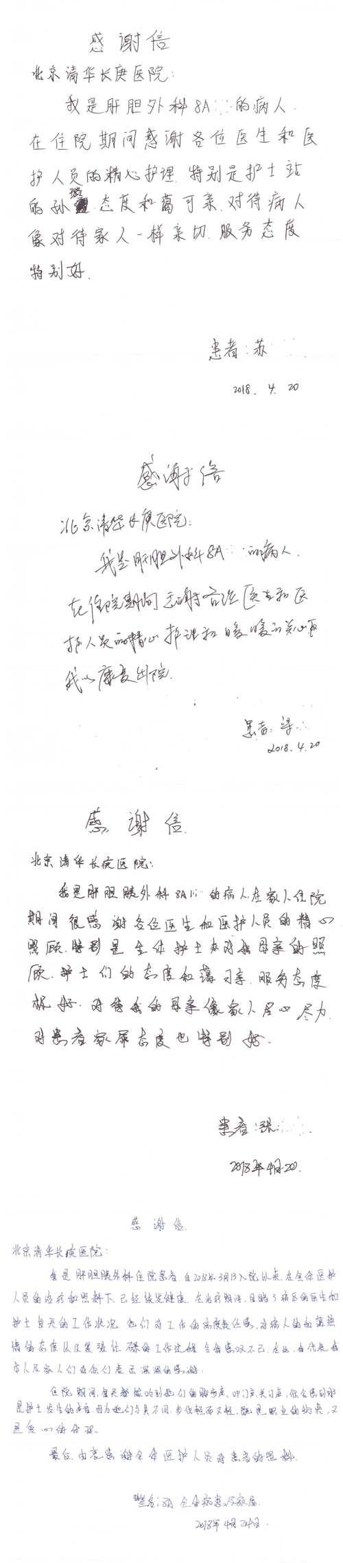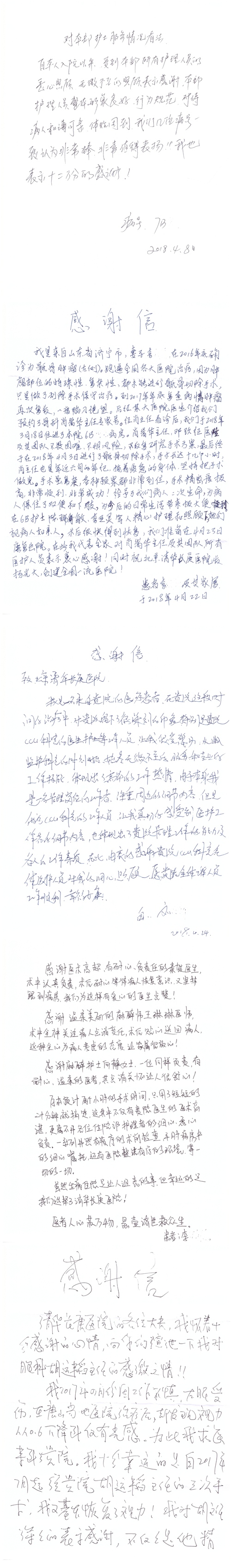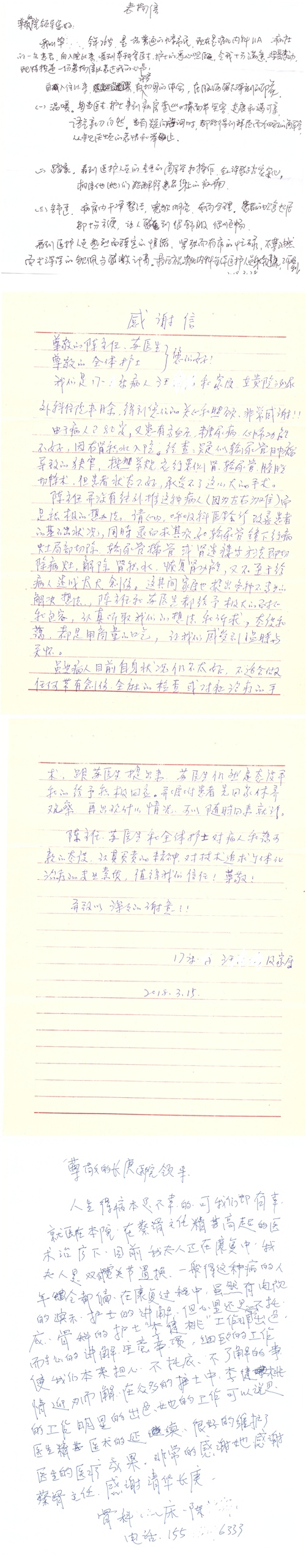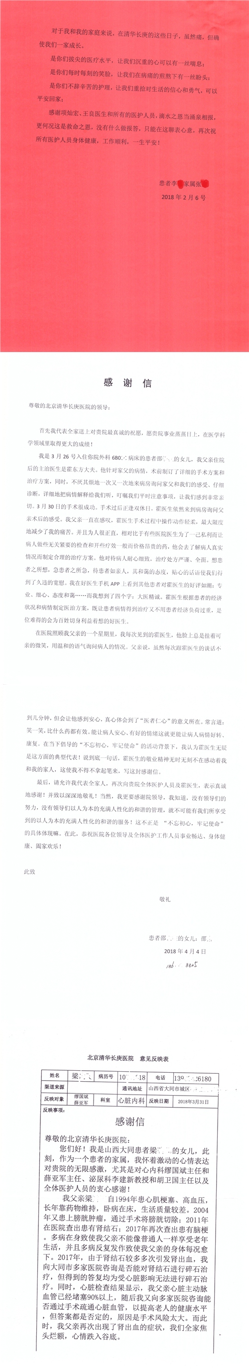 2018年4月,我院共接到患者及家属感谢信55封,其中肝胆胰外科项灿宏主任医师、张琳副主任医师、王良主治医师、王学栋主治医师、公磊主治医师,神经外科王贵怀主任医师、吕宪利副主任医师、孙振兴医师、梁士凯医师,普通外科罗斌主任医师、白熠洲主治医师、霍东方主治医师,胃肠外科李元新主任医师、王峰副主任医师、张骞主治医师,骨科肖嵩华主任医师、蔡谞主任医师、宋飞副主任医师、顾苏熙主治医师、邓玖征医师,血管外科吴巍巍主任医师,泌尿外科张鑫主任医师、陈松副主任医师、胡卫国副主任医师、苏博兴医师、唐宇哲医师、王澍医师,麻醉科张欢主任医师、王琳琳主治医师、季静,心脏外科沈冬焱副主任医师,心脏内科缪国斌主任医师、何榕副主任医师、薛亚军主治医师、王昊天主治医师,呼吸内科王立万副主任医师、蔡存良主治医师、张明强医师,神经内科冯新红副主任医师、张菁副主任医师、黄丽主治医师、沈懿医师,肾脏内科庄震副主任医师、李敏侠主治医师,普通内科冯莉莉主治医师、王逸群主治医师,血液肿瘤内科黄月华主治医师,眼科胡运韬主任医师、刘瑄副主任医师、宋丹副主任医师、司山成主治医师,耳鼻喉科秦贺副主任医师,急诊科宋晓微医师、黄镪医师,药剂科冯莉曼,对外合作办马龙男,保卫处刘家明副处长,医事处张勇涛,停车管理员乔桂选,护理部于爱洋、史玉静、李健桃、肖佳、王金花、杨静、李建华、王子秋、刘淼、刘淑珍、黄婧倩、徐宁、孙璐、陈瑞敏、李亚灵、于俊平、刘翚、陈艳妮、任静收到具名表扬。特此公告,以资鼓励!