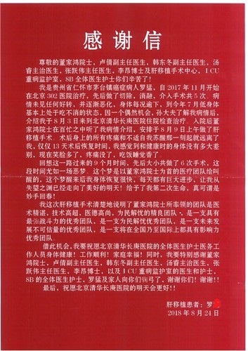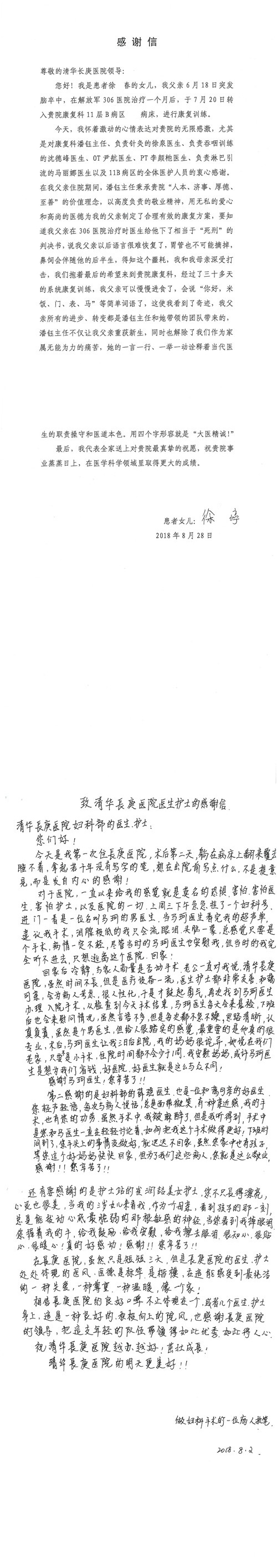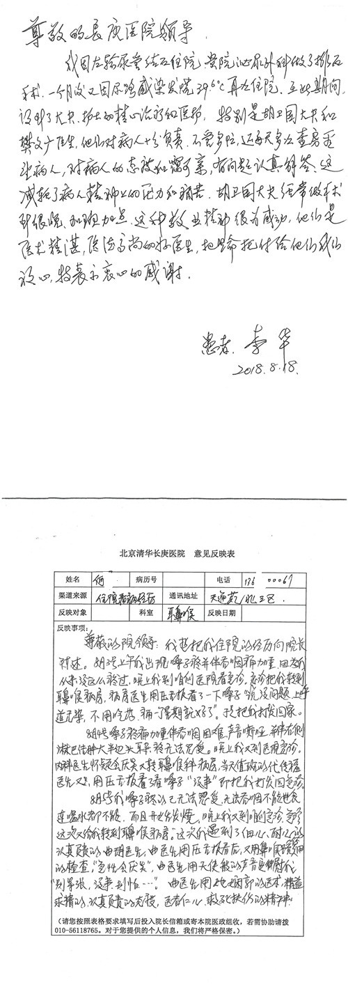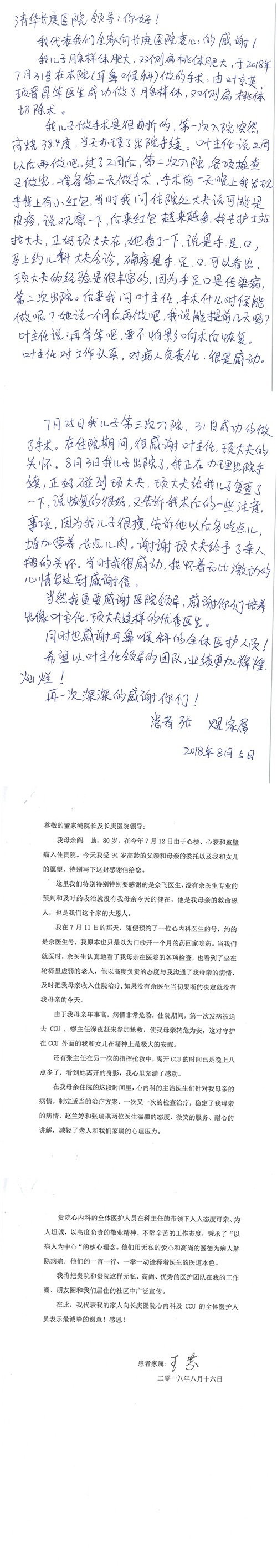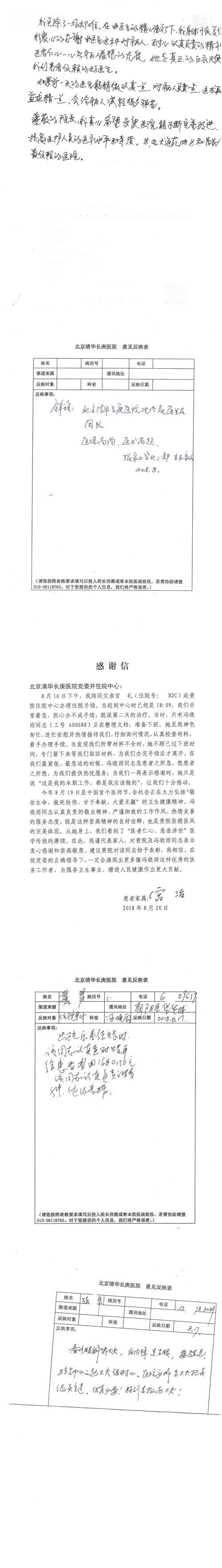 2018年8月我院共接到患者及家属感谢信69封,其中耳鼻咽喉头颈外科叶京英主任医师、顼晋昆主治医师、曲玥医师,妇产科廖秦平主任医师、马珂副主任医师、薛瑶主治医师、杨曦主治医师,肝胆胰外科董家鸿主任医师、张洪义主任医师、卢倩副主任医师、韩东冬副主任医师、汤睿主治医师、公磊主治医师、李昂医师,肝胆胰介入科张跃伟主任医师,骨科杨华东主治医师,麻醉科赵艳军主治医师,心脏内科张萍主任医师、缪国斌主任医师、刘元伟副主任医师、何榕副主任医师、佘飞副主任医师、赵兰婷主治医师、薛亚军主治医师、张瑞琪医师、耿雨医师、乔宇医师、周杰医师,心脏外科沈冬焱副主任医师,康复医学科潘钰主任医师、徐泉主治医师,泌尿外科李建兴主任医师、胡卫国副主任医师、陈松副主任医师,皮肤科陈典主治医师,普通内科冯莉莉主治医师,全科医学科王仲主任医师,神经内科王梅副主任医师、黄丽主治医师,胃肠外科李元新主任医师、王峰副主任医师、张骞主治医师、张鹏主治医师、刘伯涛主治医师、孙孝文主治医师,血管外科吴巍巍主任医师、王文然医师,眼科胡运韬主任医师、司山成主治医师、林加腾医师,整形外科杨建民主任医师、李薇薇副主任医师、汤洁莹医师,放射治疗科蒋静副主任医师,康复治疗师沈德峰、李颜杝、苏胜民、陈固稳,护理部覃丽妮、方玲、朱笑蝶、李文静、杨静、许丽丽、傅莹、崔美喆、李冰、尹雪、曲珊珊、张楠、赵杰、孟令玉、朱融融、徐宁,医事处冯晓雨、徐超收到具名表扬。特此公告,以资鼓励!