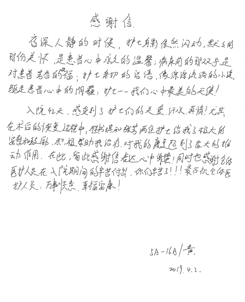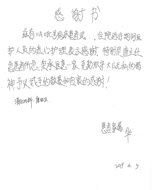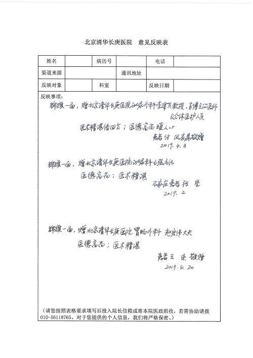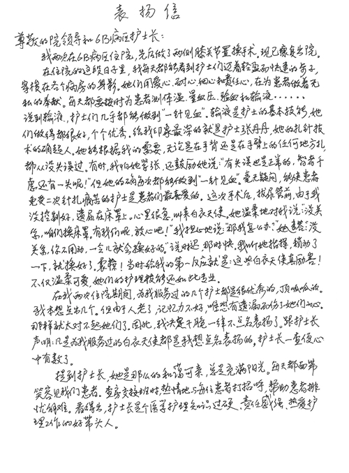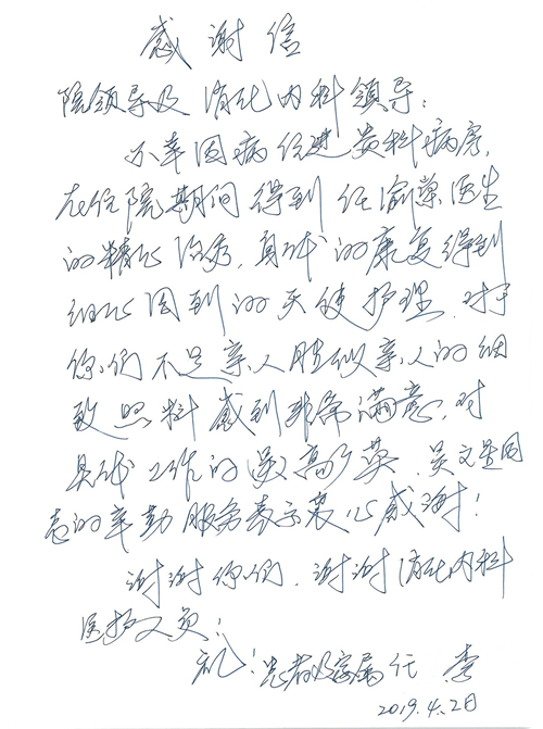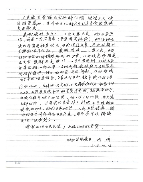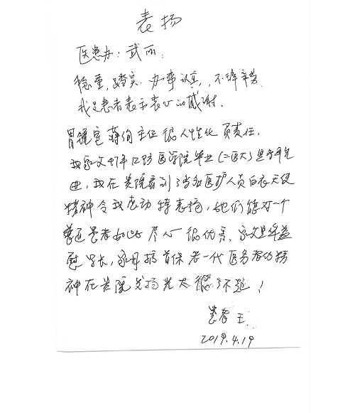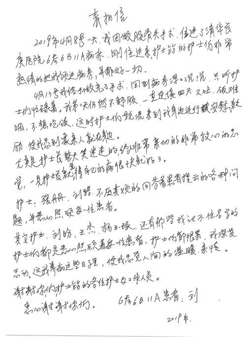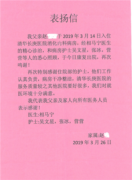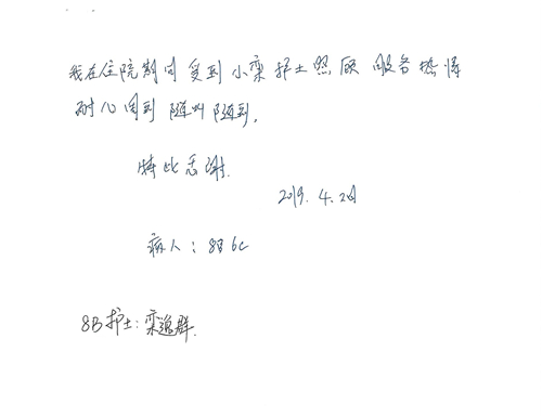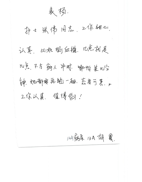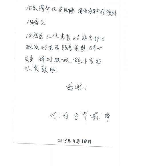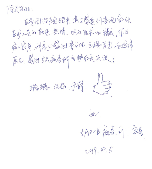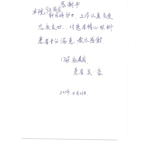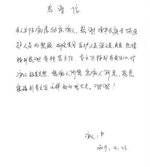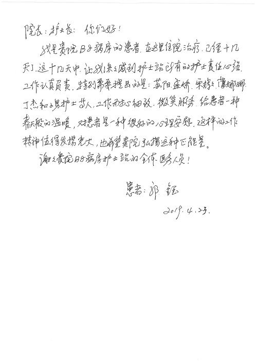 2019年4月,我院共接到患者及家属感谢信70封,其中肝胆胰外科董家鸿主任医师、卢倩副主任医师、汤睿主治医师,肝胆介入科张跃伟主任医师,肝胆内科黄缘主任医师、罗碧芬主治医师,肝胆胰中心陈虹主任医师、范铁艳副主任医师,神经外科李伟医师,神经内科付伟副主任医师、王也医生,普通外科白熠洲主治医师,胃肠外科李元新主任医师、王峰副主任医师、蔺宏伟副主任医师、张鹏主治医师、刘伯涛主治医师、孙孝文主治医师、赵宏伟主治医师、张骞主治医师,胸前外科陈东红副主任医师、杨帆主治医师,骨科顾苏熙主治医师、刘华玮主治医师,泌尿外科王强副主任医师、李建兴主任医师、肖博主治医师,心脏内科张萍主任医师、缪国斌主任医师、李艳芳主任医师、刘元伟副主任医师、佘飞副主任医师、薛亚军主治医师、周博达主治医师、谢颖主治医师、乔宇医师、周杰医师、赵兰婷医师、张瑞琪医师、李思源医师、张伟医师,心脏外科沈冬焱主任医师,呼吸与危重症医学科郭军副主任医师、蔡存良主治医师、赵景全主治医师、高博医师,张童医师、朱融融医师、王逸群医师、段瑶医师,消化内科蒋绚主任医师、唐红卫主任医师、相马宁主任医师、王佳主治医师、任渝棠主治医师、张瑞琪医师,内分泌与代谢科赵文惠副主任医师、曹沉香主治医师、冯雨桐医师,血液肿瘤科黄月华主治医师、钱坤医生、庄先静医生,康复医学科潘钰主任医师、樊森朝、尹航、苏胜民、杨绯、翟晓雪,眼科胡运韬主任医师、司山成主治医师,耳鼻咽喉头颈外科胡斌主治医师,急诊科王非主治医师、潘德星医生,放射治疗科郑卓肇主任医师,肾脏内科李月红主任医师,庄震副主任医师、李敏俠主治医师,麻醉科赵艳军主治医师、药剂科冯丽曼、孟慧杰,医事处谢晶文、邢彦京,医患办武丽,护理部方玲、赵雪莲、覃丽娜、王珍、阴晴、石慧、常丽莉、邵婷婷、姚惠云、高广英、吴文星、付伟、王也、武向兰、张冰、刘欣、栾逸群、纪晓欣、张丹丹、刘路、刘盼、王杰、杨玉琢、王文、张晶、卫莎、周浩、贺佳莹、钱月、陈梦琪、翟月星、张宏飞、张沙、高翔、孔宇佳、崔淑婷、刘杰、郭凯华、王朝群、孙姝研、吴春慧、宋华、陈佳、孟令威、刘杰、程书琪、张芳、郝建荣、杨敏、张璐、姚振云、于静、刘品钰、杜洪慧、林景熠、郑卓肇、李硕、赵素菁、李冬蓉、朱鸿飞、柯胜男、齐赛男、马小蓓、王英华、赵亚参、杨瑞、马海月、崔领玉、王翠萍、王翰婷、张伟、王爱华、吴琼、轩月婷、李娜、张璐、盖凯旋、马丽颖,5A全体医护人员,6B全体医护人员,9A全体护士们,10A全体医护人员,11B全体医护人员,内科全体医护人员,重症医学科全体医护人员消化内科全体医护人员,胃肠外科全体医护人员,心内科全体医护人员,急诊全体医护人员收到具名表扬。特此公告,以资鼓励!