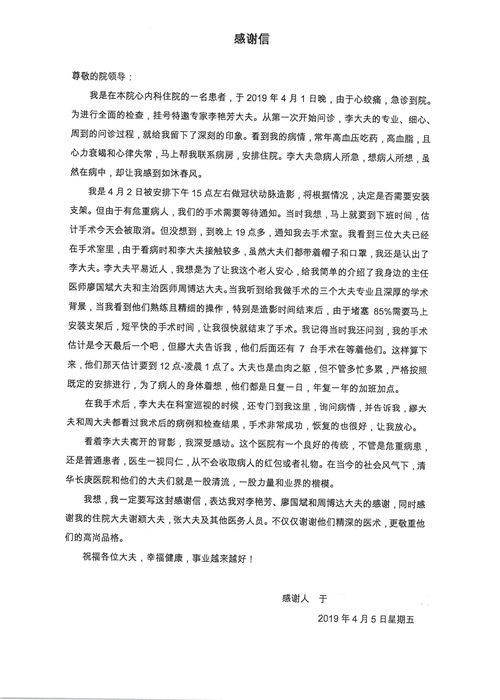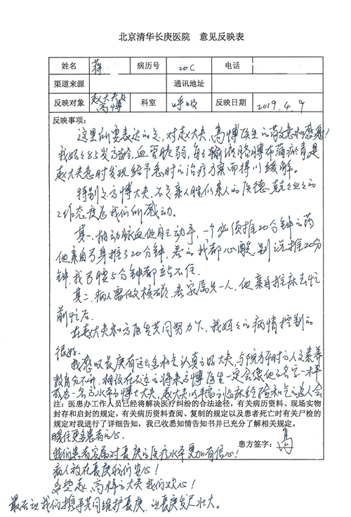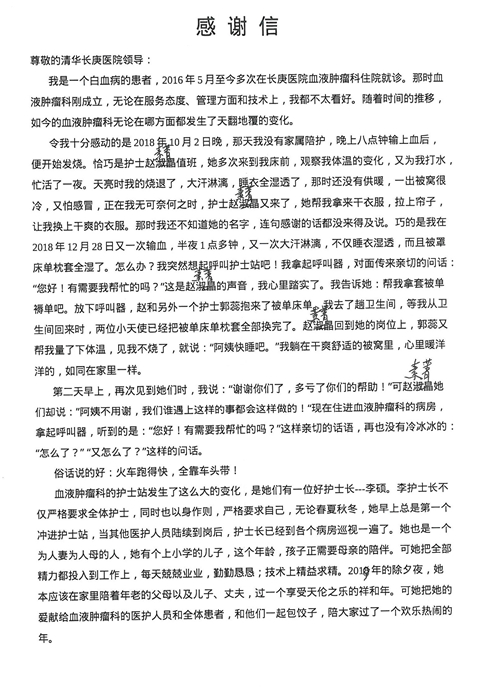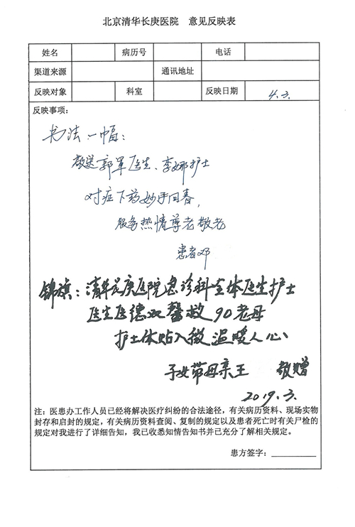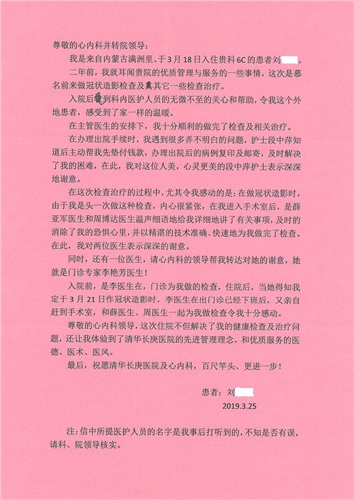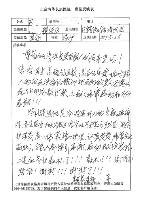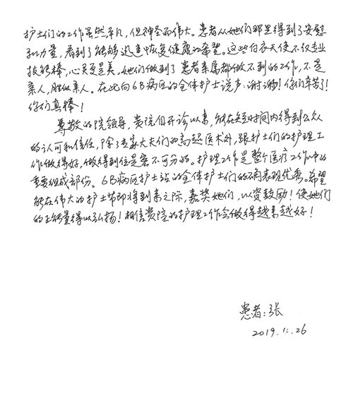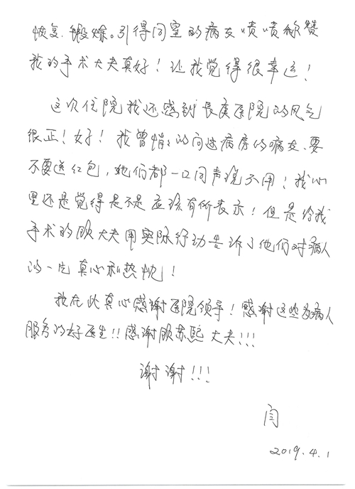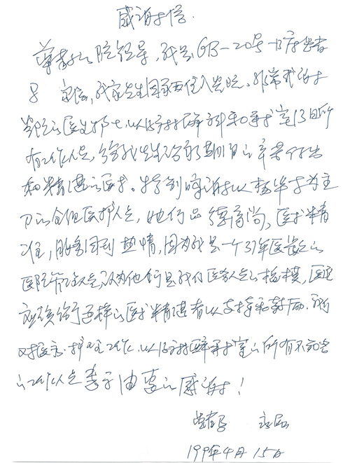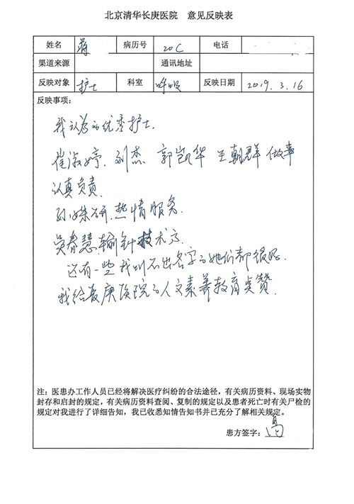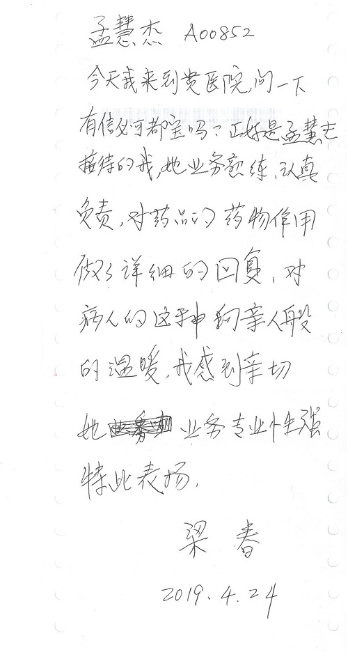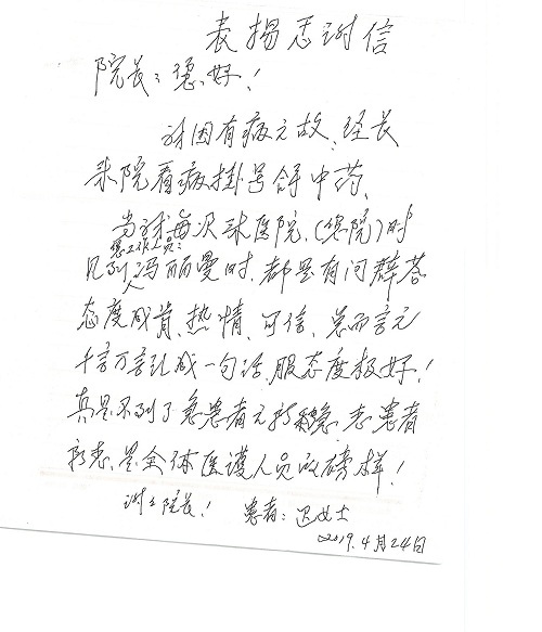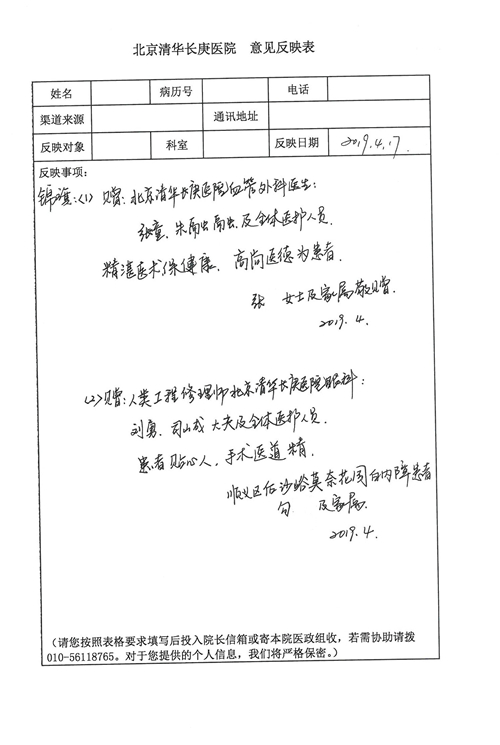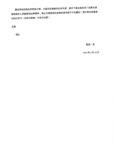 2019年4月,我院共接到患者及家属感谢信70封,其中肝胆胰外科董家鸿主任医师、卢倩副主任医师、汤睿主治医师,肝胆介入科张跃伟主任医师,肝胆内科黄缘主任医师、罗碧芬主治医师,肝胆胰中心陈虹主任医师、范铁艳副主任医师,神经外科李伟医师,神经内科付伟副主任医师、王也医生,普通外科白熠洲主治医师,胃肠外科李元新主任医师、王峰副主任医师、蔺宏伟副主任医师、张鹏主治医师、刘伯涛主治医师、孙孝文主治医师、赵宏伟主治医师、张骞主治医师,胸前外科陈东红副主任医师、杨帆主治医师,骨科顾苏熙主治医师、刘华玮主治医师,泌尿外科王强副主任医师、李建兴主任医师、肖博主治医师,心脏内科张萍主任医师、缪国斌主任医师、李艳芳主任医师、刘元伟副主任医师、佘飞副主任医师、薛亚军主治医师、周博达主治医师、谢颖主治医师、乔宇医师、周杰医师、赵兰婷医师、张瑞琪医师、李思源医师、张伟医师,心脏外科沈冬焱主任医师,呼吸与危重症医学科郭军副主任医师、蔡存良主治医师、赵景全主治医师、高博医师,张童医师、朱融融医师、王逸群医师、段瑶医师,消化内科蒋绚主任医师、唐红卫主任医师、相马宁主任医师、王佳主治医师、任渝棠主治医师、张瑞琪医师,内分泌与代谢科赵文惠副主任医师、曹沉香主治医师、冯雨桐医师,血液肿瘤科黄月华主治医师、钱坤医生、庄先静医生,康复医学科潘钰主任医师、樊森朝、尹航、苏胜民、杨绯、翟晓雪,眼科胡运韬主任医师、司山成主治医师,耳鼻咽喉头颈外科胡斌主治医师,急诊科王非主治医师、潘德星医生,放射治疗科郑卓肇主任医师,肾脏内科李月红主任医师,庄震副主任医师、李敏俠主治医师,麻醉科赵艳军主治医师、药剂科冯丽曼、孟慧杰,医事处谢晶文、邢彦京,医患办武丽,护理部方玲、赵雪莲、覃丽娜、王珍、阴晴、石慧、常丽莉、邵婷婷、姚惠云、高广英、吴文星、付伟、王也、武向兰、张冰、刘欣、栾逸群、纪晓欣、张丹丹、刘路、刘盼、王杰、杨玉琢、王文、张晶、卫莎、周浩、贺佳莹、钱月、陈梦琪、翟月星、张宏飞、张沙、高翔、孔宇佳、崔淑婷、刘杰、郭凯华、王朝群、孙姝研、吴春慧、宋华、陈佳、孟令威、刘杰、程书琪、张芳、郝建荣、杨敏、张璐、姚振云、于静、刘品钰、杜洪慧、林景熠、郑卓肇、李硕、赵素菁、李冬蓉、朱鸿飞、柯胜男、齐赛男、马小蓓、王英华、赵亚参、杨瑞、马海月、崔领玉、王翠萍、王翰婷、张伟、王爱华、吴琼、轩月婷、李娜、张璐、盖凯旋、马丽颖,5A全体医护人员,6B全体医护人员,9A全体护士们,10A全体医护人员,11B全体医护人员,内科全体医护人员,重症医学科全体医护人员消化内科全体医护人员,胃肠外科全体医护人员,心内科全体医护人员,急诊全体医护人员收到具名表扬。特此公告,以资鼓励!