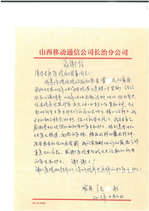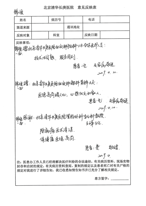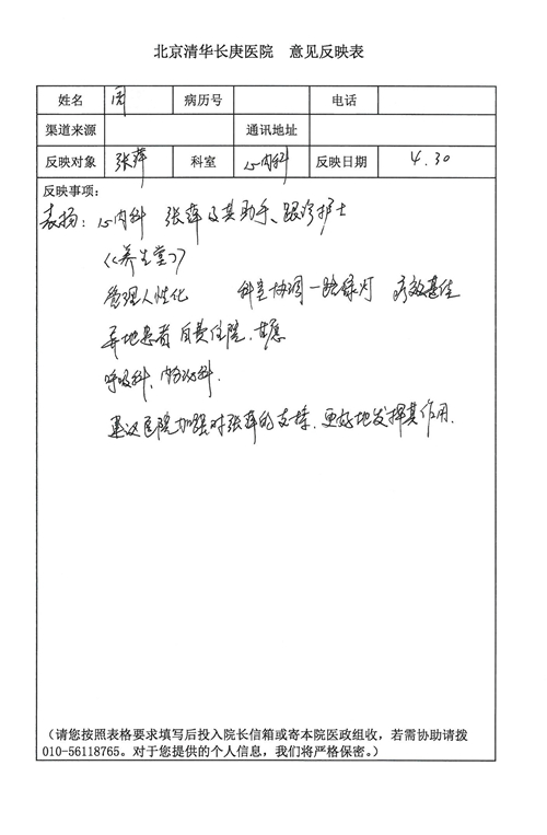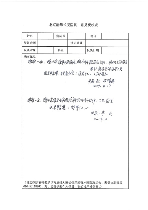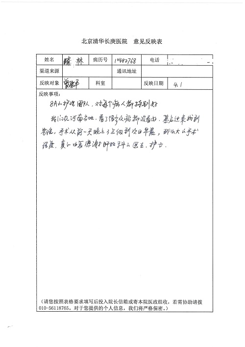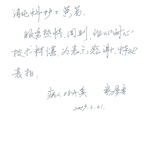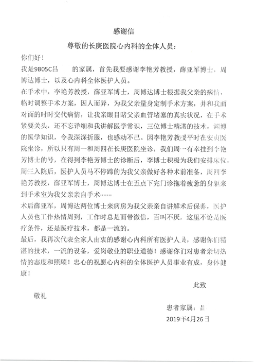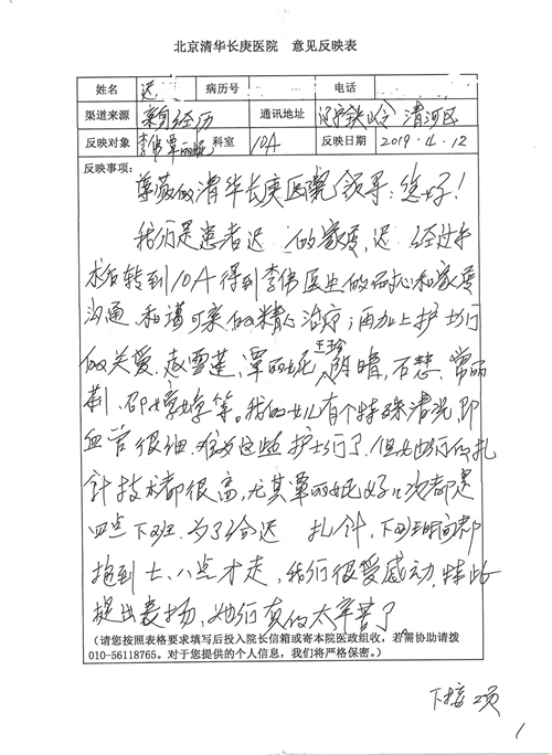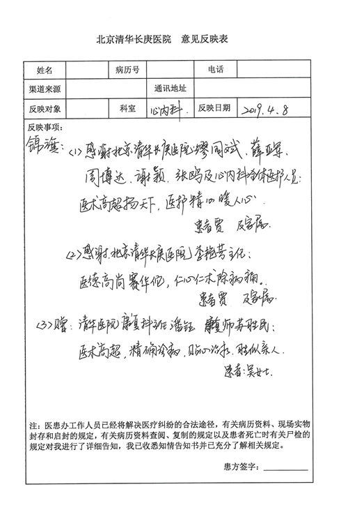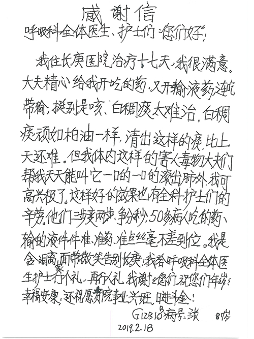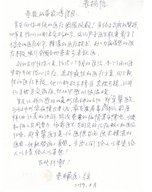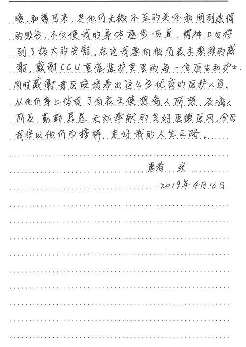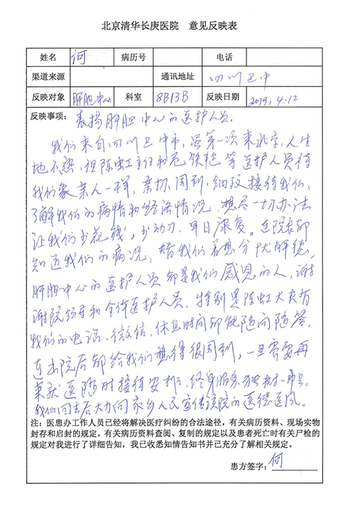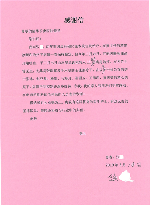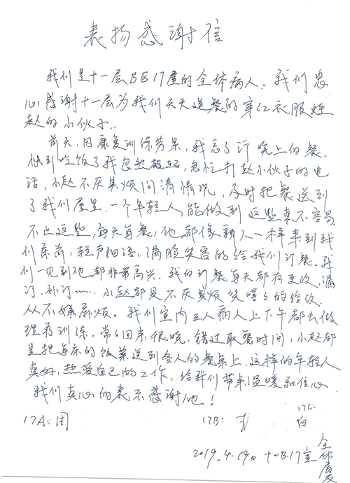 2019年4月,我院共接到患者及家属感谢信70封,其中肝胆胰外科董家鸿主任医师、卢倩副主任医师、汤睿主治医师,肝胆介入科张跃伟主任医师,肝胆内科黄缘主任医师、罗碧芬主治医师,肝胆胰中心陈虹主任医师、范铁艳副主任医师,神经外科李伟医师,神经内科付伟副主任医师、王也医生,普通外科白熠洲主治医师,胃肠外科李元新主任医师、王峰副主任医师、蔺宏伟副主任医师、张鹏主治医师、刘伯涛主治医师、孙孝文主治医师、赵宏伟主治医师、张骞主治医师,胸前外科陈东红副主任医师、杨帆主治医师,骨科顾苏熙主治医师、刘华玮主治医师,泌尿外科王强副主任医师、李建兴主任医师、肖博主治医师,心脏内科张萍主任医师、缪国斌主任医师、李艳芳主任医师、刘元伟副主任医师、佘飞副主任医师、薛亚军主治医师、周博达主治医师、谢颖主治医师、乔宇医师、周杰医师、赵兰婷医师、张瑞琪医师、李思源医师、张伟医师,心脏外科沈冬焱主任医师,呼吸与危重症医学科郭军副主任医师、蔡存良主治医师、赵景全主治医师、高博医师,张童医师、朱融融医师、王逸群医师、段瑶医师,消化内科蒋绚主任医师、唐红卫主任医师、相马宁主任医师、王佳主治医师、任渝棠主治医师、张瑞琪医师,内分泌与代谢科赵文惠副主任医师、曹沉香主治医师、冯雨桐医师,血液肿瘤科黄月华主治医师、钱坤医生、庄先静医生,康复医学科潘钰主任医师、樊森朝、尹航、苏胜民、杨绯、翟晓雪,眼科胡运韬主任医师、司山成主治医师,耳鼻咽喉头颈外科胡斌主治医师,急诊科王非主治医师、潘德星医生,放射治疗科郑卓肇主任医师,肾脏内科李月红主任医师,庄震副主任医师、李敏俠主治医师,麻醉科赵艳军主治医师、药剂科冯丽曼、孟慧杰,医事处谢晶文、邢彦京,医患办武丽,护理部方玲、赵雪莲、覃丽娜、王珍、阴晴、石慧、常丽莉、邵婷婷、姚惠云、高广英、吴文星、付伟、王也、武向兰、张冰、刘欣、栾逸群、纪晓欣、张丹丹、刘路、刘盼、王杰、杨玉琢、王文、张晶、卫莎、周浩、贺佳莹、钱月、陈梦琪、翟月星、张宏飞、张沙、高翔、孔宇佳、崔淑婷、刘杰、郭凯华、王朝群、孙姝研、吴春慧、宋华、陈佳、孟令威、刘杰、程书琪、张芳、郝建荣、杨敏、张璐、姚振云、于静、刘品钰、杜洪慧、林景熠、郑卓肇、李硕、赵素菁、李冬蓉、朱鸿飞、柯胜男、齐赛男、马小蓓、王英华、赵亚参、杨瑞、马海月、崔领玉、王翠萍、王翰婷、张伟、王爱华、吴琼、轩月婷、李娜、张璐、盖凯旋、马丽颖,5A全体医护人员,6B全体医护人员,9A全体护士们,10A全体医护人员,11B全体医护人员,内科全体医护人员,重症医学科全体医护人员消化内科全体医护人员,胃肠外科全体医护人员,心内科全体医护人员,急诊全体医护人员收到具名表扬。特此公告,以资鼓励!