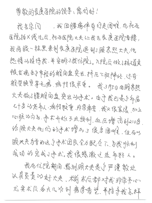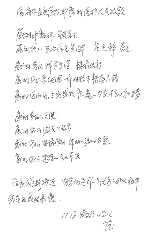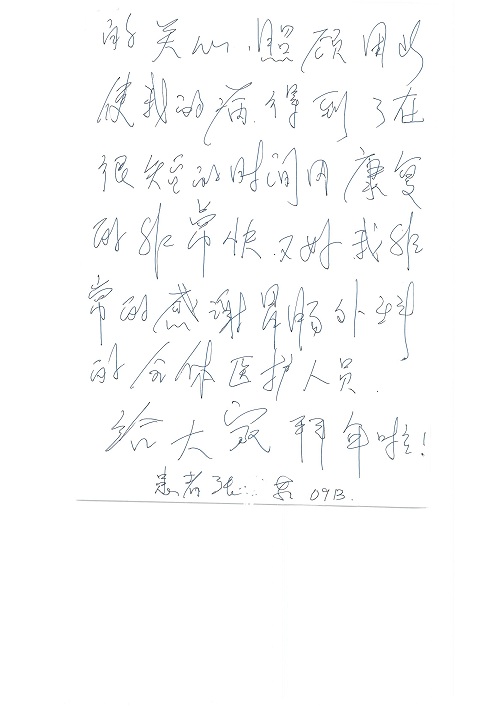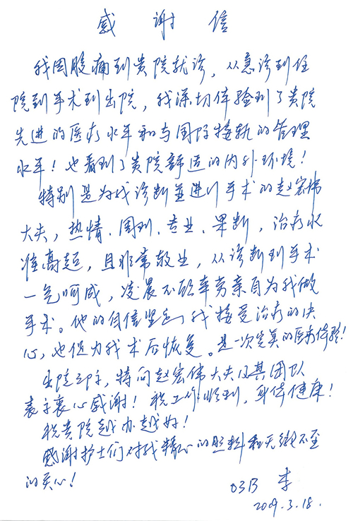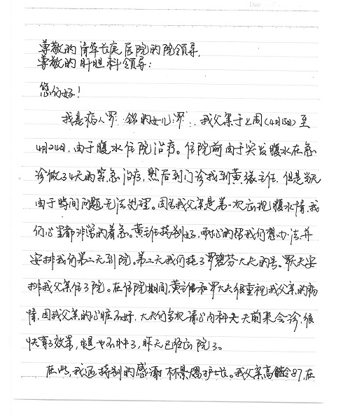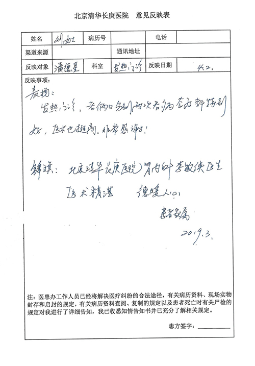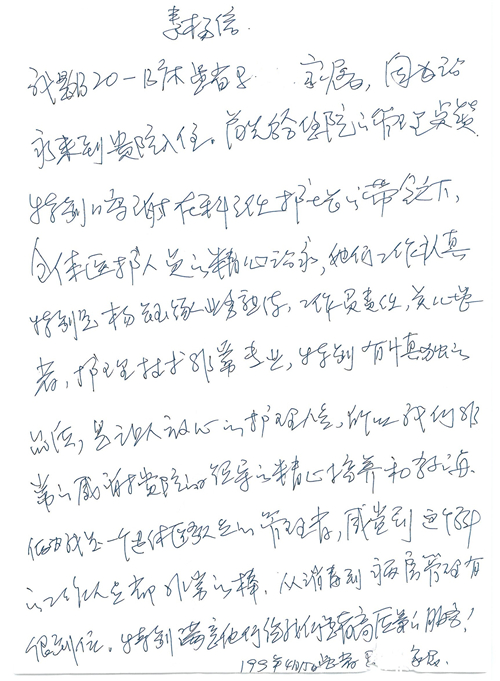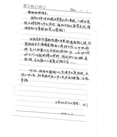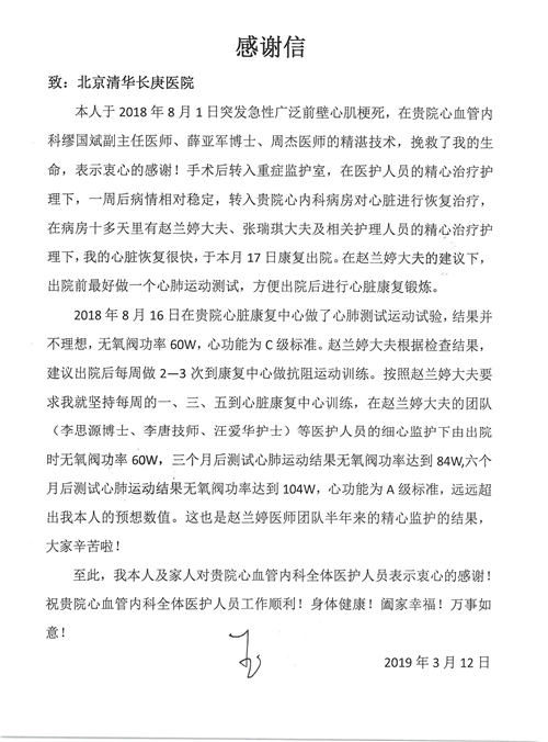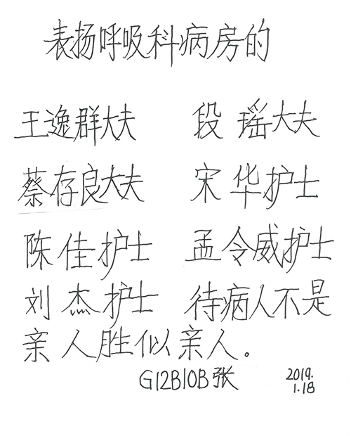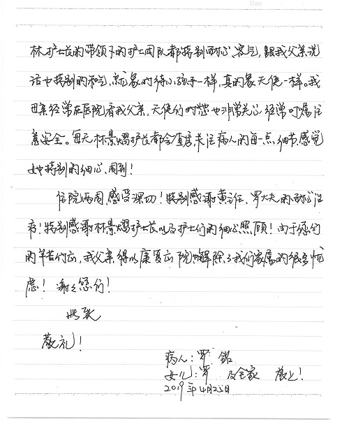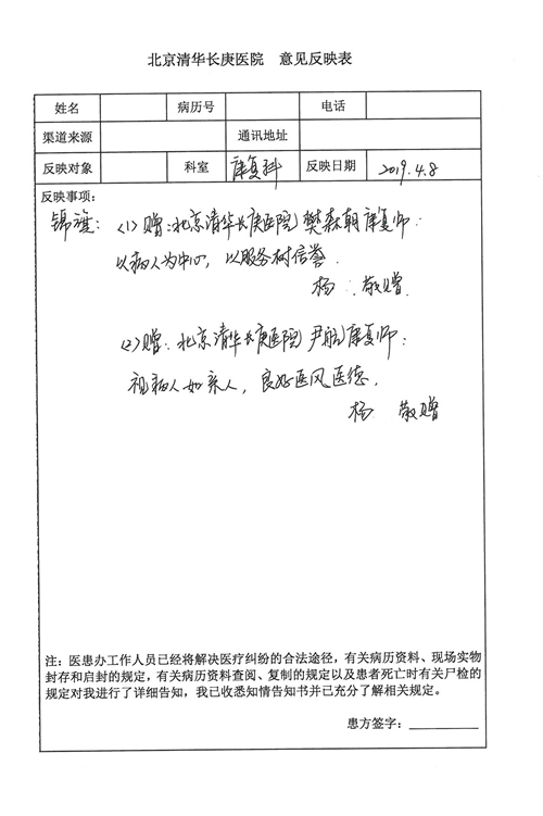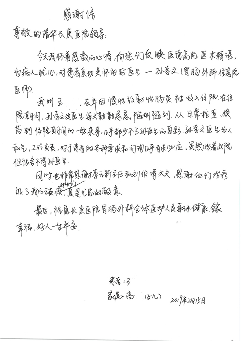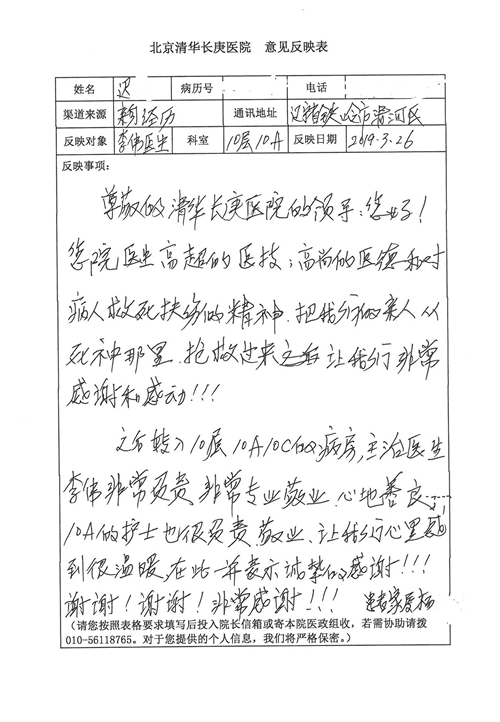 2019年4月,我院共接到患者及家属感谢信70封,其中肝胆胰外科董家鸿主任医师、卢倩副主任医师、汤睿主治医师,肝胆介入科张跃伟主任医师,肝胆内科黄缘主任医师、罗碧芬主治医师,肝胆胰中心陈虹主任医师、范铁艳副主任医师,神经外科李伟医师,神经内科付伟副主任医师、王也医生,普通外科白熠洲主治医师,胃肠外科李元新主任医师、王峰副主任医师、蔺宏伟副主任医师、张鹏主治医师、刘伯涛主治医师、孙孝文主治医师、赵宏伟主治医师、张骞主治医师,胸前外科陈东红副主任医师、杨帆主治医师,骨科顾苏熙主治医师、刘华玮主治医师,泌尿外科王强副主任医师、李建兴主任医师、肖博主治医师,心脏内科张萍主任医师、缪国斌主任医师、李艳芳主任医师、刘元伟副主任医师、佘飞副主任医师、薛亚军主治医师、周博达主治医师、谢颖主治医师、乔宇医师、周杰医师、赵兰婷医师、张瑞琪医师、李思源医师、张伟医师,心脏外科沈冬焱主任医师,呼吸与危重症医学科郭军副主任医师、蔡存良主治医师、赵景全主治医师、高博医师,张童医师、朱融融医师、王逸群医师、段瑶医师,消化内科蒋绚主任医师、唐红卫主任医师、相马宁主任医师、王佳主治医师、任渝棠主治医师、张瑞琪医师,内分泌与代谢科赵文惠副主任医师、曹沉香主治医师、冯雨桐医师,血液肿瘤科黄月华主治医师、钱坤医生、庄先静医生,康复医学科潘钰主任医师、樊森朝、尹航、苏胜民、杨绯、翟晓雪,眼科胡运韬主任医师、司山成主治医师,耳鼻咽喉头颈外科胡斌主治医师,急诊科王非主治医师、潘德星医生,放射治疗科郑卓肇主任医师,肾脏内科李月红主任医师,庄震副主任医师、李敏俠主治医师,麻醉科赵艳军主治医师、药剂科冯丽曼、孟慧杰,医事处谢晶文、邢彦京,医患办武丽,护理部方玲、赵雪莲、覃丽娜、王珍、阴晴、石慧、常丽莉、邵婷婷、姚惠云、高广英、吴文星、付伟、王也、武向兰、张冰、刘欣、栾逸群、纪晓欣、张丹丹、刘路、刘盼、王杰、杨玉琢、王文、张晶、卫莎、周浩、贺佳莹、钱月、陈梦琪、翟月星、张宏飞、张沙、高翔、孔宇佳、崔淑婷、刘杰、郭凯华、王朝群、孙姝研、吴春慧、宋华、陈佳、孟令威、刘杰、程书琪、张芳、郝建荣、杨敏、张璐、姚振云、于静、刘品钰、杜洪慧、林景熠、郑卓肇、李硕、赵素菁、李冬蓉、朱鸿飞、柯胜男、齐赛男、马小蓓、王英华、赵亚参、杨瑞、马海月、崔领玉、王翠萍、王翰婷、张伟、王爱华、吴琼、轩月婷、李娜、张璐、盖凯旋、马丽颖,5A全体医护人员,6B全体医护人员,9A全体护士们,10A全体医护人员,11B全体医护人员,内科全体医护人员,重症医学科全体医护人员消化内科全体医护人员,胃肠外科全体医护人员,心内科全体医护人员,急诊全体医护人员收到具名表扬。特此公告,以资鼓励!