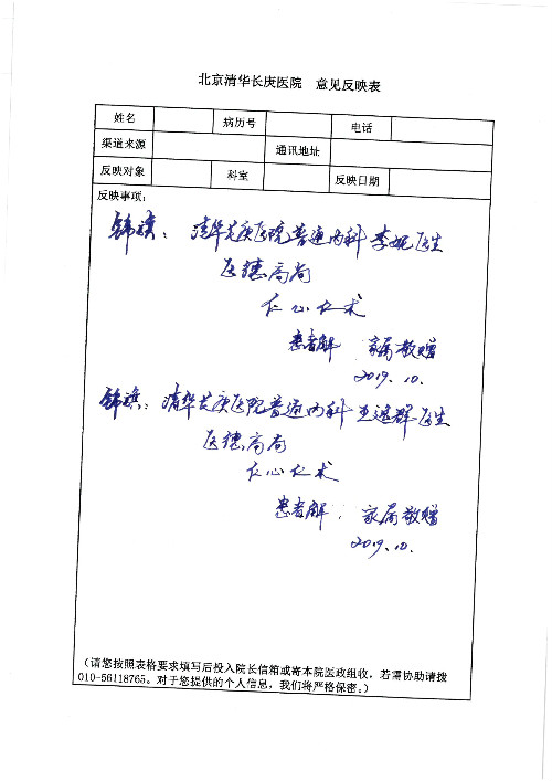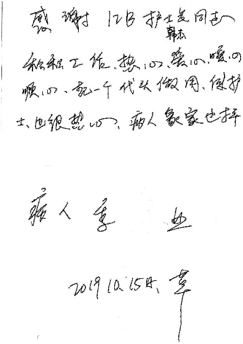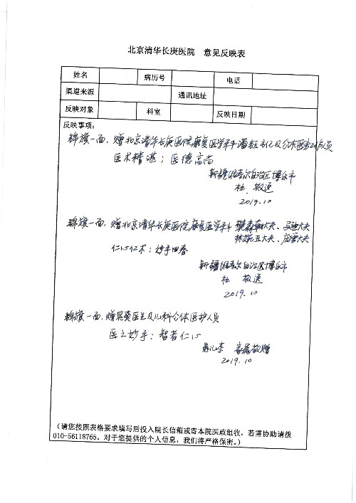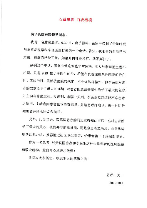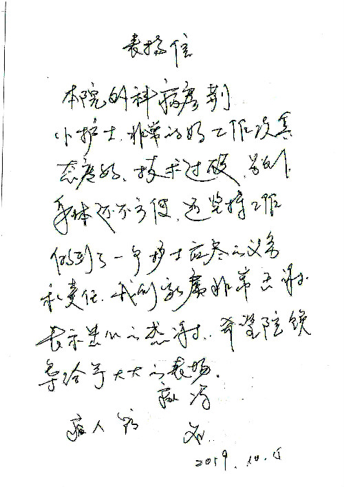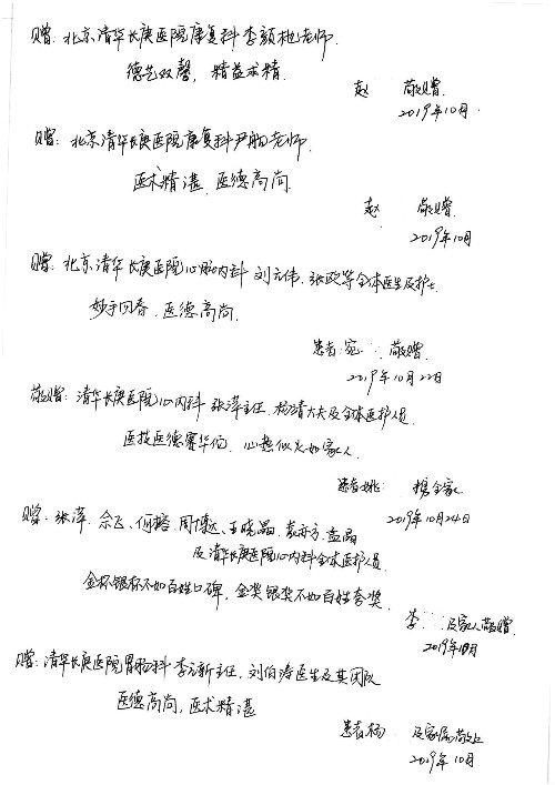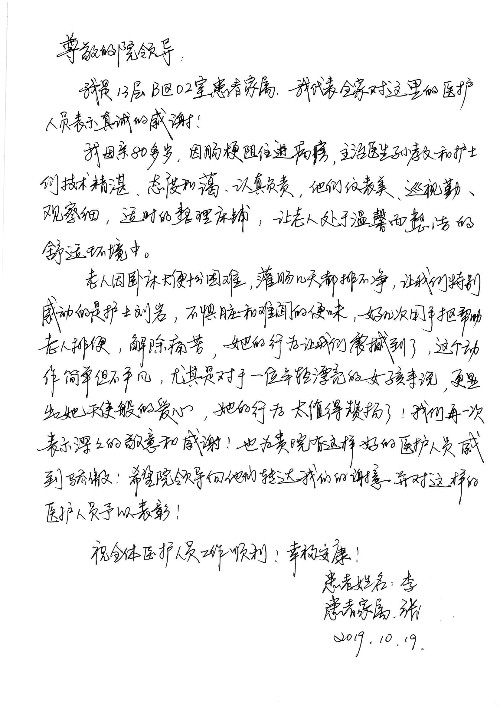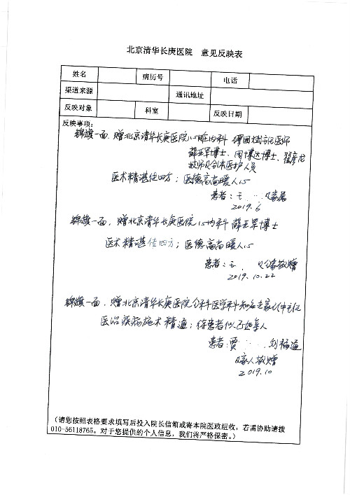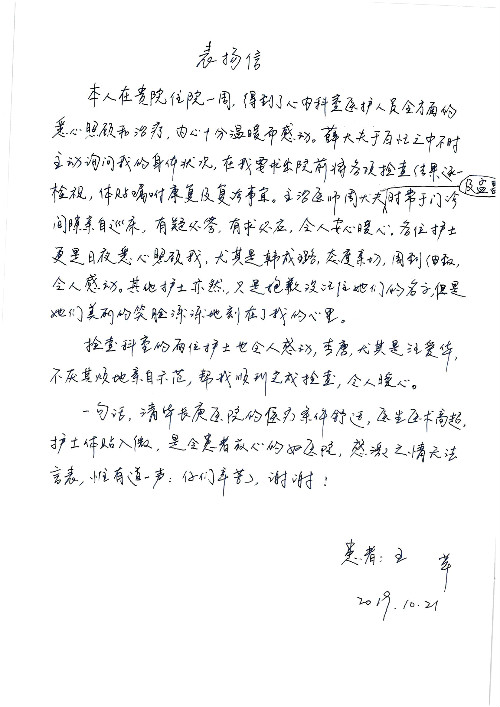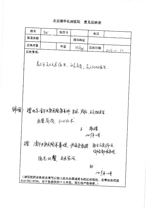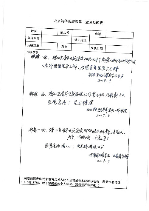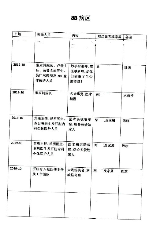 2019年10月,我院共接到患者及家属感谢信28封,锦旗33面,匾额2个,水晶奖杯1个;其中肝胆胰中心董家鸿主任医师、黄缘主任医师、张跃伟主任医师、卢倩副主任医师、徐光勋副主任医师、冯晓彬副主任医师、杨明副主任医师、汤睿主治医师、公磊主治医师、苏日嘎医师、谢思医师、吴广东医师、于里涵医师、刘江医师;耳鼻咽喉头颈外科叶京英主任医师、伊海金主任医师、郭斐斐医师、张云云医师;骨科顾苏熙主治医师、刘华玮主治医师;全科医学科王仲主任医师;神经内科赵蕾副主任医师、张小峰主治医师;普通外科罗斌主任医师;胃肠外科李元新主任医师、刘伯涛主治医师、孙孝文主治医师;泌尿外科李建兴主任医师;心脏内科张萍主任医师、缪国斌主任医师、佘飞副主任医师、刘元伟副主任医师、何榕副主任医师、薛亚军主治医师、周博达主治医师、张鸥医师、沈懿医师、杨靖医师、王晓晶医师、袁亦方医师、孟昌医师、翟彦龙技师、李唐技师;呼吸与危重症医学科李理医师;康复医学科潘钰主任医师、吴琼主治医师、杨绯医师、翟晓雪医师、冯雨桐医师、李颜杝治疗师、尹航技师、樊森朝技师、程丹丹技师、王文旭技师、马迪技师、林婉玉技师、庞雪技师、实习生:胡静、秦雨、王玉卿、李美娇,放射治疗科黎功主任医师;眼科郭立斌副主任医师、刘瑄副主任医师,消化内科李恕军主任医师、刘佳文主治医师,普通内科王逸群副主任医师、冯莉莉主治医师、李妮医师, 妇产科廖秦平主任医师、张蕾副主任医师、吕涛副主任医师、王晓茜主治医师、文佳医师、冯宗昊医师;儿科晁爽副主任医师,口腔科聂小汉主治医师、蒲媛护士,中医科赵佳技师,内分泌科赵文惠副主任医师;医患办赵晓兰,医事处杨新蕊、范佳伟,护理部:韩成璐、汪爱华、朱洁、李雪菊、肖江彬、韩杰、荆红英、张伟、吴璠、辛铜,肝胆胰中心全体医护人员、急诊全体医护人员、神经内科全体医护人员、心脏内科全体医护人员、普通外科全体医护人员、耳鼻咽喉头颈外科全体医护人员、儿科全体医护人员、妇产科全体医护人员、康复医学科全体医护人员、13A全体护理人员收到具名表扬。特此公告,以资鼓励!