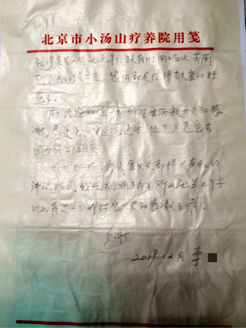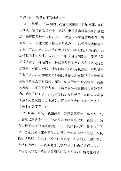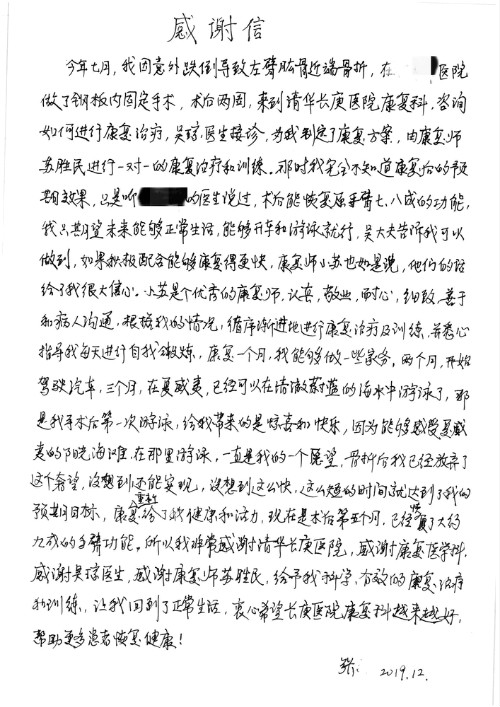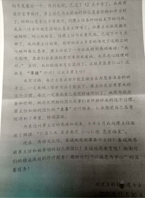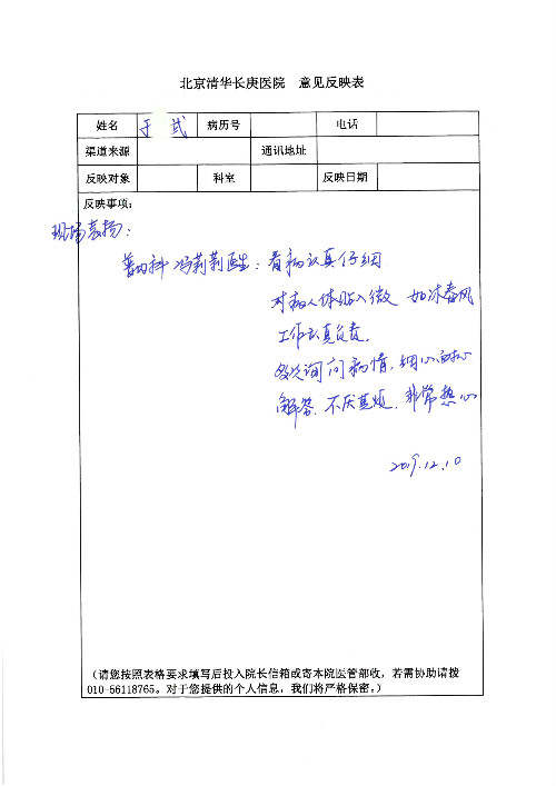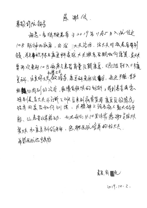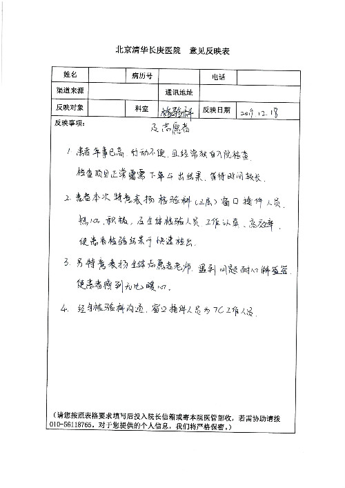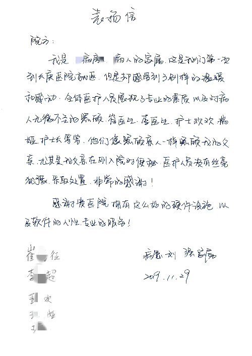 2019年12月,我院共接到患者及家属感谢信64封,锦旗32面,匾额1个,现场表扬4次;其中医院党委周月红书记;肝胆胰中心董家鸿主任医师、项灿宏主任医师、张跃伟主任医师、卢倩副主任医师、孙百军主任医师、徐光勋副主任医师、王良主治医师、曾建平主治医师、公磊主治医师、刘影医师、吴广东医师、周虎医师、黄鑫医师、金烁医师、王文然医师、赵国静医师、王尧医师、周新红医师、张琪佳医师;神经内科武剑主任医师、黄光主任医师、付伟副主任医师、张菁副主任医师、黄丽主治医师、沈懿医师、杨骊鹏;神经外科王贵怀主任医师;普通内科冯莉莉主治医师;普通外科罗斌主任医师、白熠洲主治医师;心脏内科张萍主任医师、缪国斌主任医师、李艳芳主任医师、何榕副主任医师、薛亚军主治医师、谢颖主治医师、周博达主治医师、周杰医师、袁亦方医师、张鸥医师、刘金哲医师、翟彦龙技师;心脏外科沈冬焱副主任医师、崔晓征主治医师、李永超医师;骨科潘勇卫主任医师、蔡谞主任医师、宋飞副主任医师;胃肠外科李元新主任医师、王峰副主任医师、刘伯涛主治医师、张鹏主治医师、张骞主治医师、张骞医师;胸腔外科陈东红主任医师、杨帆主治医师、朱伟鹏医师;康复医学科潘钰主任医师、李欣主治医师、吴琼主治医师、徐泉主治医师、翟晓雪医师、樊森朝技师、苏胜民技师、尹航技师、李平技师;耳鼻咽喉头颈外科叶京英主任医师;眼科乔荣华副主任医师、司山成主治医师、郭立斌医师;口腔科张雪梅主治医师;妇产科廖秦平主任医师;儿科季丽娜主任医师;呼吸内科牟向东主任医师、郭军副主任医师、赵景全主治医师;消化内科蒋绚主任医师、任渝棠主治医师、周智勇医师;内分泌科金丽霞主治医师;血液肿瘤科李昕权主任医师、于卓副主任医师;皮肤科蒋源副主任医师、陈典主治医师、张竹影医师;全科医学科王仲主任医师、邹晓昭医师、严楠医师、杜丽雪医师;药剂科王兰药剂师;医事处住院中心全体工作人员、TC人员(总务、检验科);护理部:任丽琪、张金鹏、徐洁、毕书娇、赵春梅、张冰(11A)、文坤、史金凤(11A)、林景熠、薄燕娜、曲珊珊、唐建建、张晓晶,张雪芹、赵雪莲、张晓晶、刘灿、尚亚楠、丁杰、陈雅丽、曹静萍、曹莉萍、蔡敏丽、张雅绯、刘子霞、吴雪洁、李惠惠、李晶晶、高飞、于小梅、刘侠、秦蒙蒙、邓玲、王莹、刘帅、刘灿、徐佳佳、贾波、樊杰、严哲、袁雯丽、孙越、常秀、张小蒙、王宇、王瑞娅、张楠、王梦欢、黄梅苓、颜紫薇、石晓丹、管琪、王凯歌、甄姣、张坤,以及肝胆胰中心全体医护人员、血管外科全体医护人员、神经外科全体医护人员、普通外科全体医护人员、胃肠外科全体医护人员、心脏内科全体医护人员、消化内科全体医护人员、皮肤科全体医护人员、检验科全体医护人员、日间病房全体医护人员、急诊全体医护人员、社会服务科志愿者收到具名表扬。
