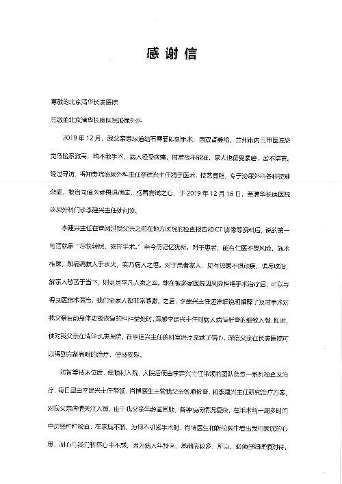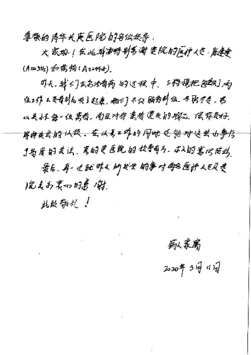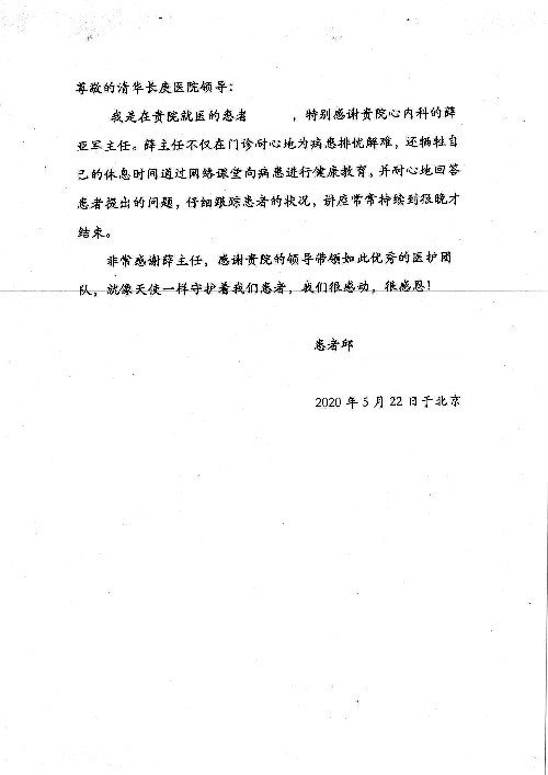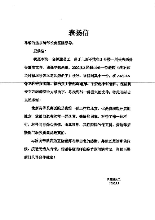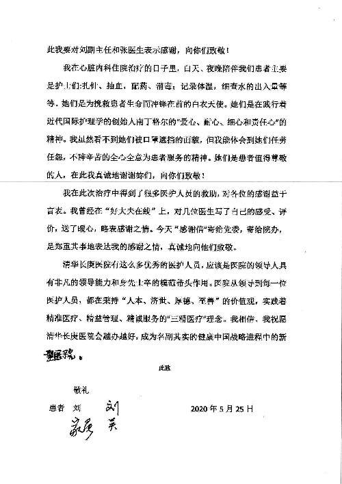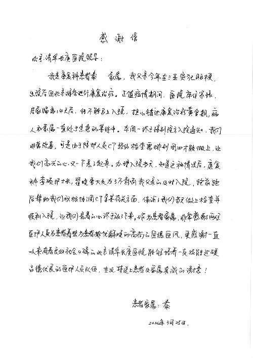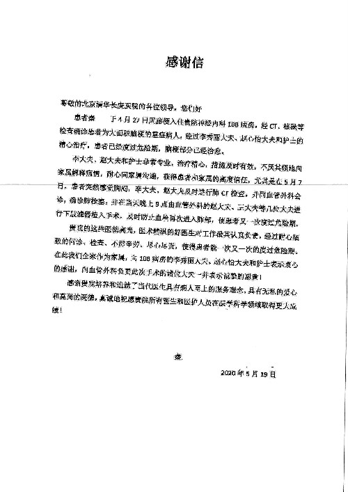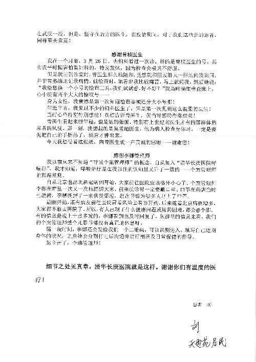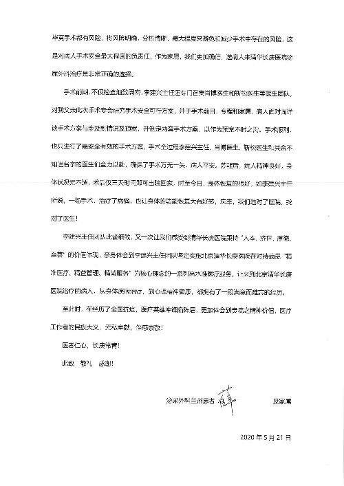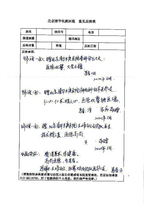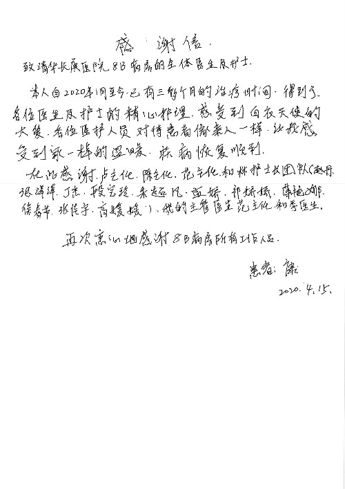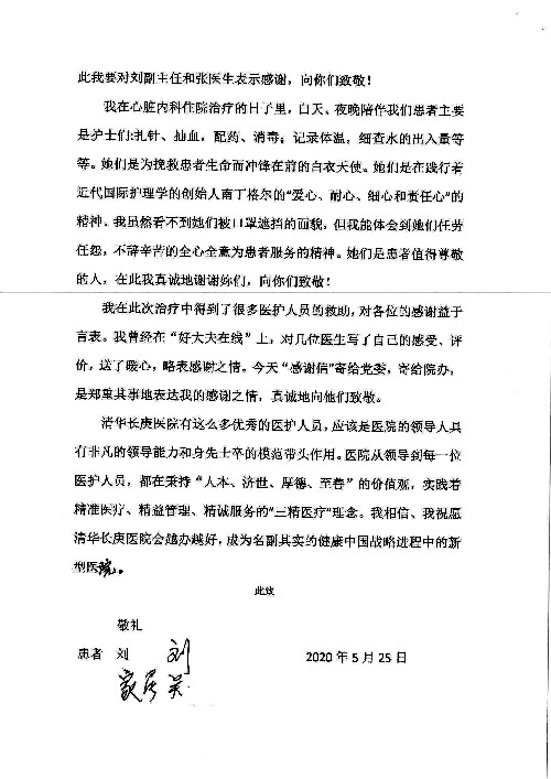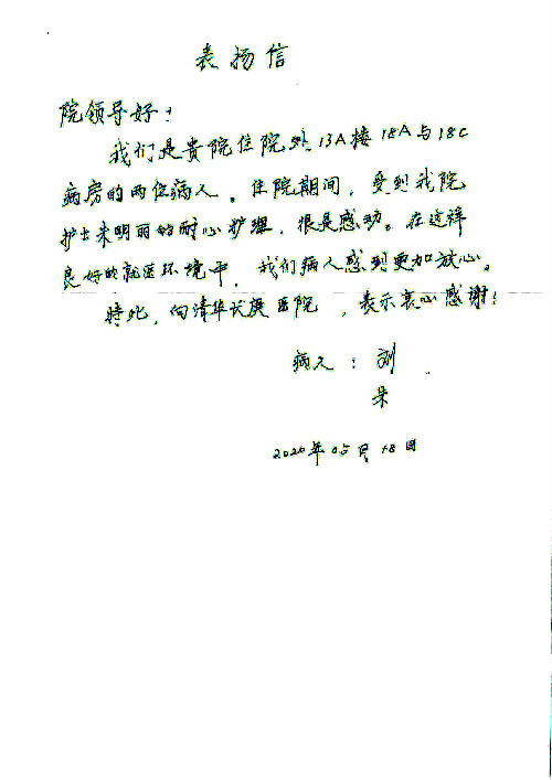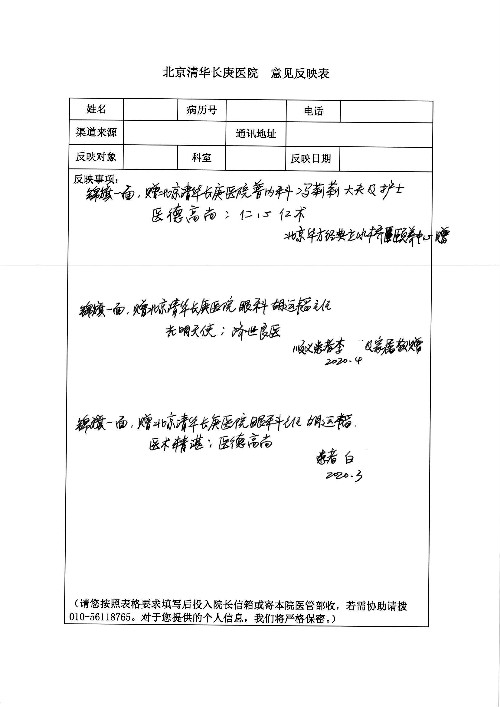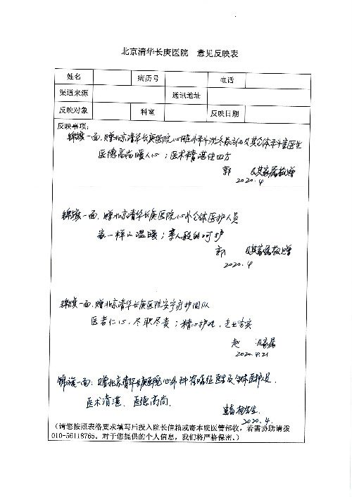 公告北京清华长庚医院患者及家属感谢信【2020年4-5月份】