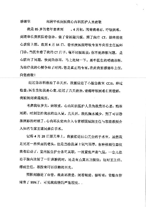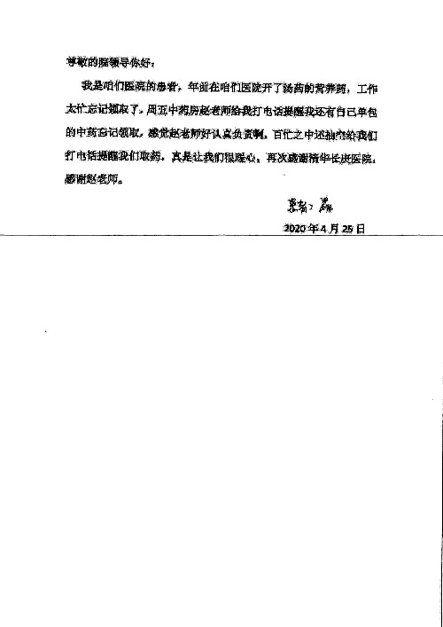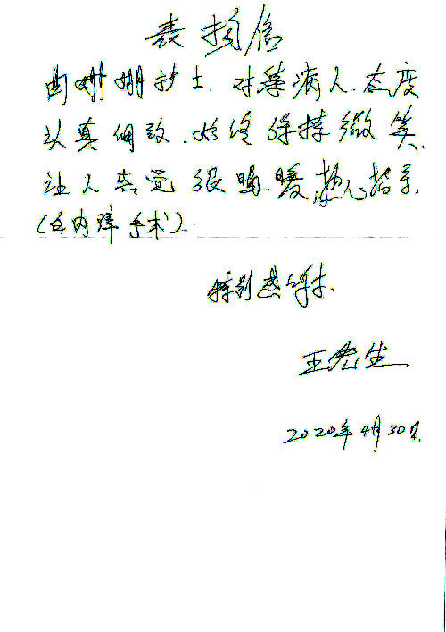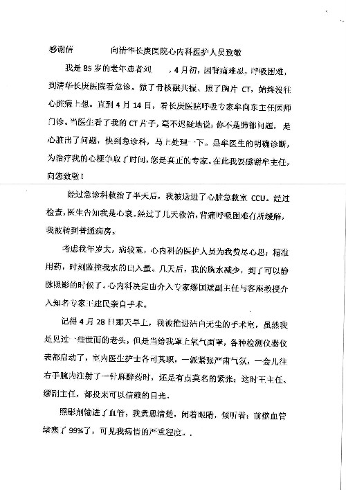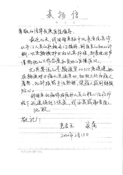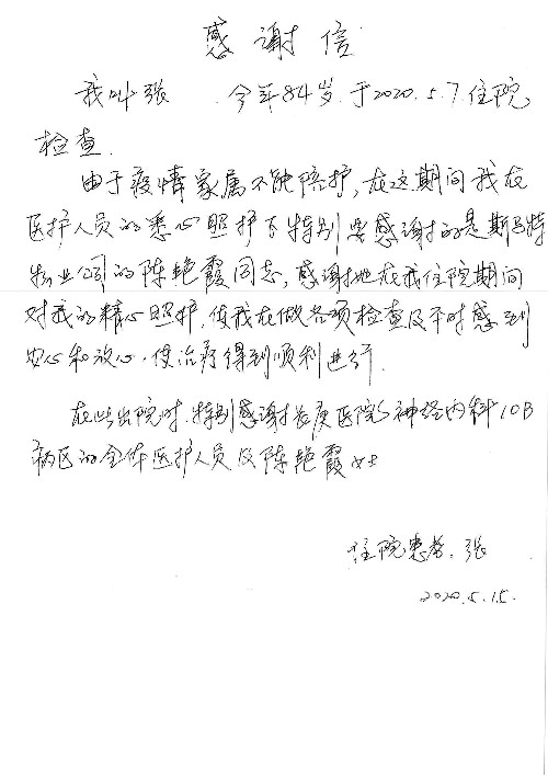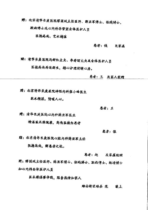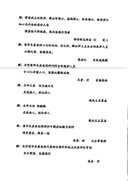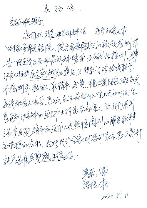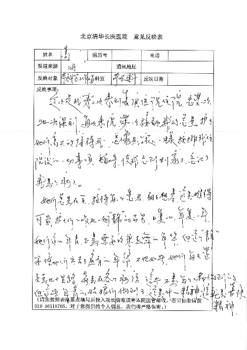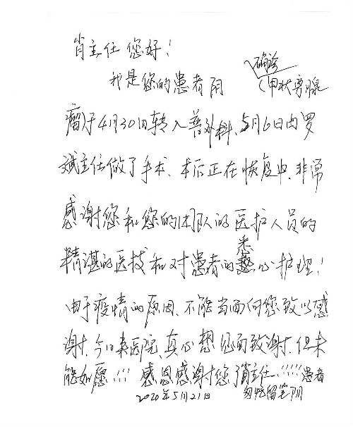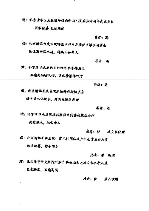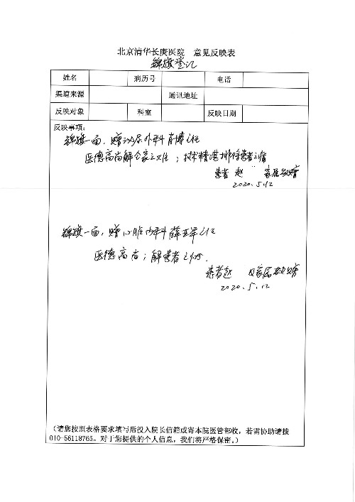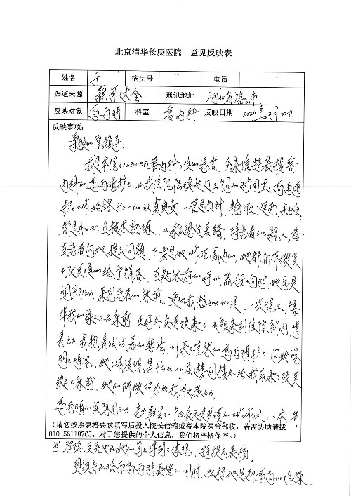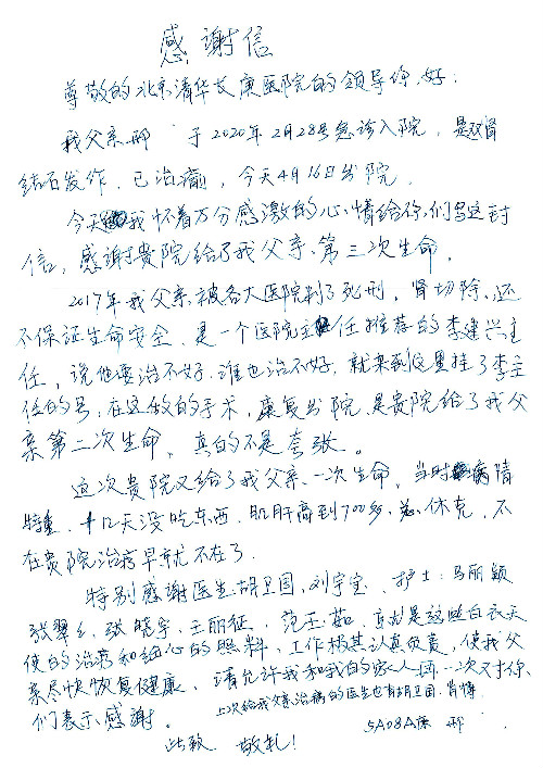 公告北京清华长庚医院患者及家属感谢信【2020年4-5月份】