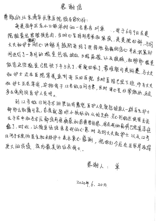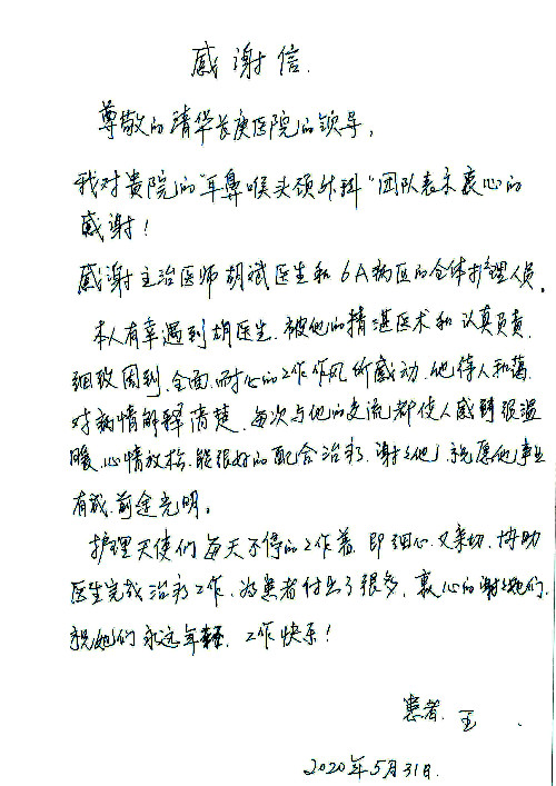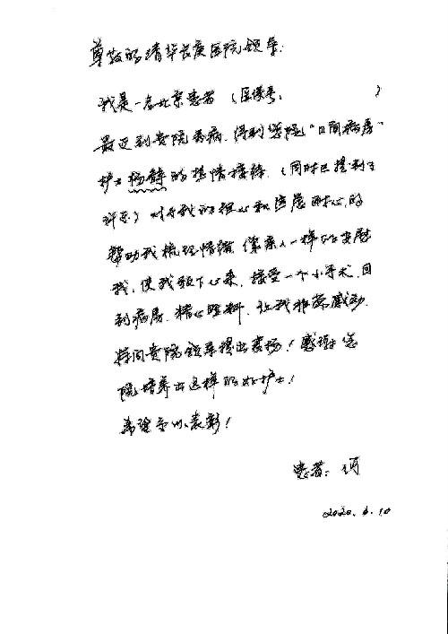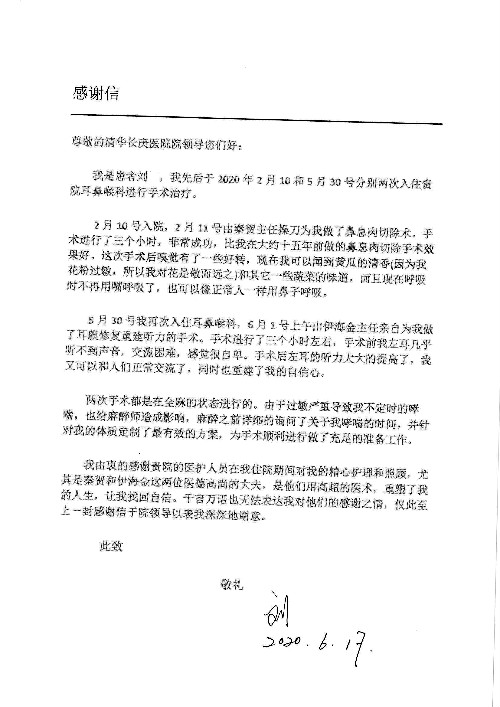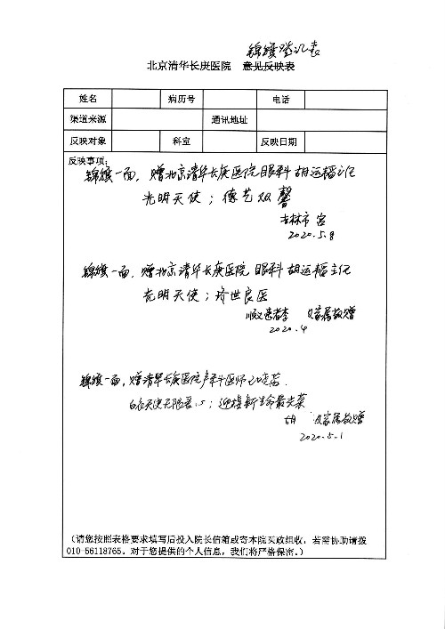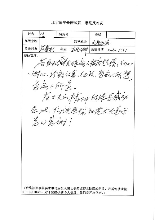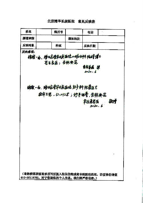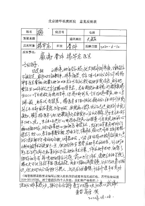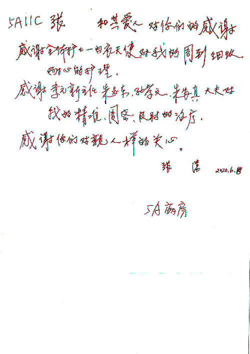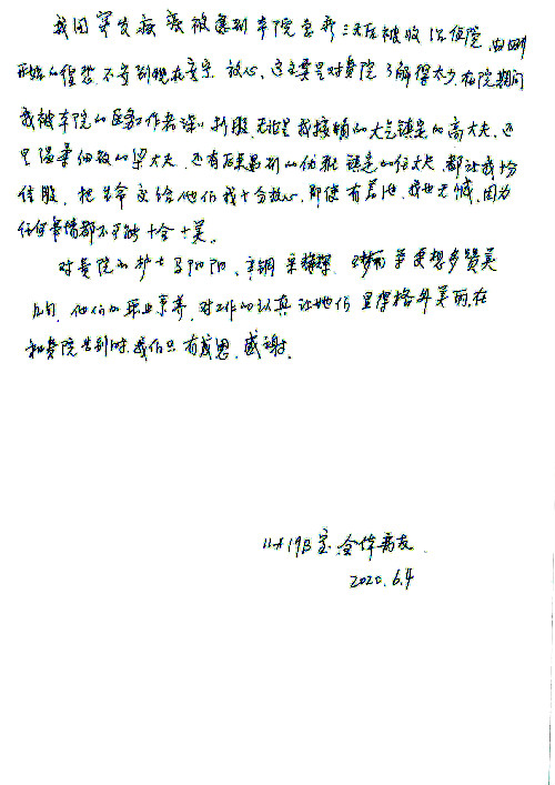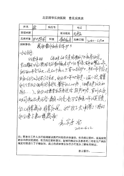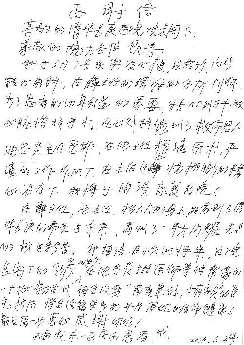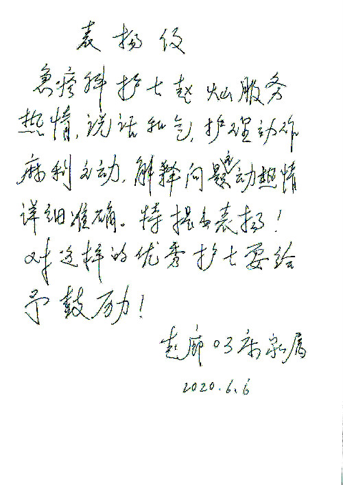2020年6月,我院共接到患者及家属感谢信29封,锦旗18面,其他形式表扬4个;其中心脏内科缪国斌主任医师、薛亚军副主任医师、周博达主治医师、张鸥主治医师、向伟主治医师、耿雨医师、杨靖医师;心脏外科沈冬焱副主任医师、杨栩鹏医师;胸腔外科陈东红主任医师、朱伟鹏主治医师、曹加顺主治医师、李子澎医师;胃肠外科李元新主任医师、王峰副主任医师、朱志东副主任医师、孙孝文主治医师、庄卓男医师、朱长真医师;消化内科任渝棠副主任医师;肾脏内科李月红主任医师、李敏侠主治医师;呼吸及危重症科赵景全主治医师;骨科宋杨华东主治医师、王振医师;神经内科冯新红副主任医师;妇产科马珂副主任医师、张蕾副主任医师、王晓茜主治医师;急诊科范春杨医师;耳鼻咽喉头颈外科伊海金主任医师、秦贺副主任医师、胡斌医师;眼科胡运韬主任医师;血液肿瘤科于卓副主任医师;医事处宋飞飞;护理部:李童、任野、李文静、杨静、范佳慧、石晓丹、王瑞娅、樊景春、马阳阳、辛铜、宋辉辉、王梦丽、赵灿、张惠文、蔡娟、许乐、;胃肠外科全体医护人员、心脏内科全体医护人员、神经内科全体医护人员、消化内科全体医护人员、妇产科全体医护人员、急诊科全体医护人员、骨科全体医护人员、日间病房全体医护人员、耳鼻咽喉头颈外科全体医护人员、保卫处全体工作人员收到具名表扬。
