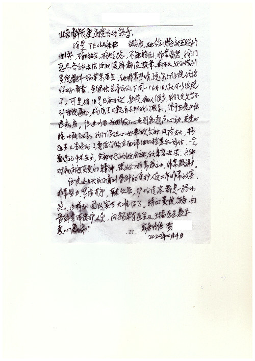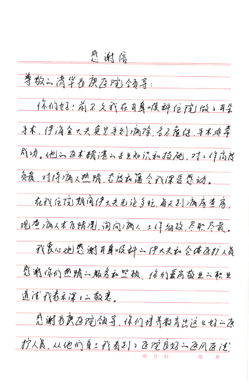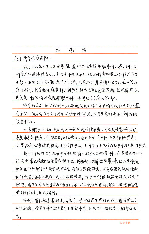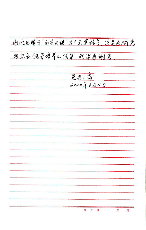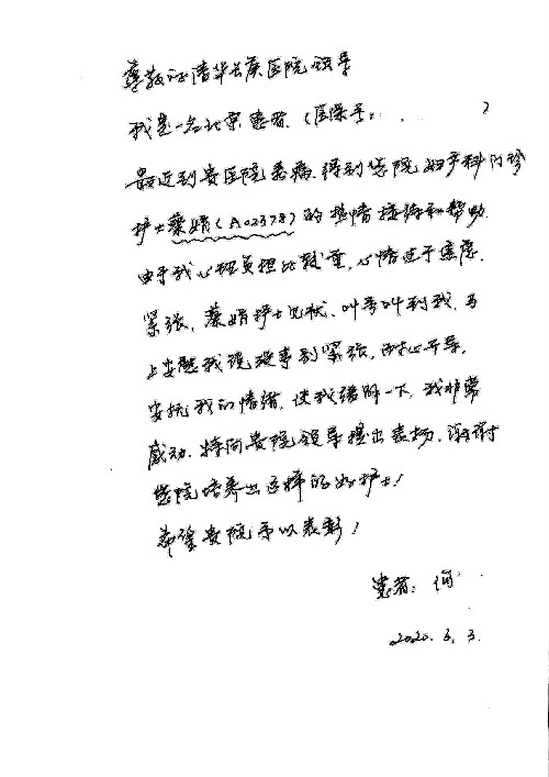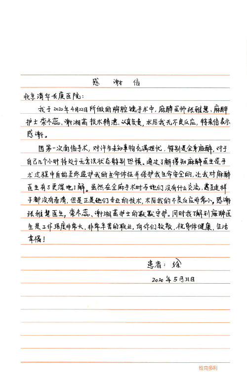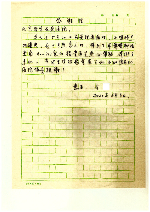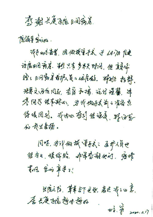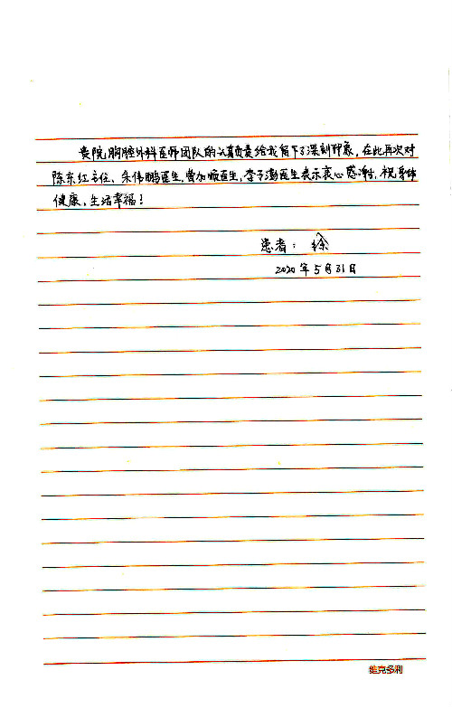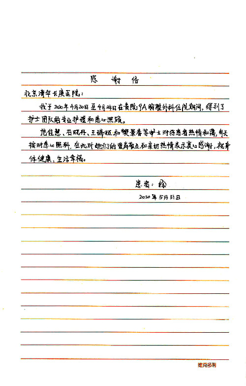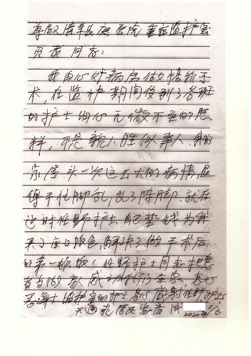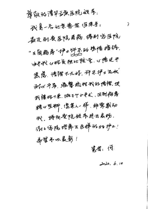2020年6月,我院共接到患者及家属感谢信29封,锦旗18面,其他形式表扬4个;其中心脏内科缪国斌主任医师、薛亚军副主任医师、周博达主治医师、张鸥主治医师、向伟主治医师、耿雨医师、杨靖医师;心脏外科沈冬焱副主任医师、杨栩鹏医师;胸腔外科陈东红主任医师、朱伟鹏主治医师、曹加顺主治医师、李子澎医师;胃肠外科李元新主任医师、王峰副主任医师、朱志东副主任医师、孙孝文主治医师、庄卓男医师、朱长真医师;消化内科任渝棠副主任医师;肾脏内科李月红主任医师、李敏侠主治医师;呼吸及危重症科赵景全主治医师;骨科宋杨华东主治医师、王振医师;神经内科冯新红副主任医师;妇产科马珂副主任医师、张蕾副主任医师、王晓茜主治医师;急诊科范春杨医师;耳鼻咽喉头颈外科伊海金主任医师、秦贺副主任医师、胡斌医师;眼科胡运韬主任医师;血液肿瘤科于卓副主任医师;医事处宋飞飞;护理部:李童、任野、李文静、杨静、范佳慧、石晓丹、王瑞娅、樊景春、马阳阳、辛铜、宋辉辉、王梦丽、赵灿、张惠文、蔡娟、许乐、;胃肠外科全体医护人员、心脏内科全体医护人员、神经内科全体医护人员、消化内科全体医护人员、妇产科全体医护人员、急诊科全体医护人员、骨科全体医护人员、日间病房全体医护人员、耳鼻咽喉头颈外科全体医护人员、保卫处全体工作人员收到具名表扬。